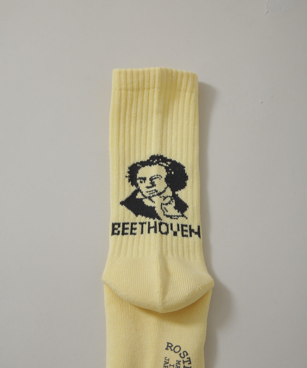後ろにベートーベンがデザインされた遊び心のあるソックス。コーディネートのアクセントになるデザインが魅力のアイテムです。