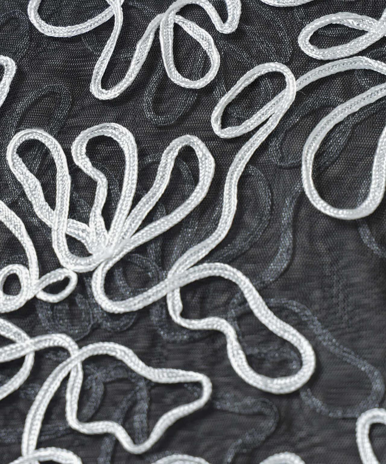 ・シャイニーなレーヨンテープを使って、マシーンで施された有機的な刺しゅうモチーフ