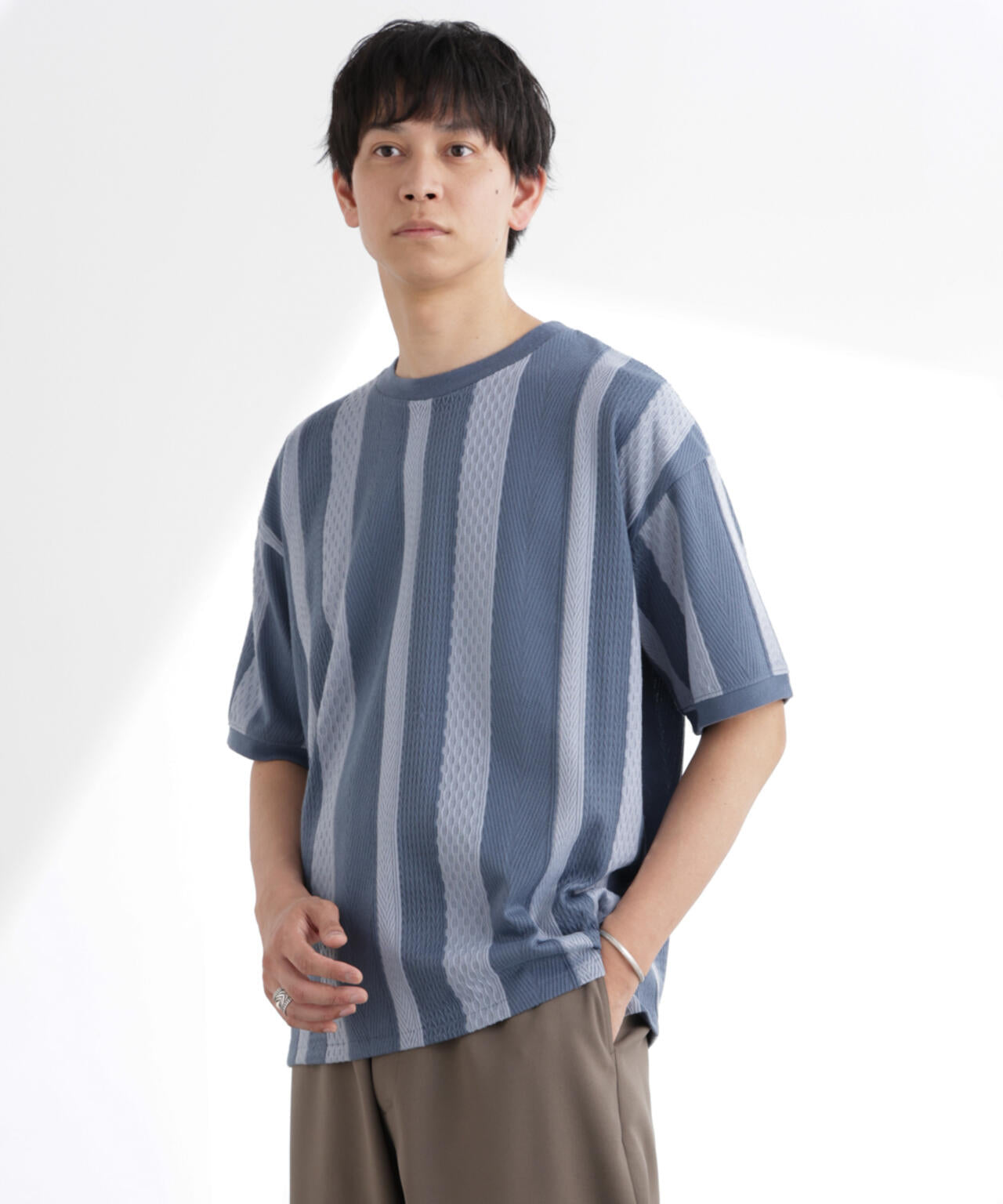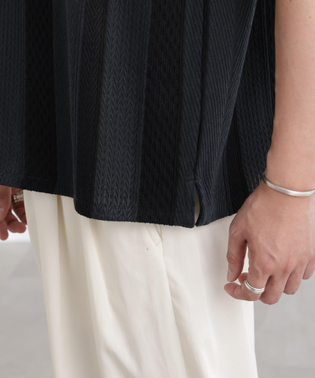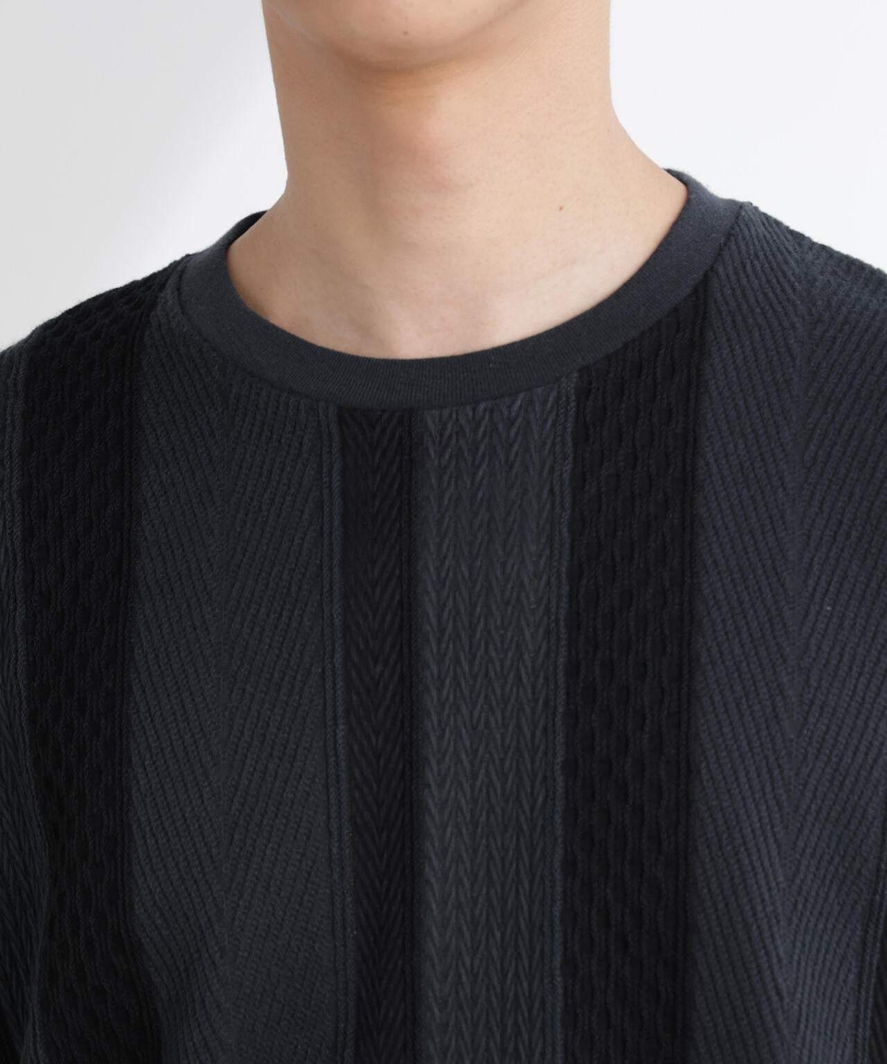 凹凸感のある立体的な編柄が特徴の1着。同トーンで構成した統一感のあるアイテム。