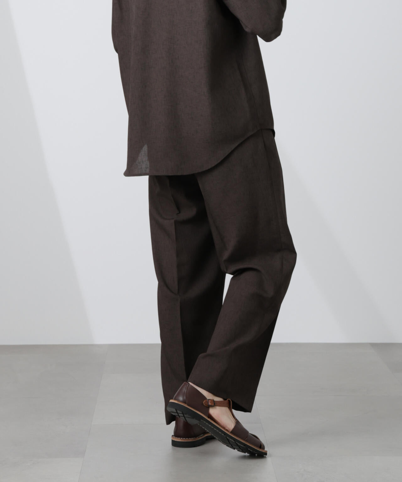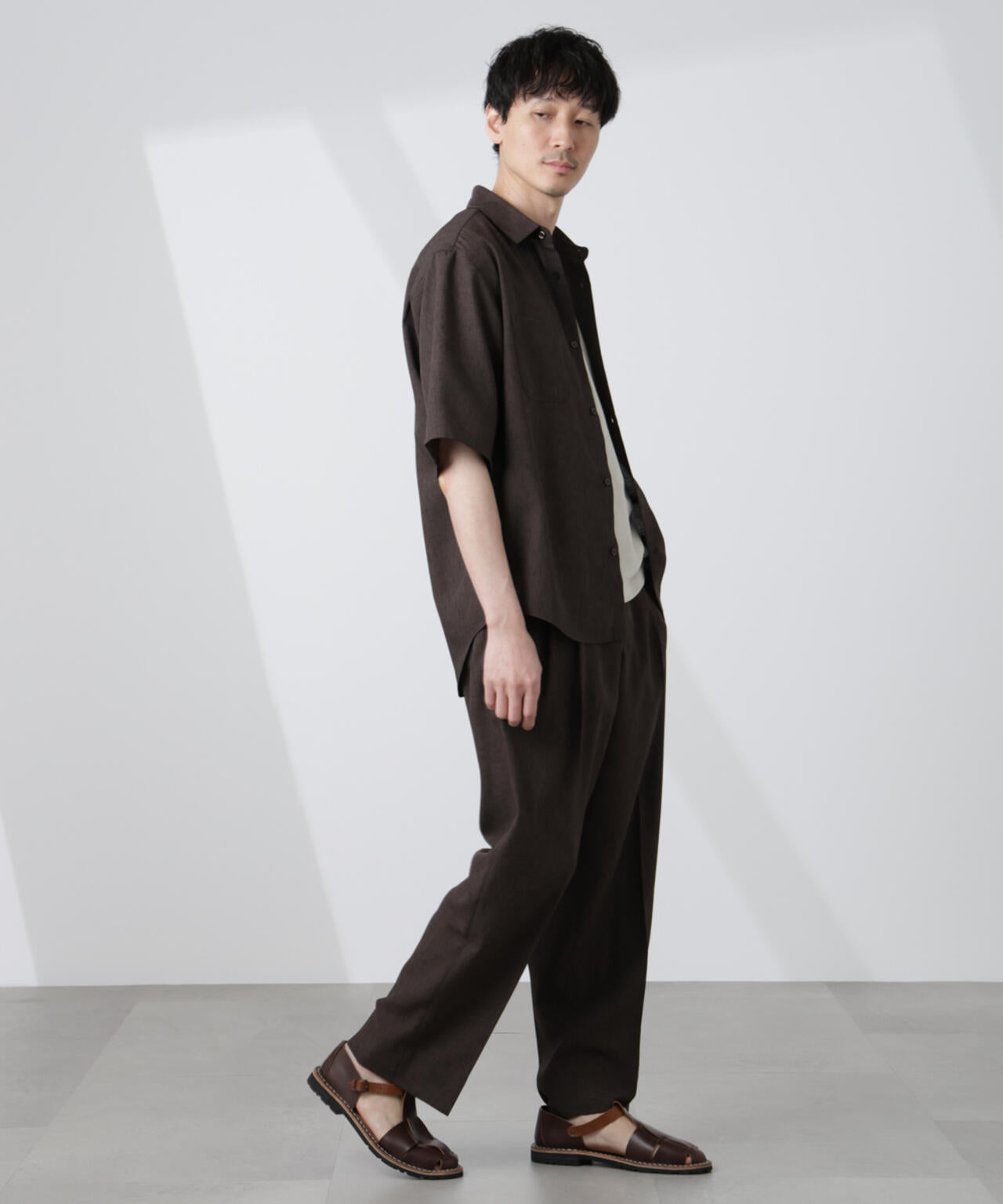 リネンライクな風合いが柔らかな印象を与える1着