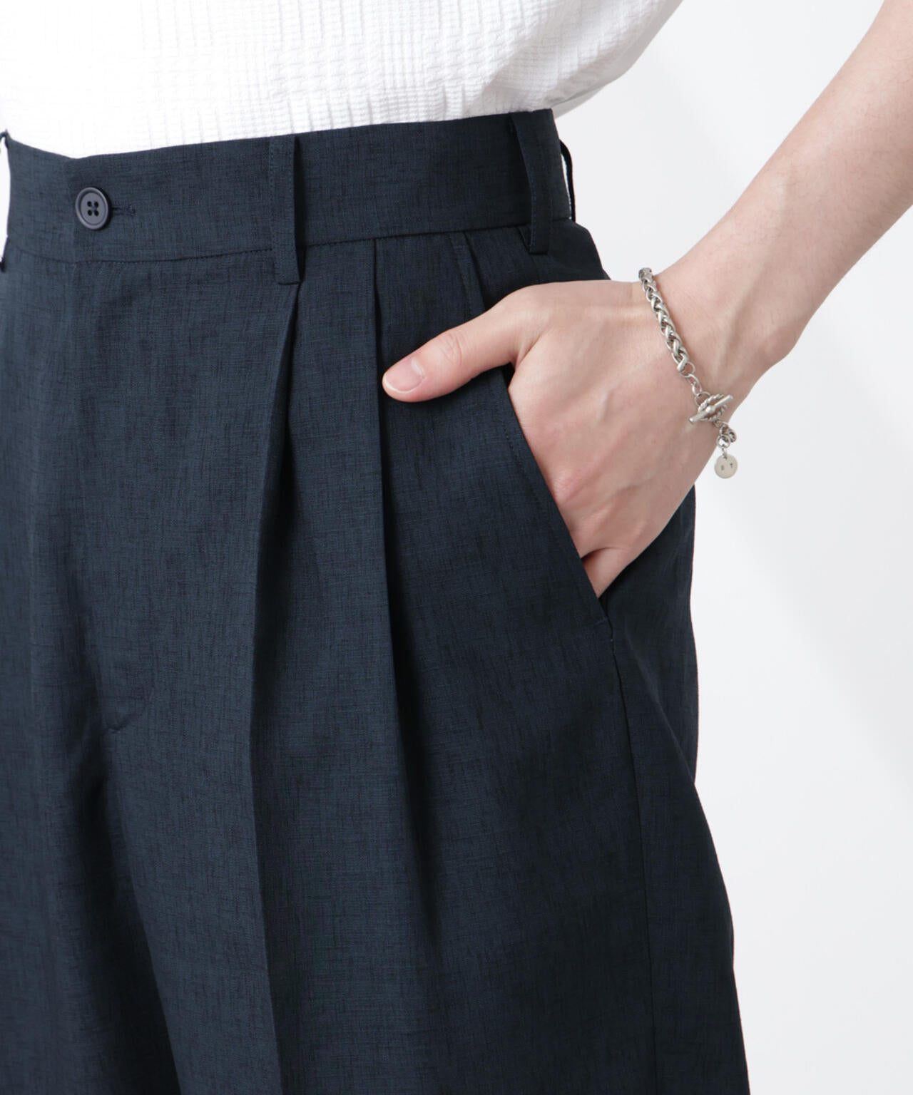 肌離れの良さと乾きやすい仕様が、夏にうれしいポイントのタックテーパードパンツ。ナノ・ユニバース定番シリーズから登場したおすすめの1着です。