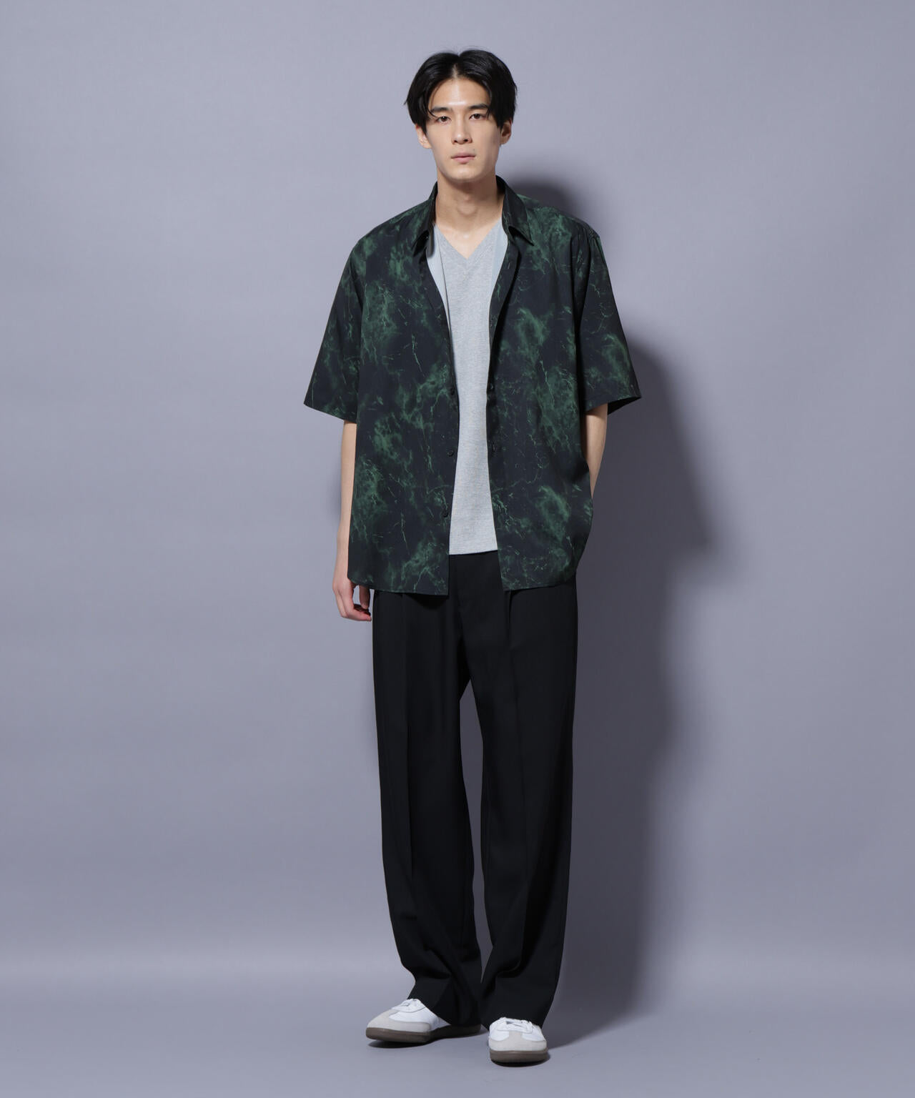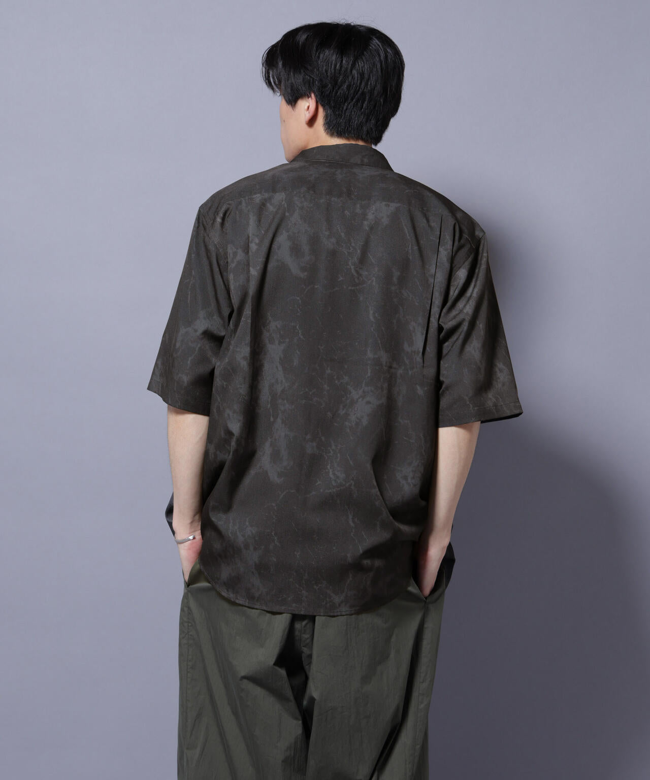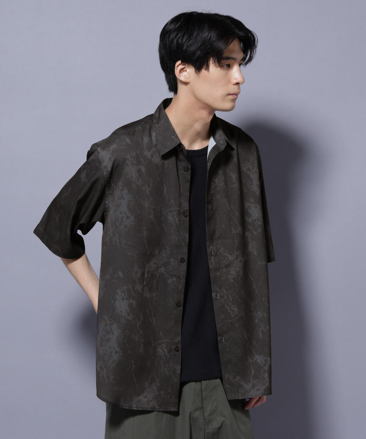 天然石の表面をイメージしたオリジナルパターンシャツ。シックな配色が大人のカジュアルスタイルにマッチします。程よい生地感でさらっと着られる、落ち感のある夏らしい一枚です。
