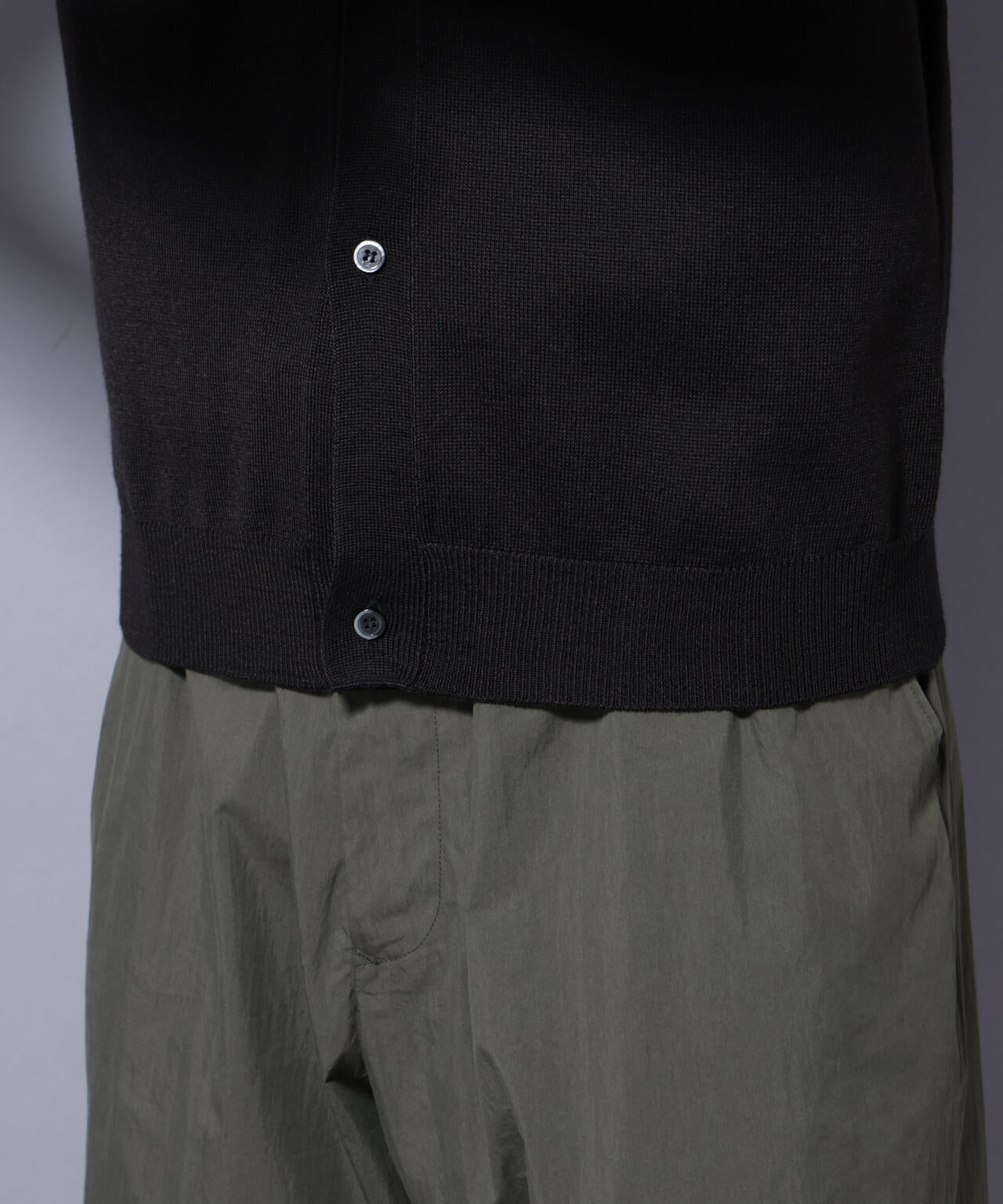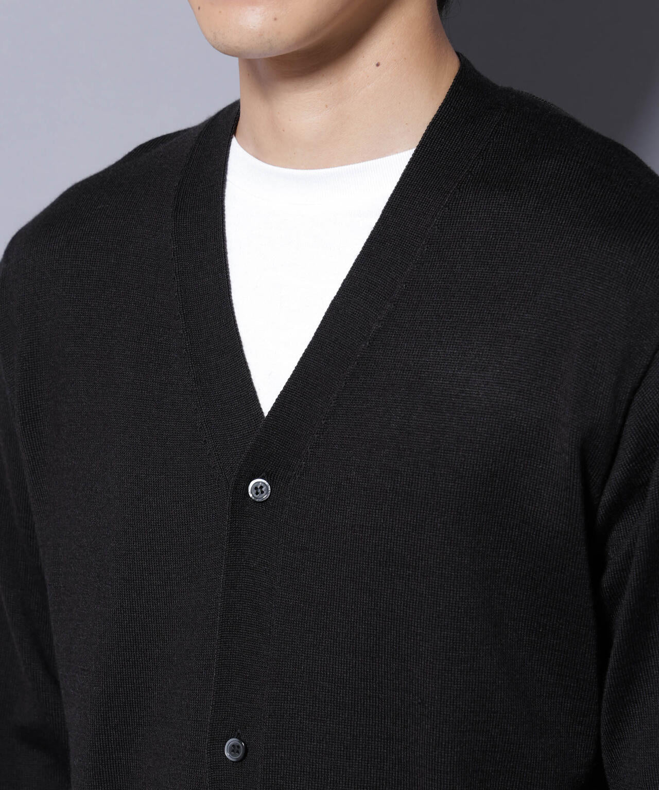 希少なウールを使用した、ナノ定番のニットカーディガン。スーツのインナーやビジネスシーンなどでも使いやすい細身のシルエットが特徴。端境期から冬の寒い時期まで活躍する、一枚は持っておきたいアイテムです。