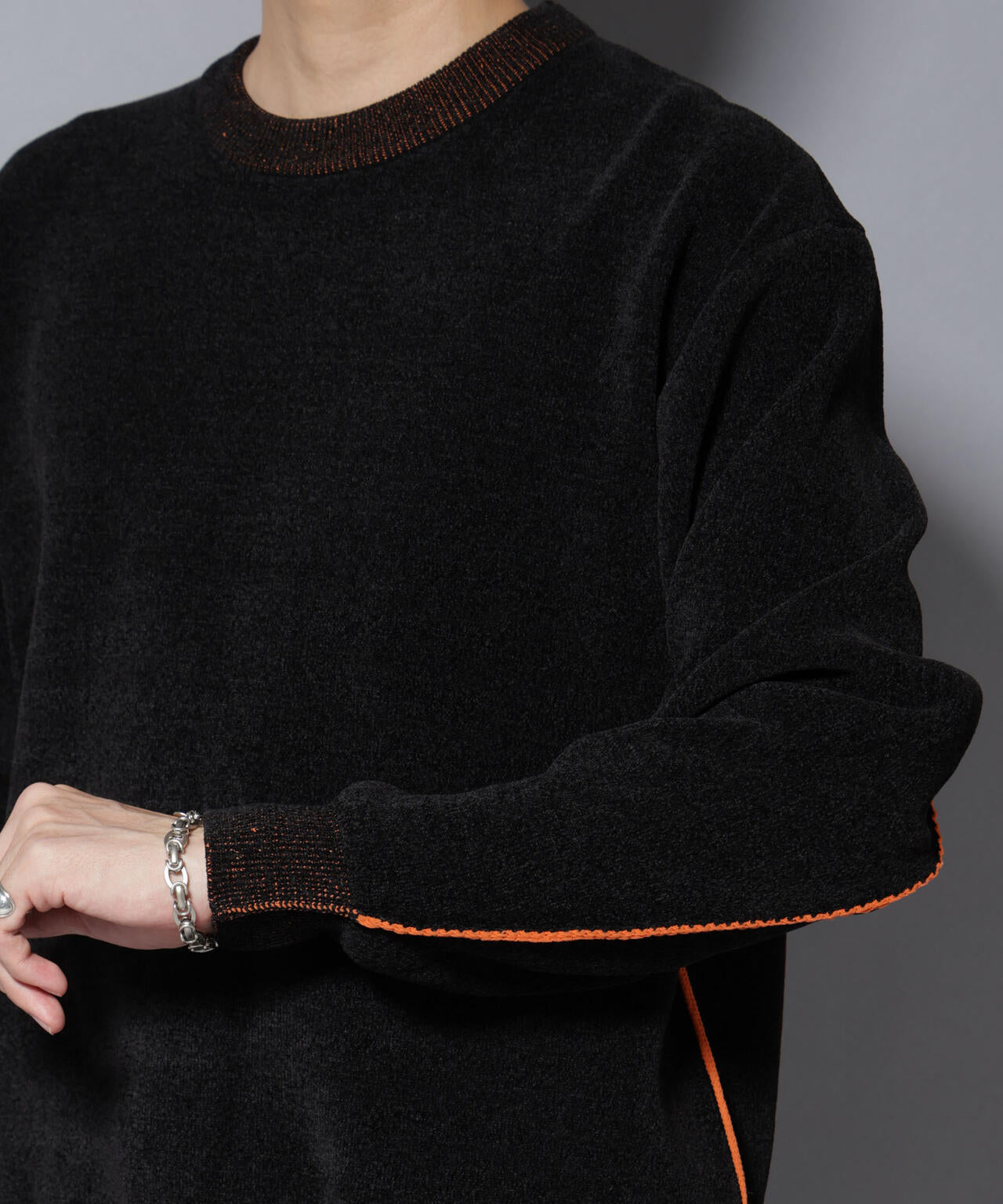 ウォーム感のあるモールヤーンを使用したクルーネックニット。裏糸にはポリエステルの糸を使用した組織で編みたてた一枚で、表と裏で2色使われた配色が面白いアイテムです。