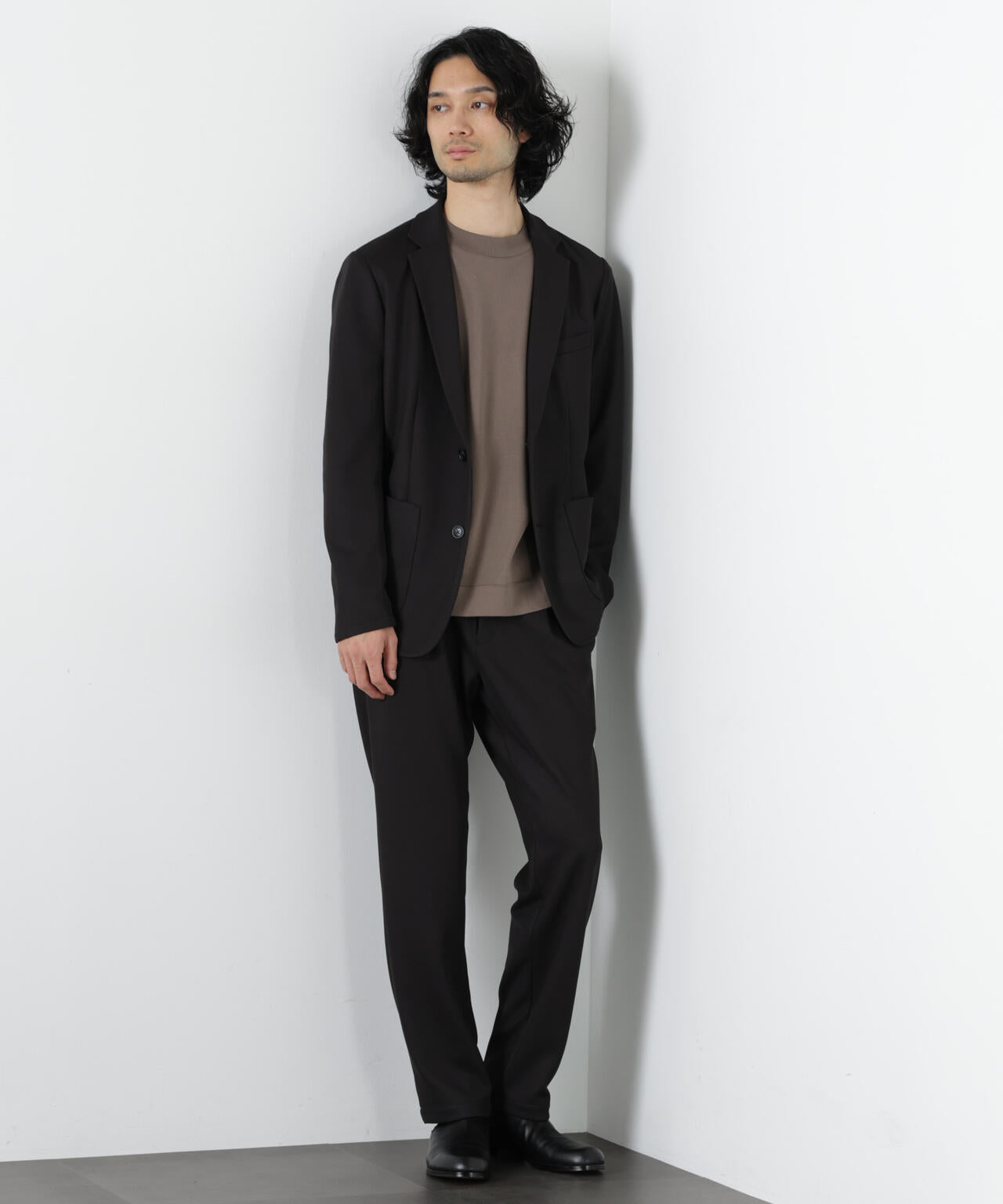 軽量なカノコ素材と薄手のストレッチ素材をボンディング加工で組み合わせた、立体感とハリ感が特徴のセットアップ。柔らかな着心地ながらシルエットを美しく保ち、長時間の着用でもストレスを感じにくいのがポイント。