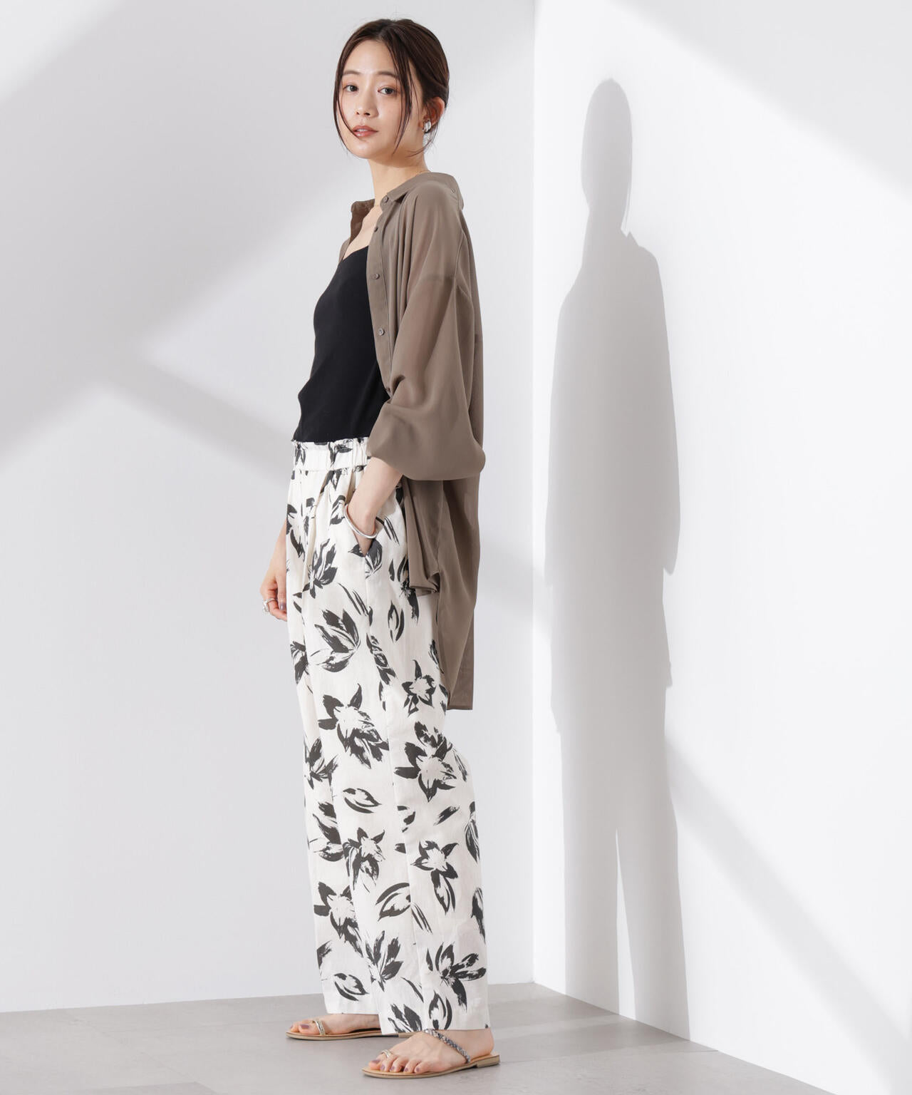 ・総柄のロングパンツ×タンクトップにゆるっと羽織る着こなしもおすすめ