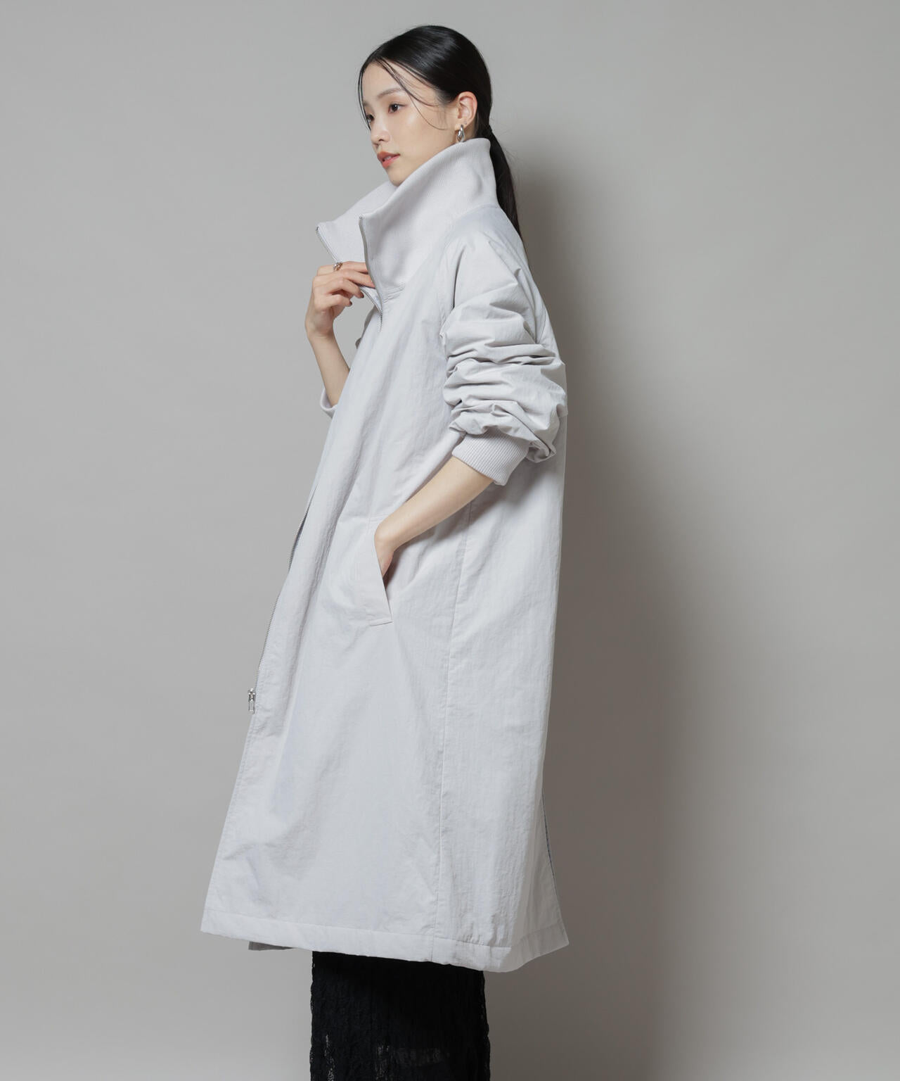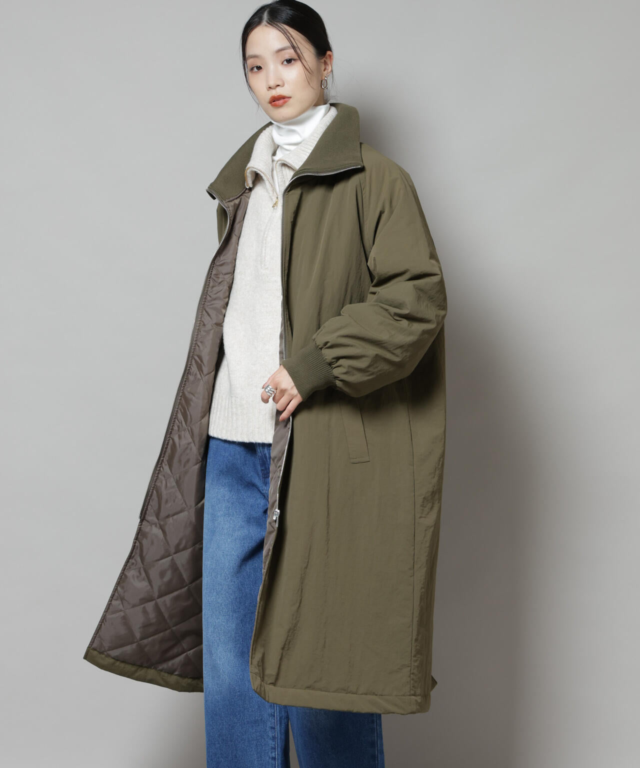 スタンドカラーのリブがトレンドを感じさせ、今っぽい雰囲気になるロングコート