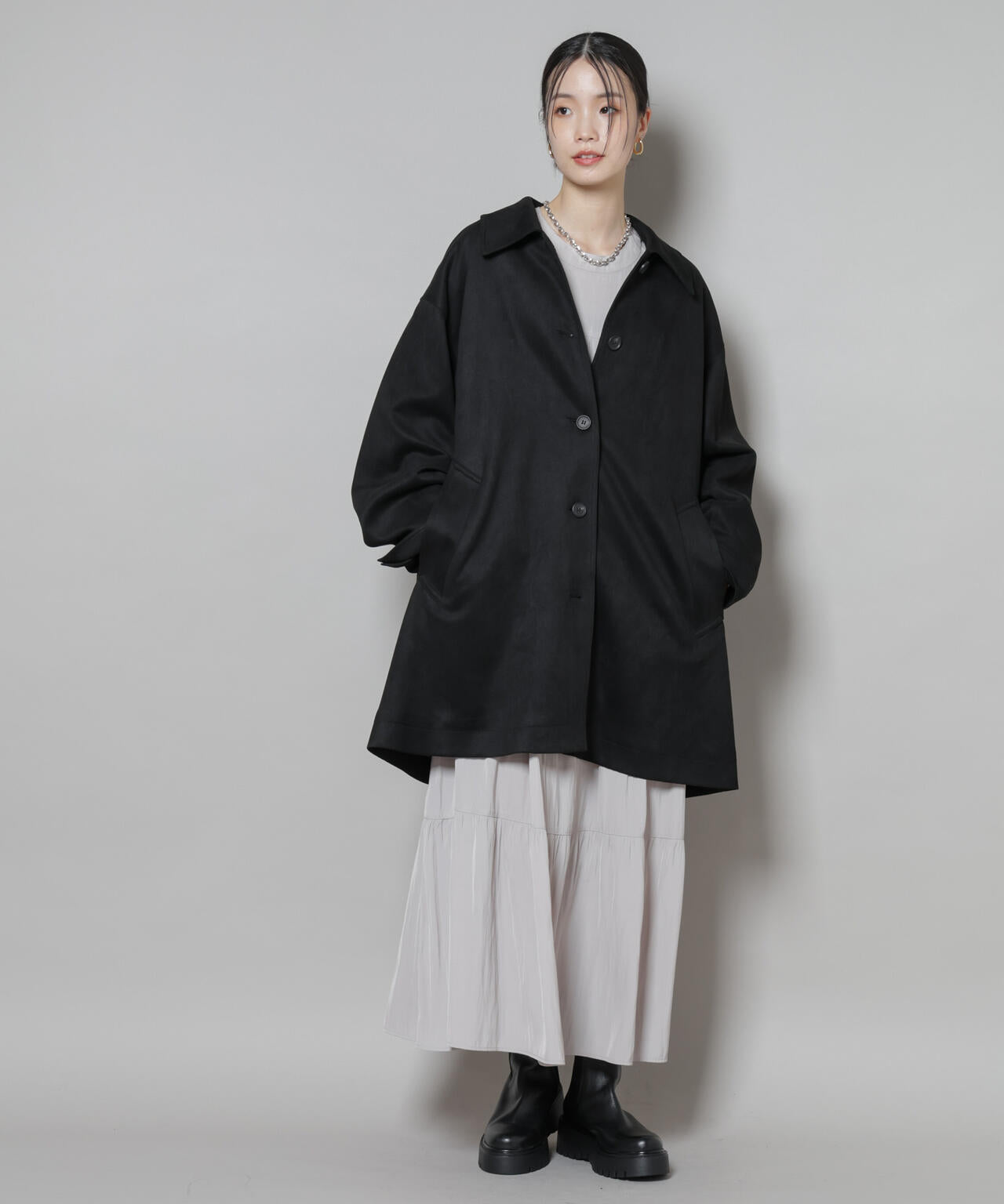 柔らかい肌触りのフェイクスエードを使用したミドル丈コート。ゆったりとしたサイズ感のAラインシルエットでバサッと羽織りやすく、裏地付きのストレスフリーな着心地も魅力。秋冬のワードローブに追加しておくと重宝する一着です。