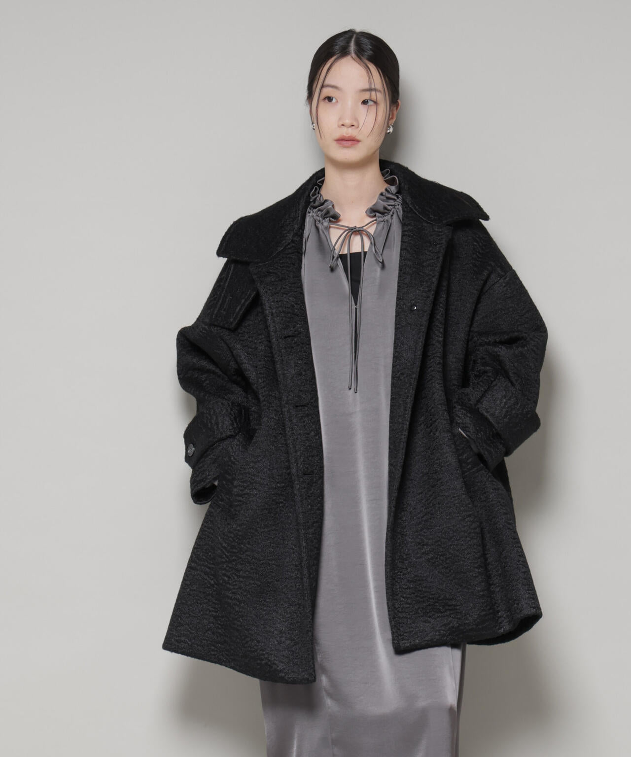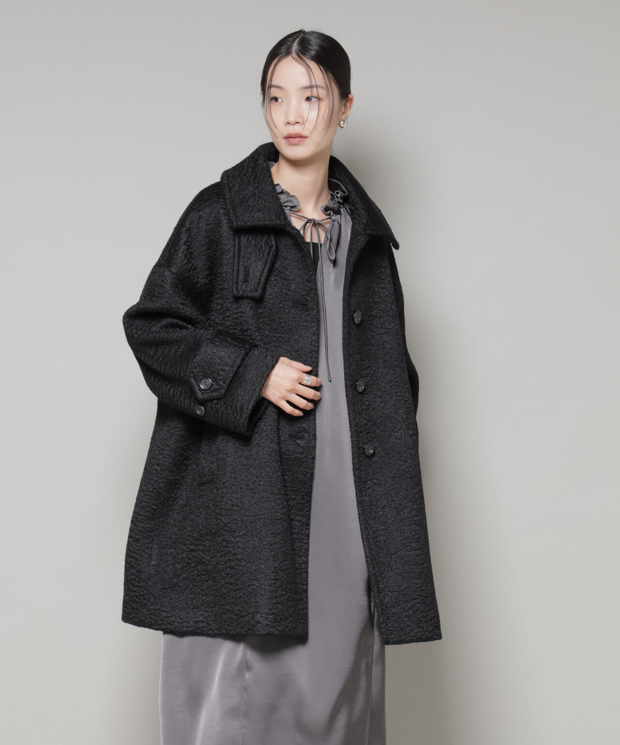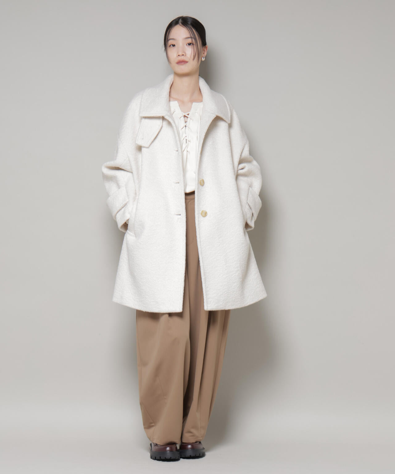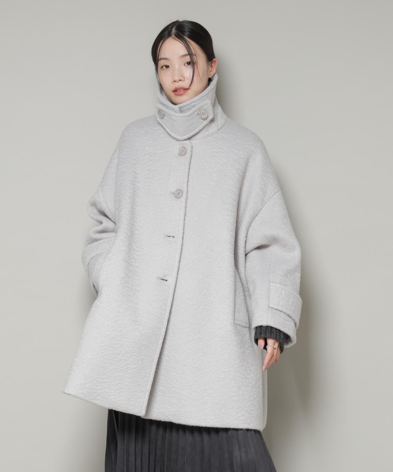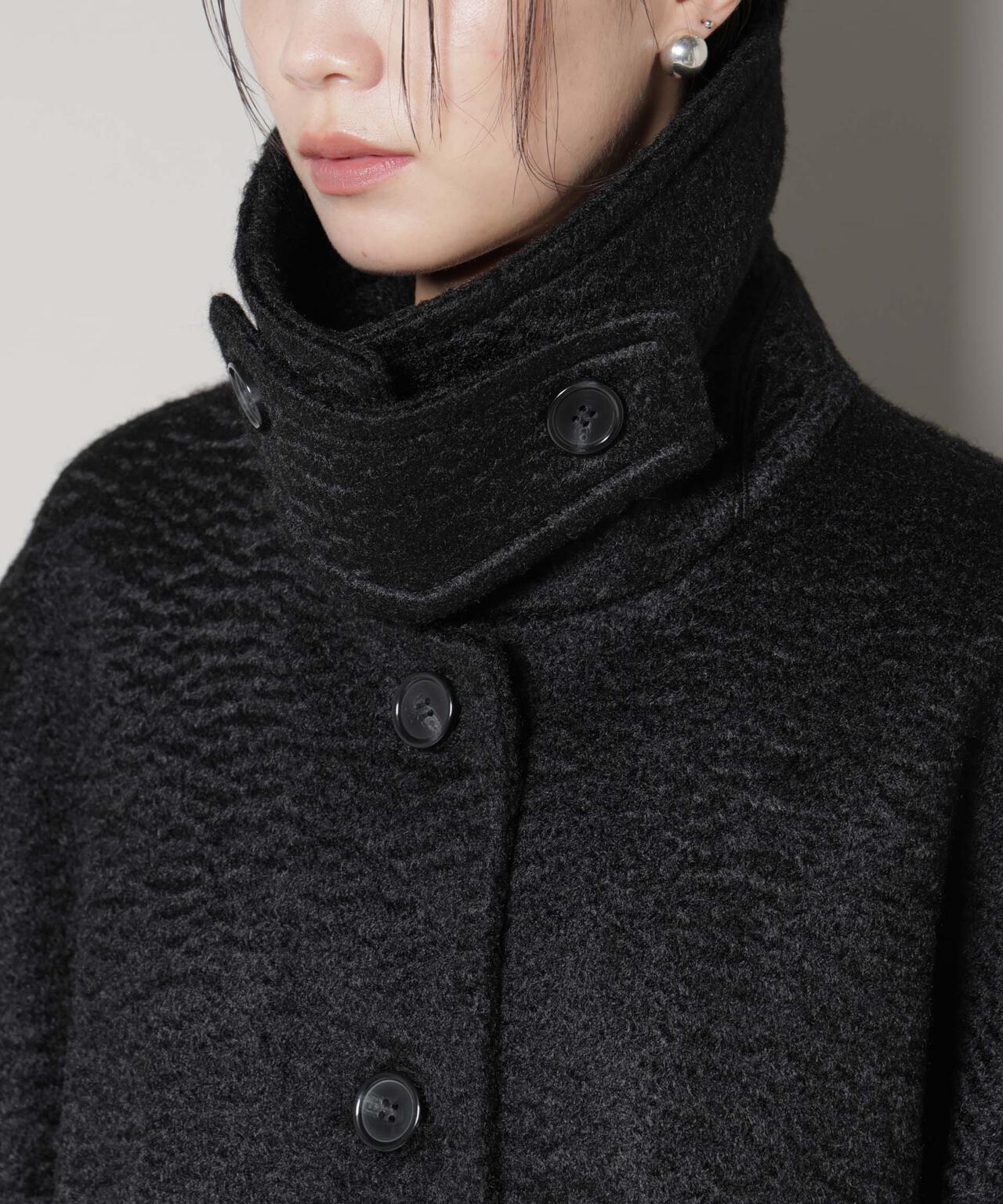肌触りの良いブークレ素材を使用したスタンドカラーコート。普段のワードローブに馴染みやすく、その日のスタイリングに合わせた着こなしを楽しめる万能アウターです。