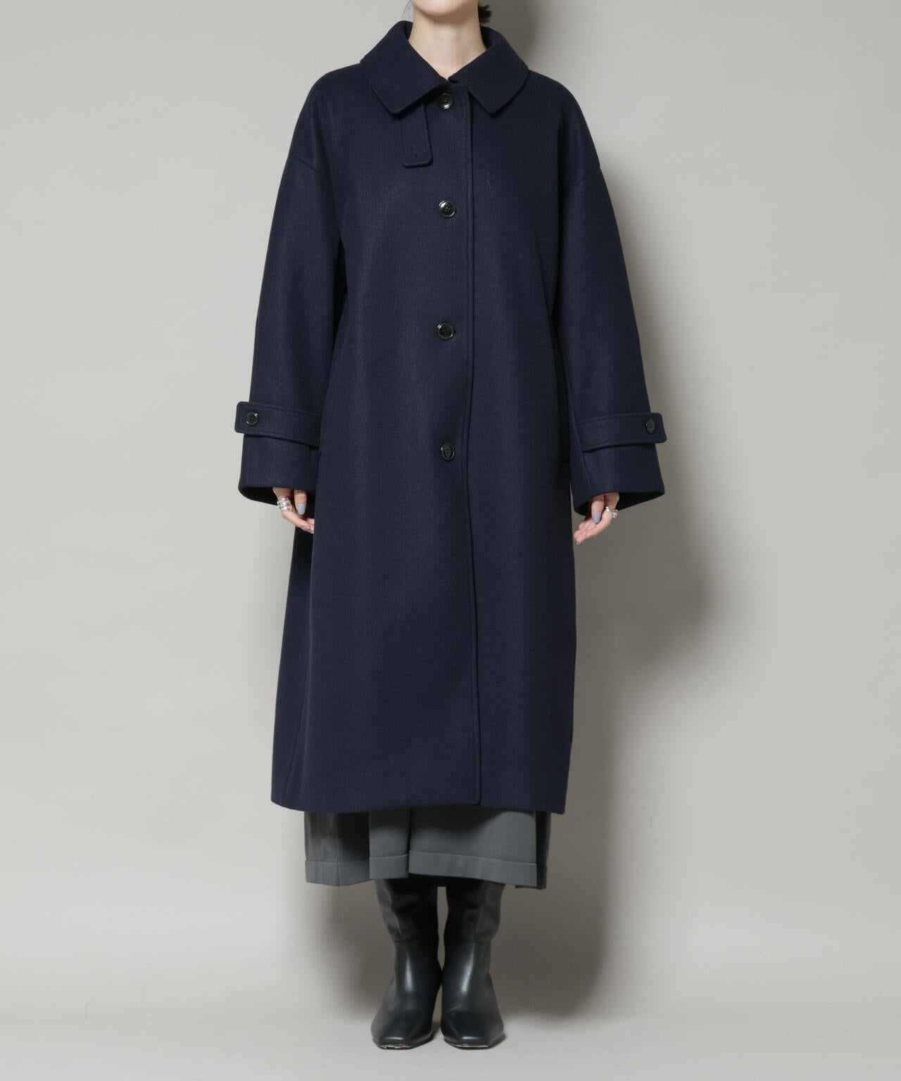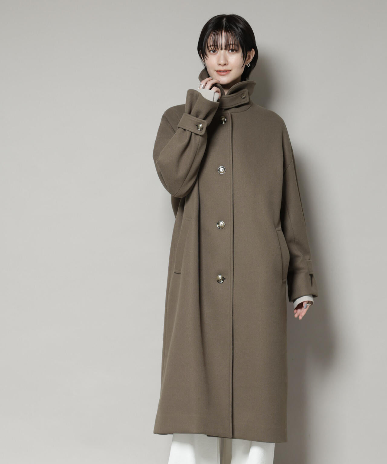 布帛ライクなウール見えのジャージー素材で仕立てた大人顔ロングコート。首元のタブを留めてハイネックとしても着用可能で、ニットやジャケット等、インナーを選ばず気軽に羽織れて秋冬に頼れる一着です。