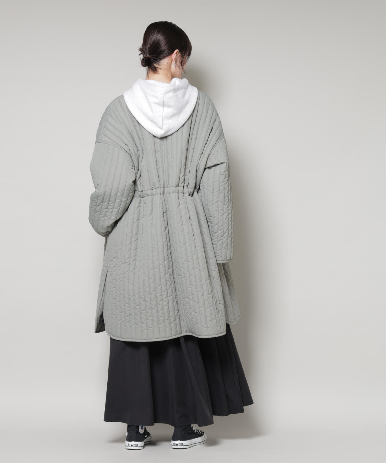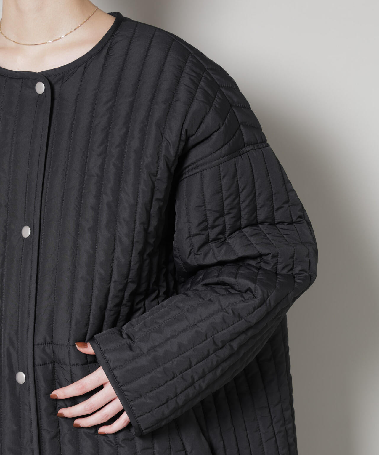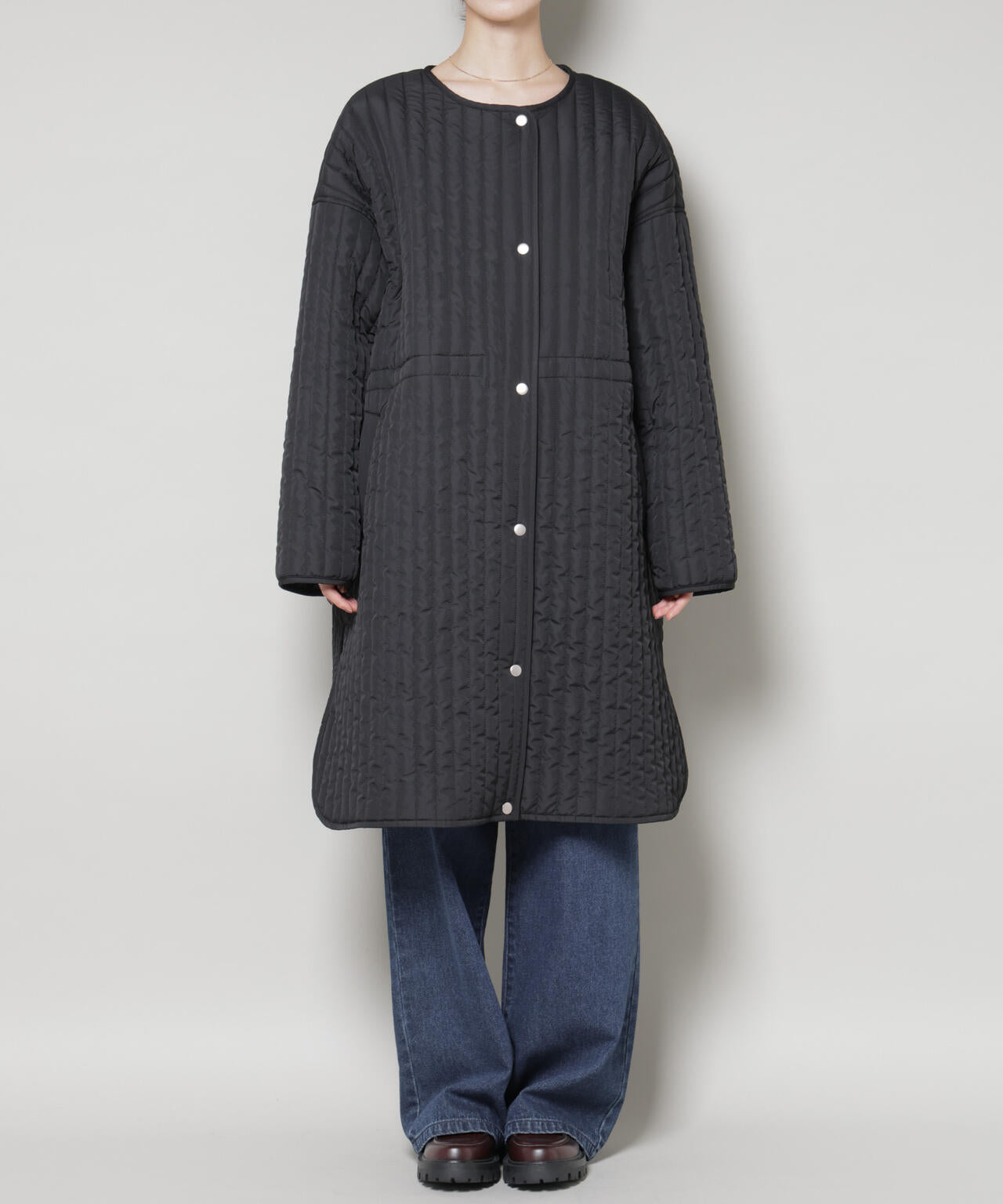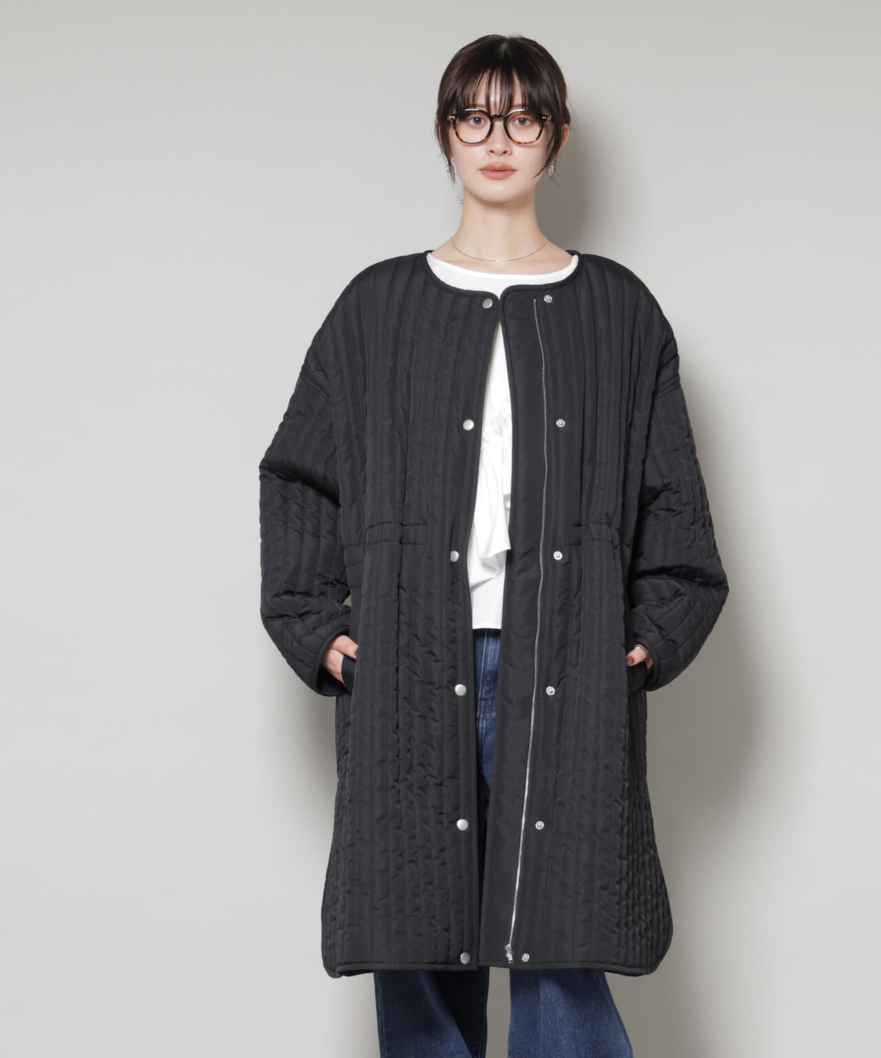 暖かな着心地の中綿ノーカラーコート。オーバーサイズながらも、縦ラインのステッチが全体をすっきり見せてくれるデザイン。マットな質感が上品さをプラスし、軽くて撥水機能も備えているため、デイリーからお出かけまで活躍する万能アウターです。