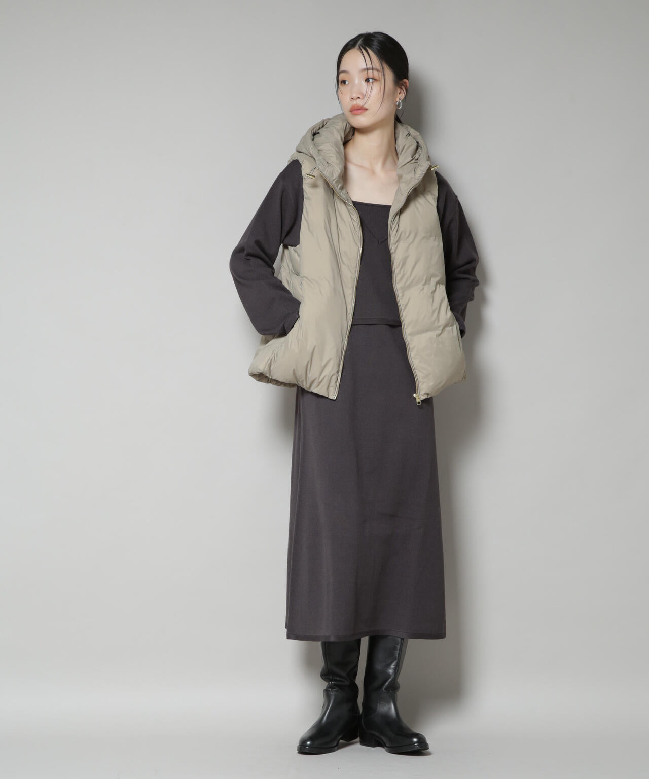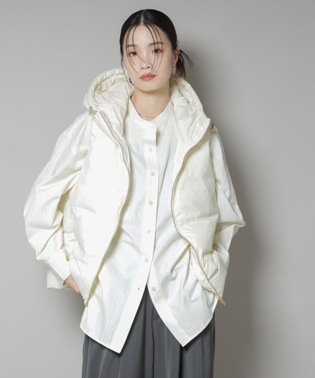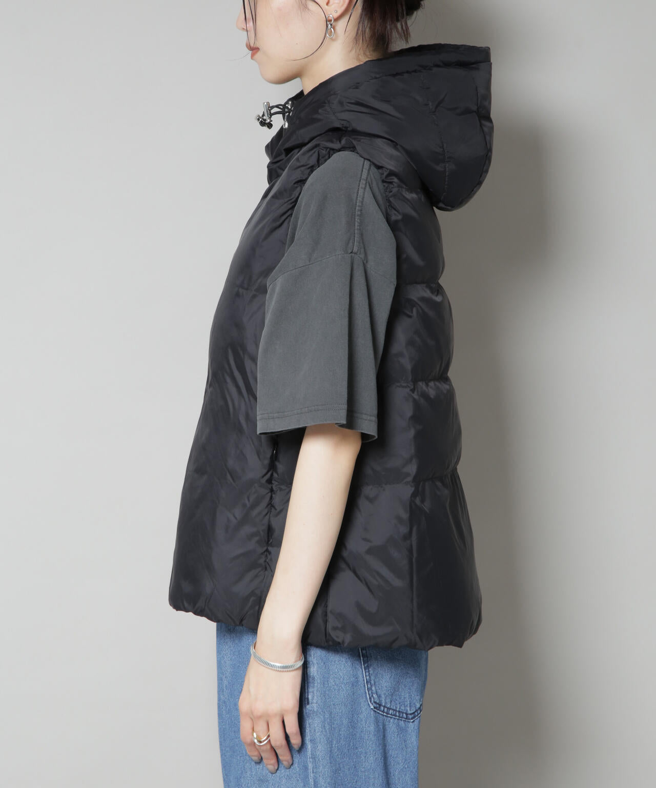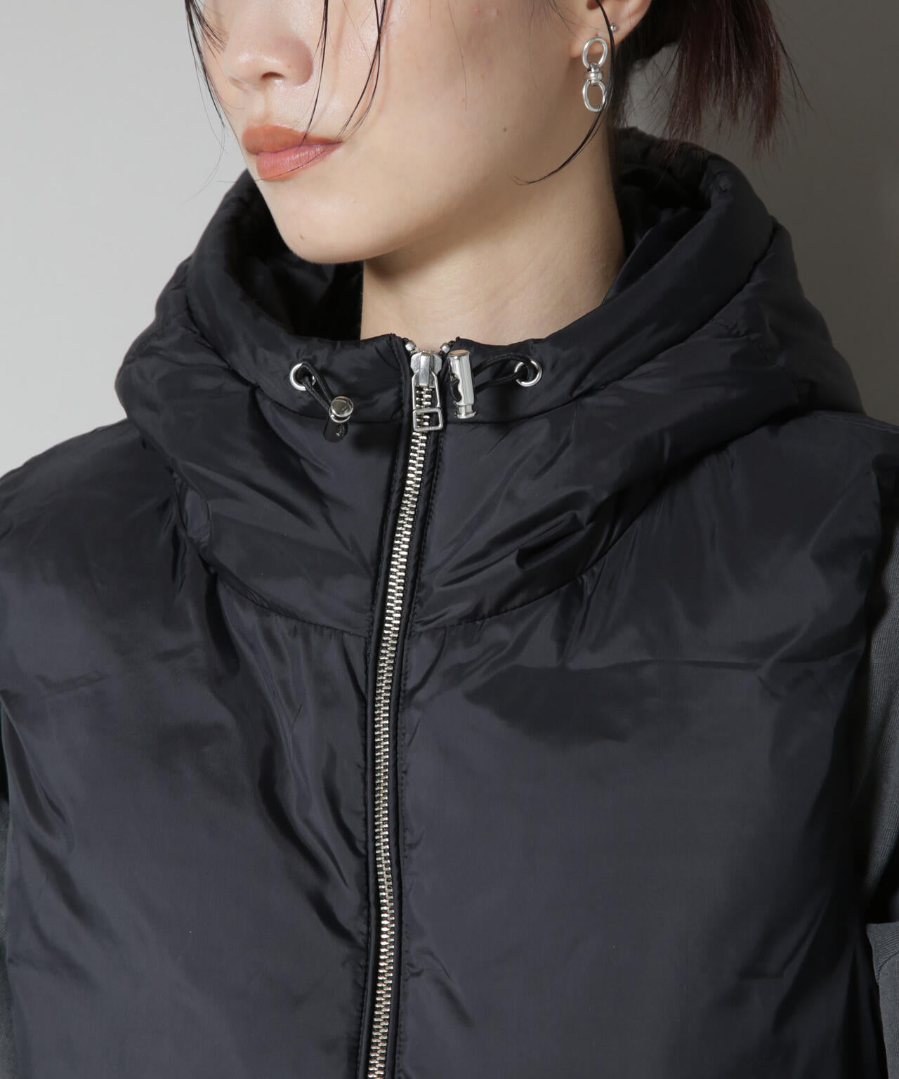軽い着心地と微光沢のある素材感が、大人の女性にぴったりなフードダウンベスト。ゆとりのあるアームホールなので厚手のスウェットやニットの上からでもストレスなく着用が可能◎。合わせるアイテムを選ばず幅広く着回しできるから、季節の変わり目に活躍するアイテムです!