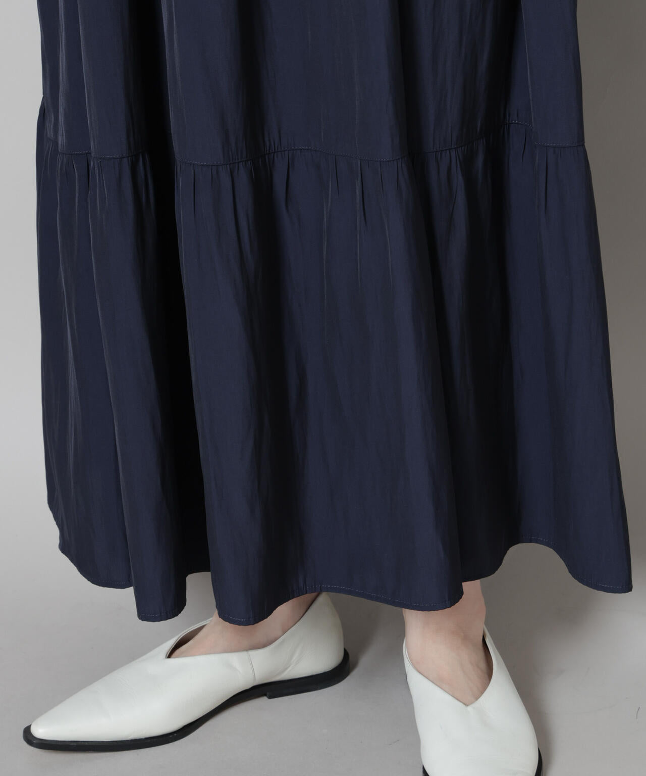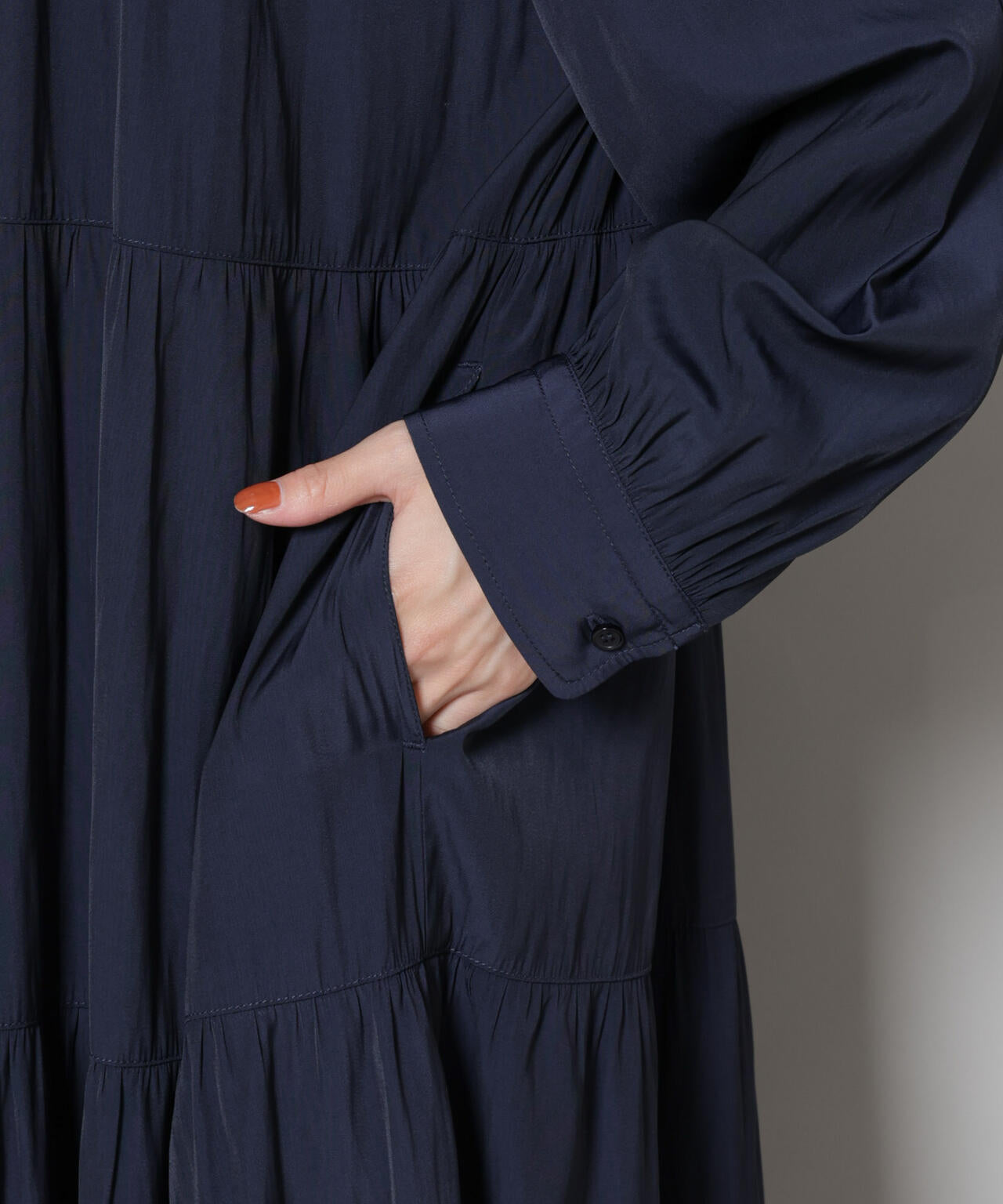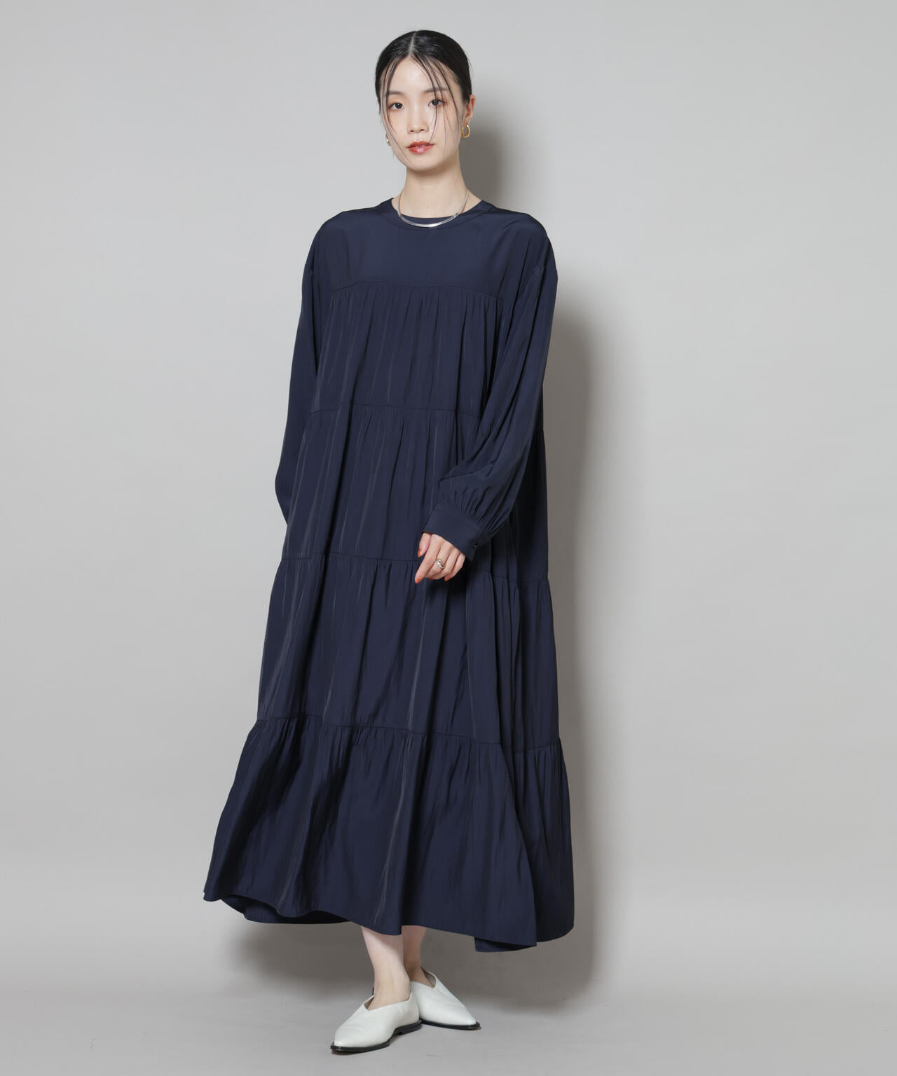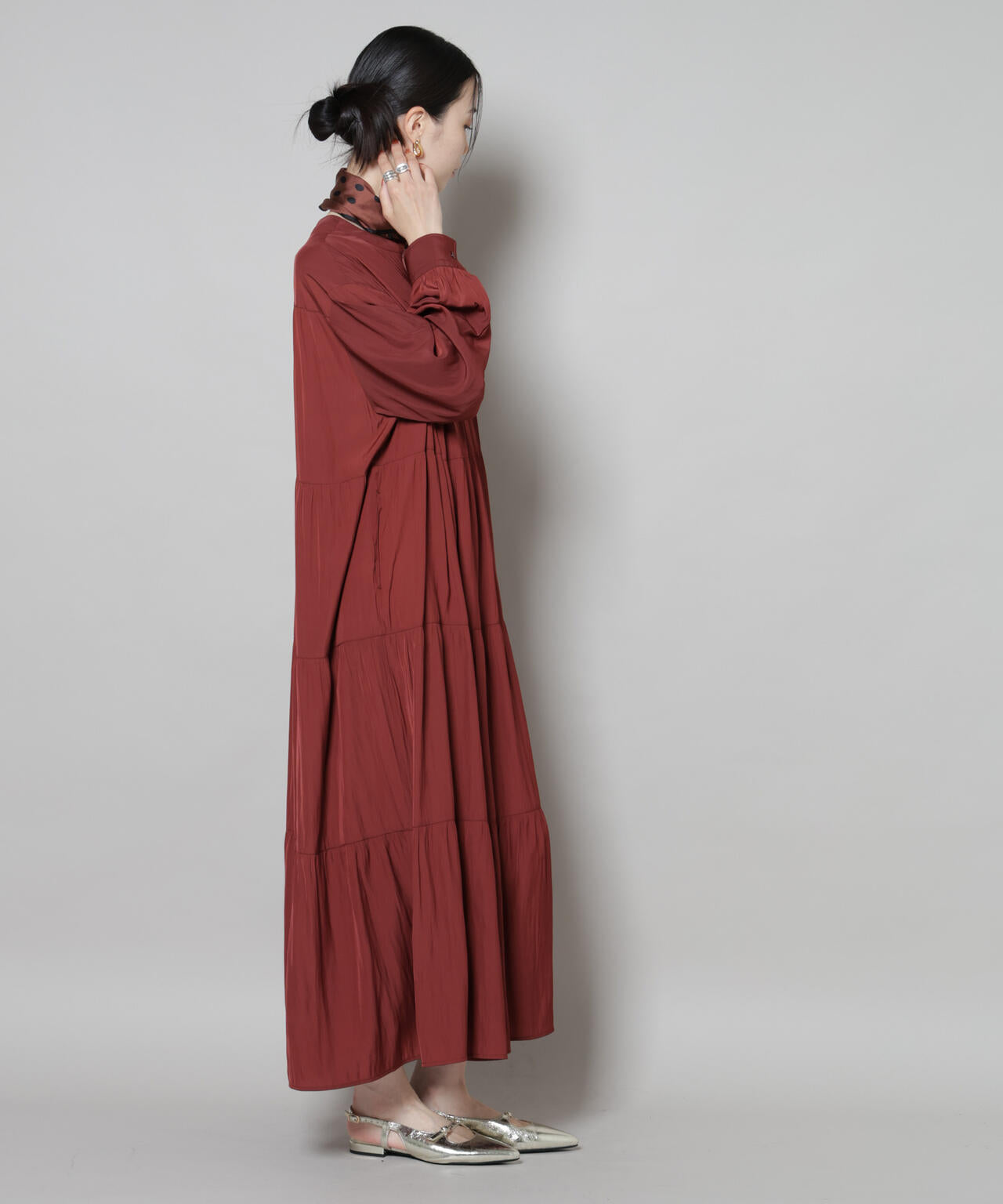 上品な艶と、揺れるシルエットが一枚で着映えするマキシ丈ワンピース。ボリューム感のある華やかなティアードデザインが女性らしさを引き立ててくれる一着です。