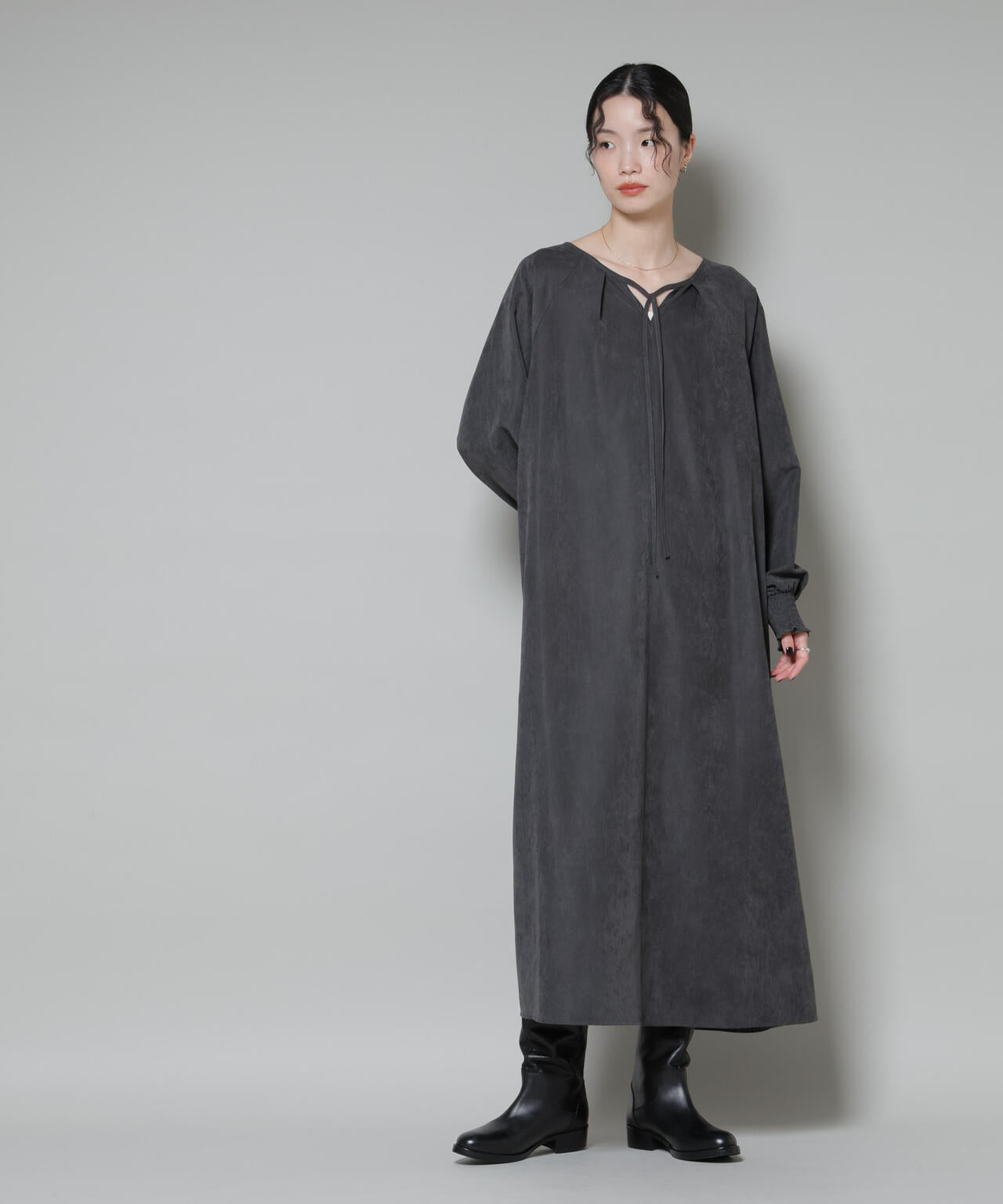 裾に向かって広がるシルエットが、女性らしさを引き立てるフレアワンピース。起毛感と上品な艶のあるピーチ素材を使用しており、柔らかく肌ざわりも快適。付属のラッフルカラーをつけると、トレンド感のあるラッフルカラーワンピースとしても楽しめる一枚です。