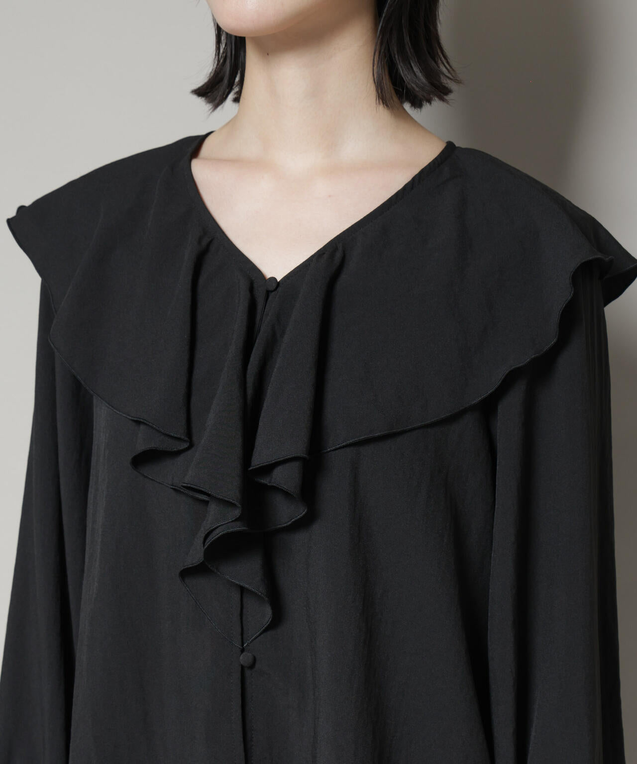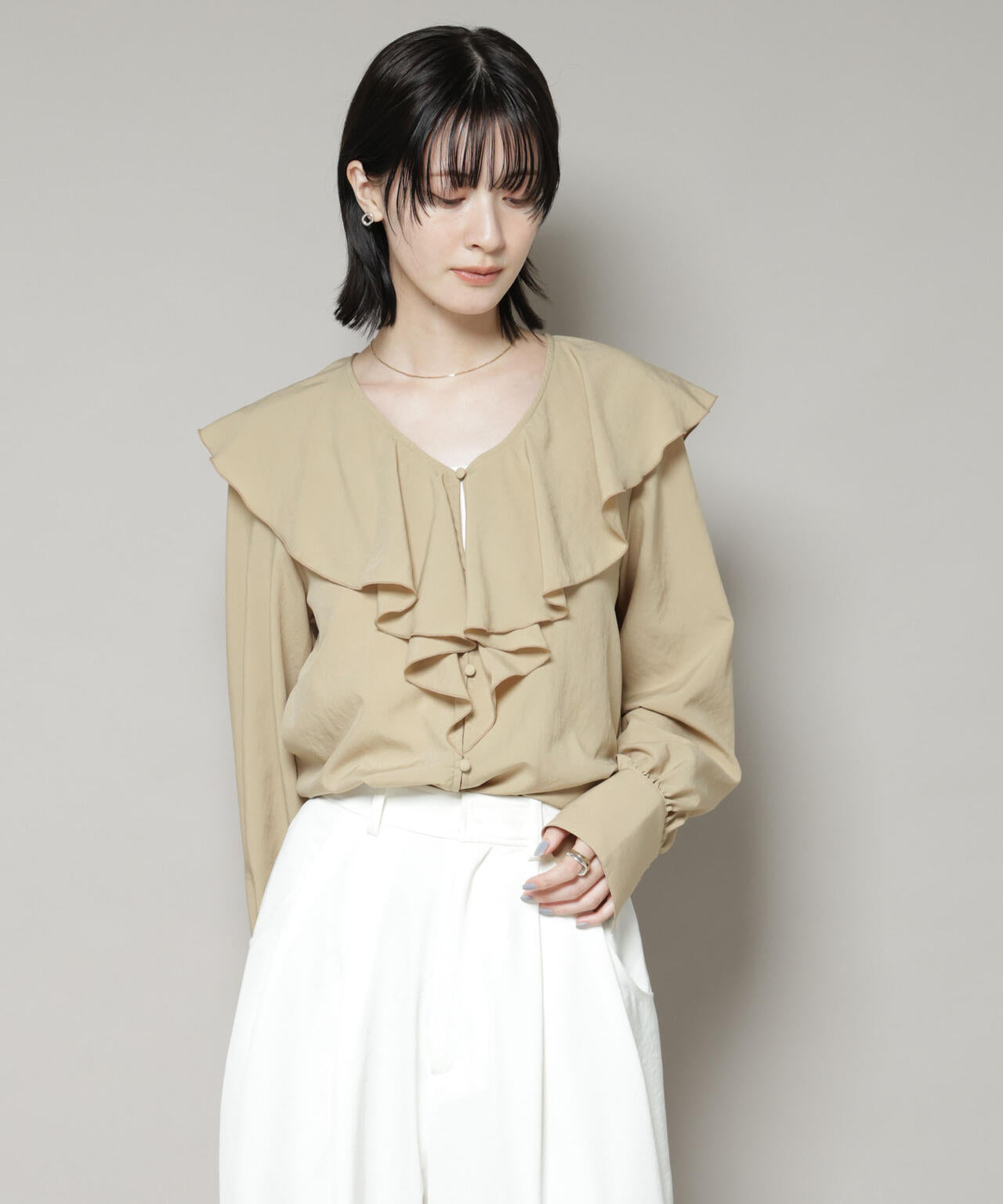 女性らしく華やかな印象のラッフルカラーブラウス。キレイ目な素材とバランスに拘ったラッフルデザインが、甘すぎずスッキリとした印象に仕上げてくれる着映えアイテムです。