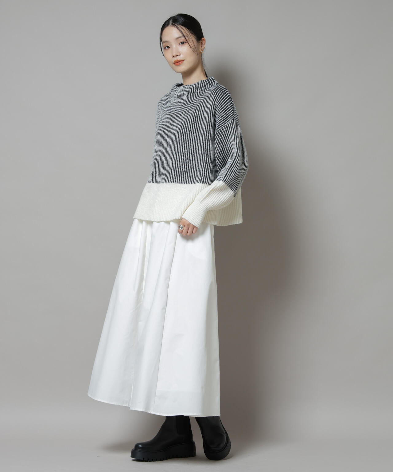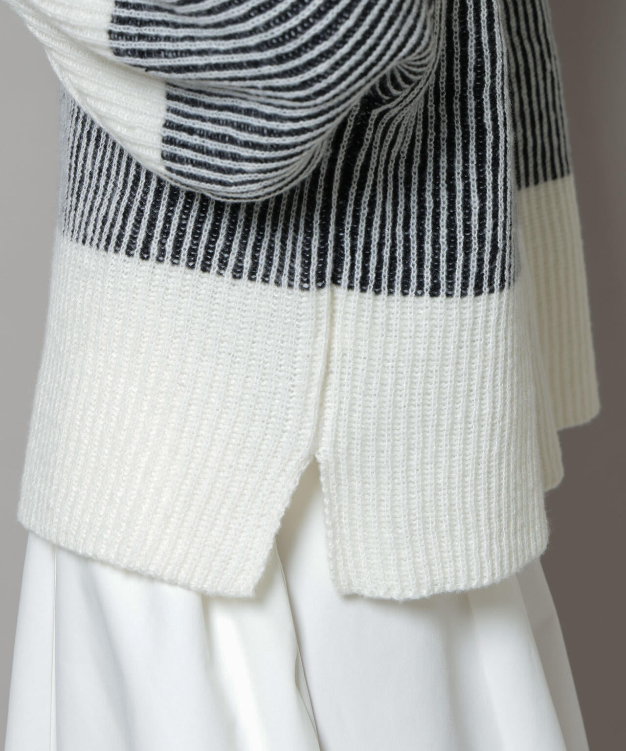 目を引くバイカラーとシャドーストライプのデザインが魅力のニットトップス