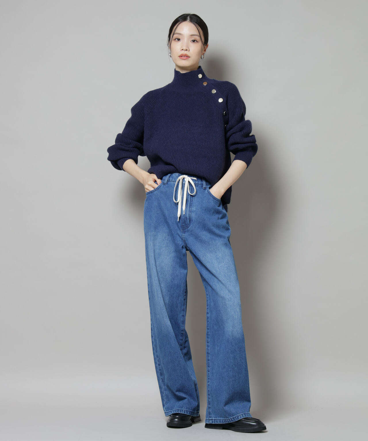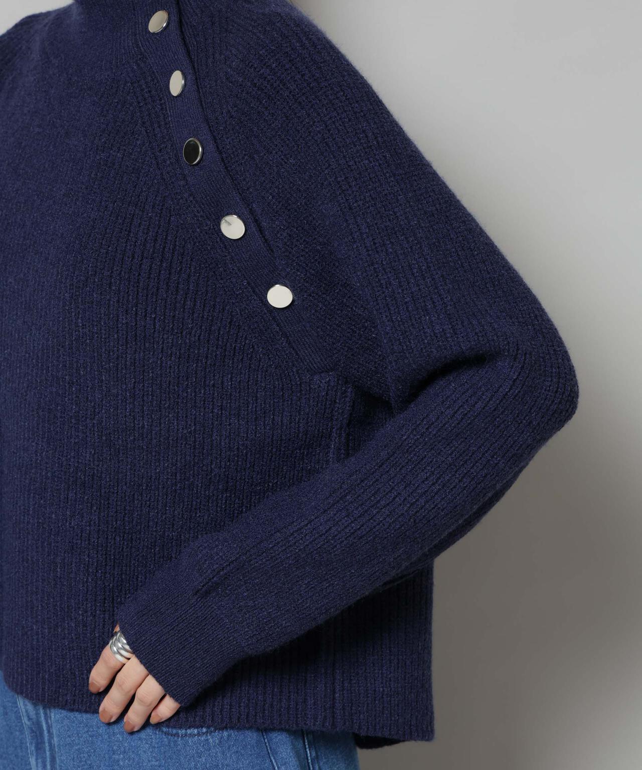 ハイネックの釦ディティールが可愛いニットプルオーバー