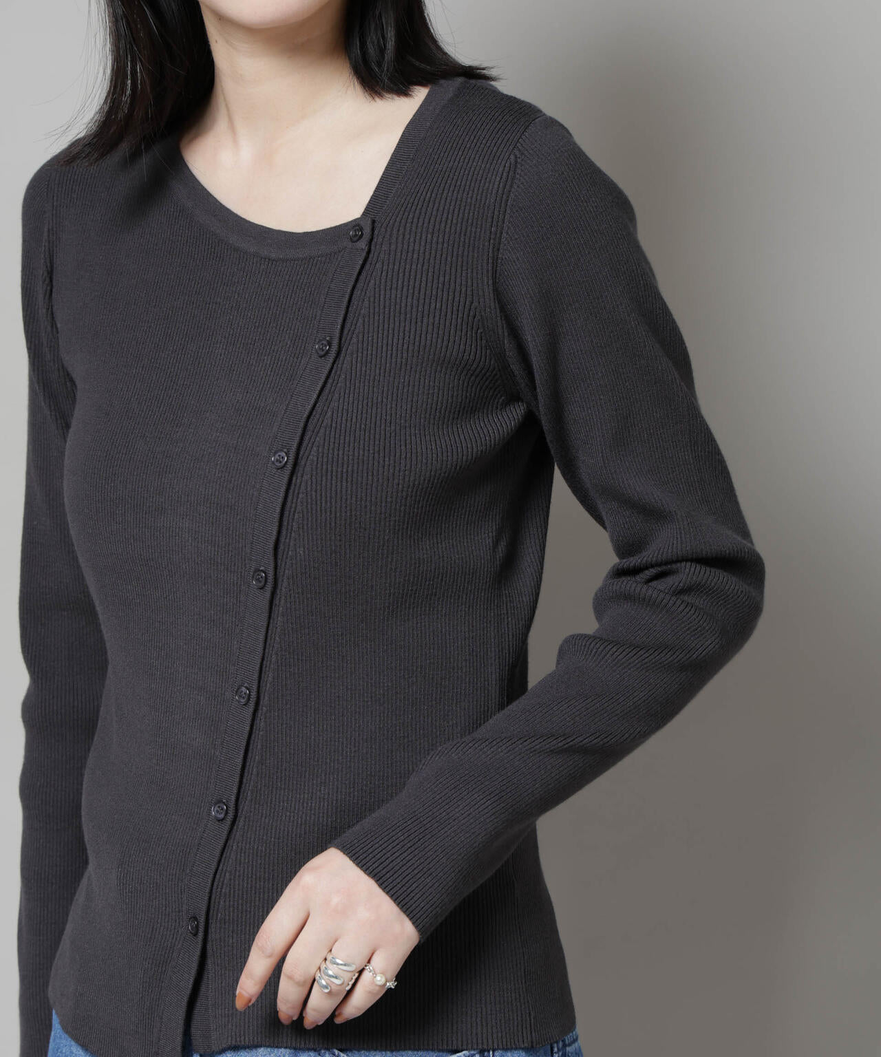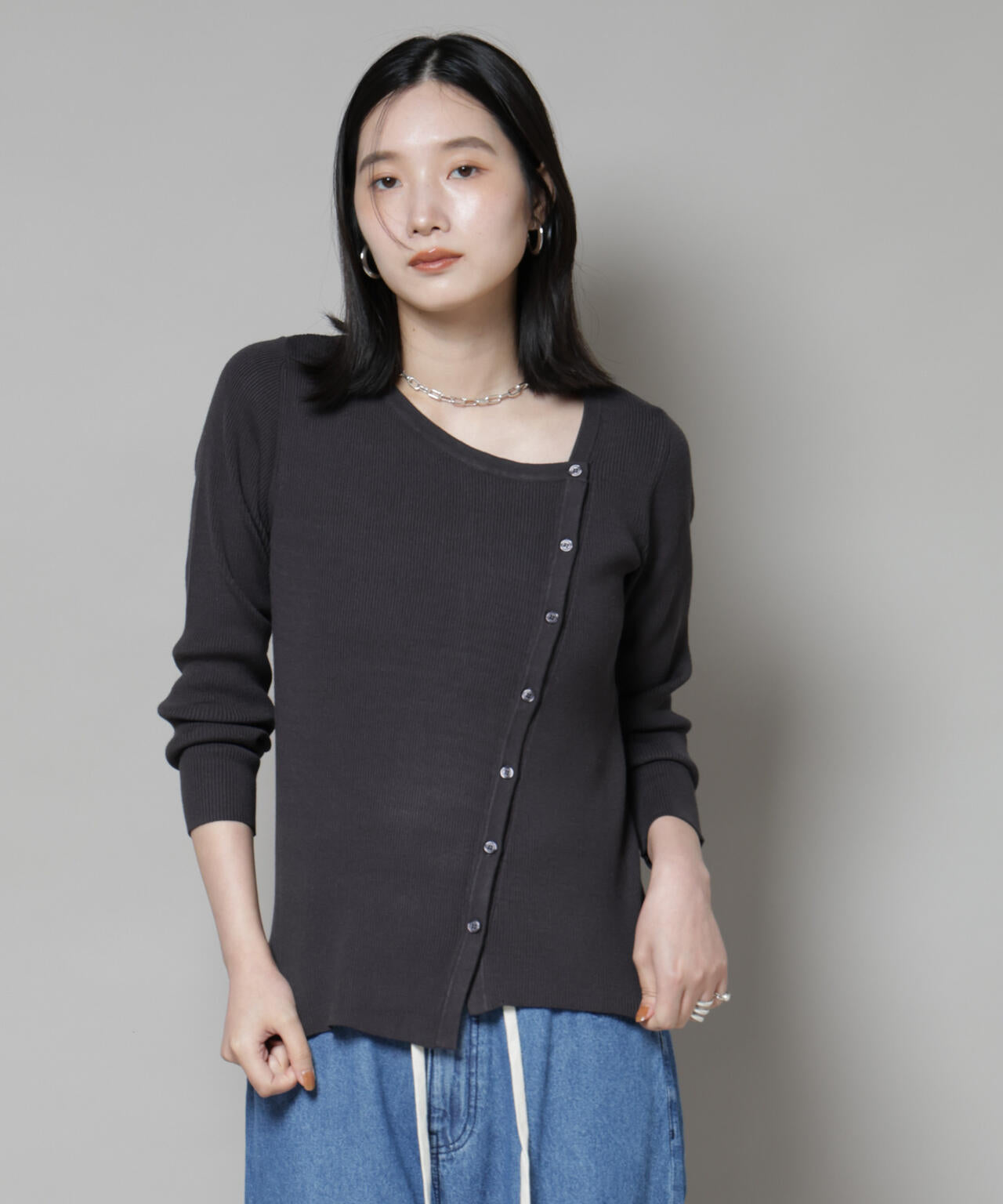 アシメネックのデザインが、上品で大人っぽい雰囲気のデザインニット。斜めに入ったボタンを全て閉めたり、上下を開けて真ん中のみ軽く閉めたり、着こなしのアレンジを楽しめるアイテムです。