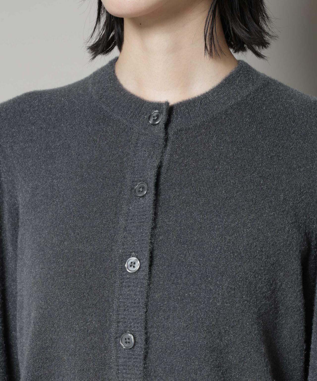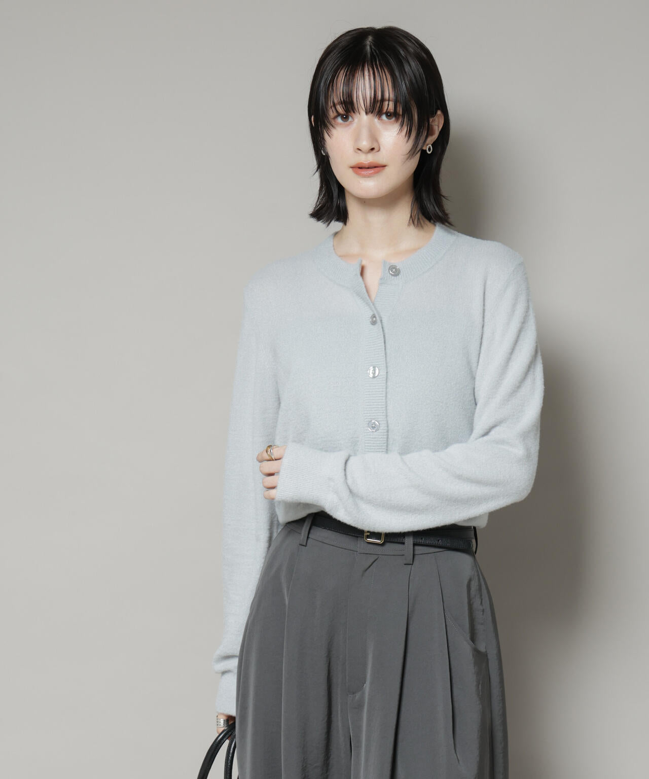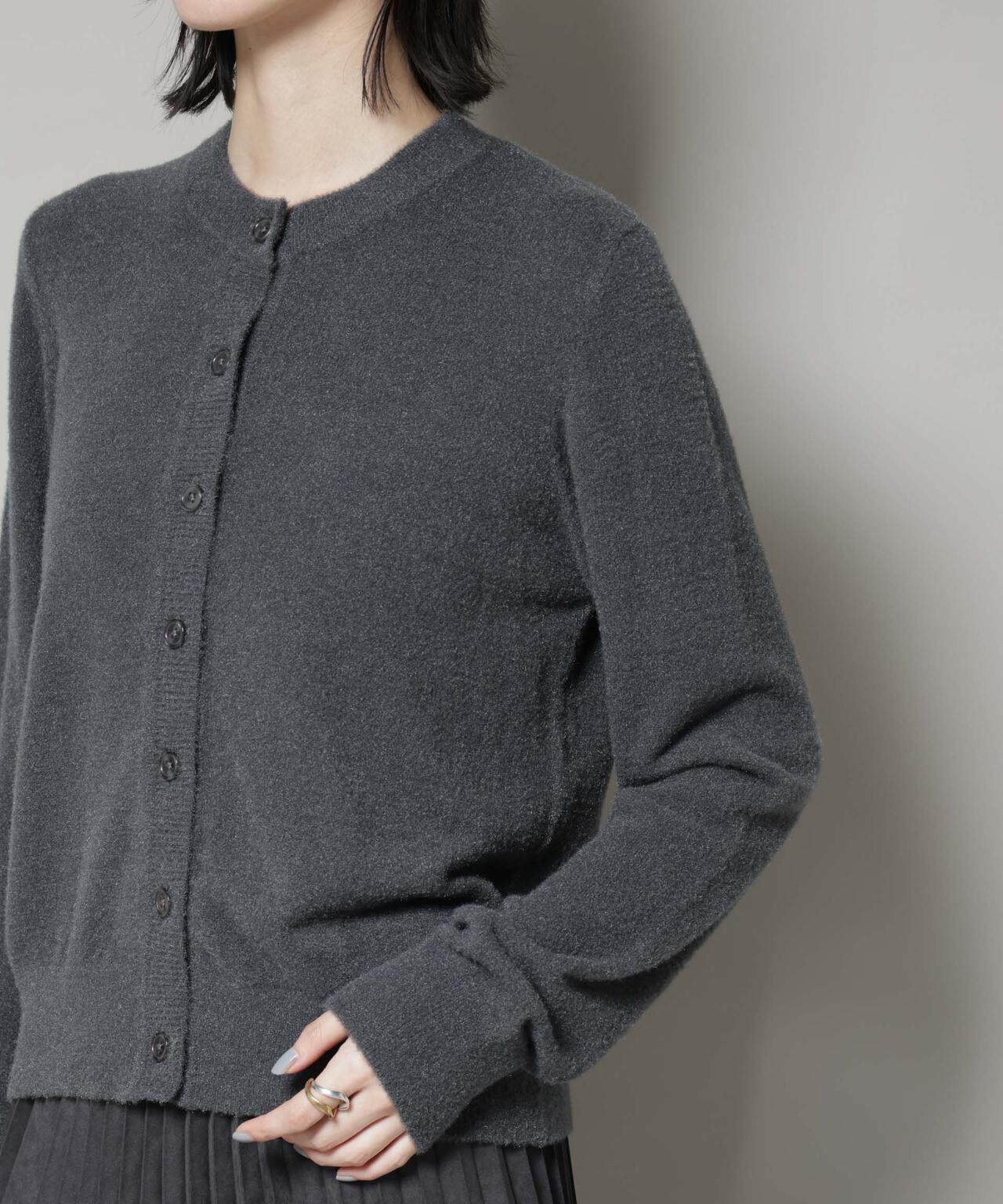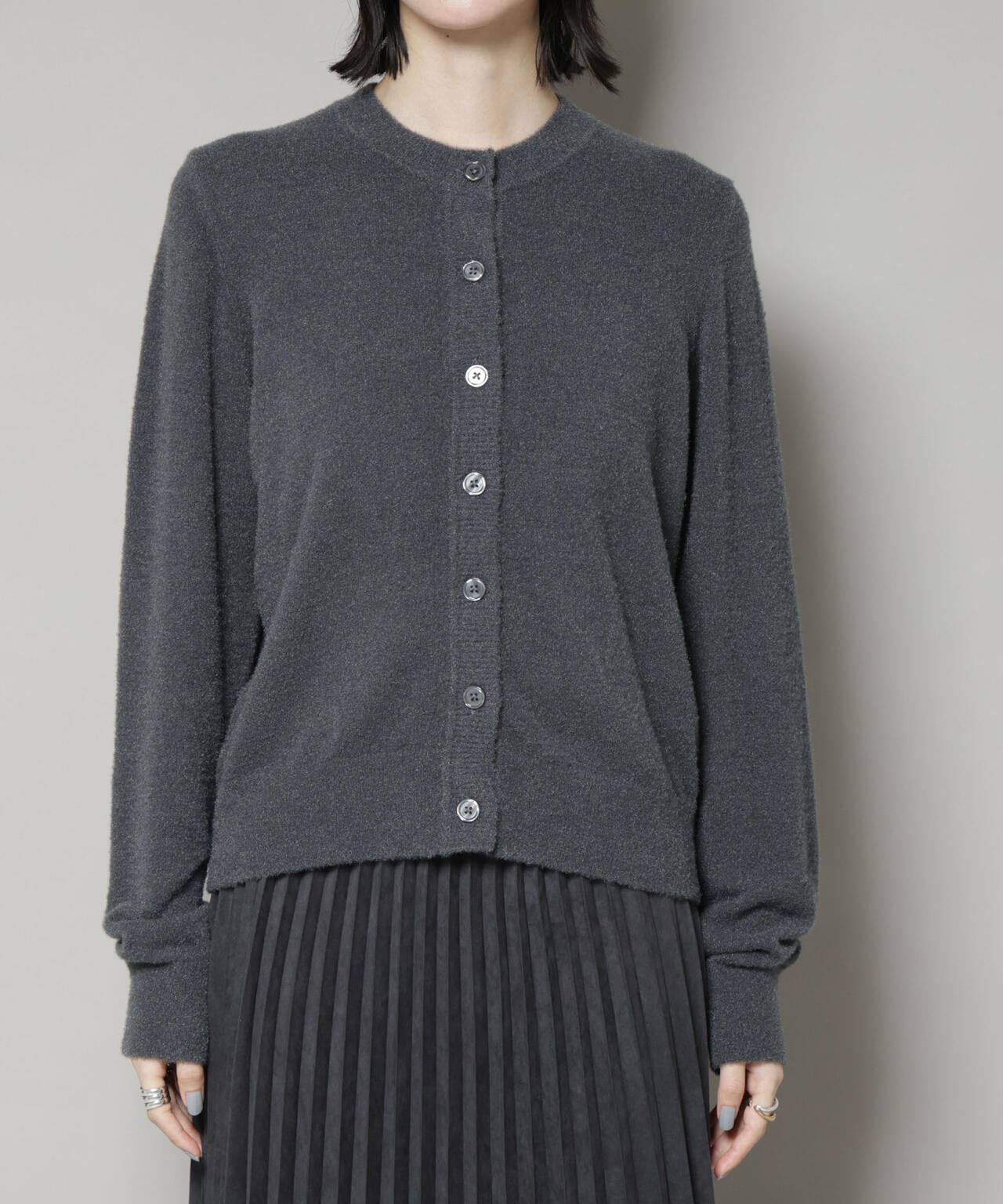 スタイリングに取り入れるだけで、華やかさをプラスしてくれるニットカーディガン。程よくキラキラとしたラメをミックスしたシャギー素材で、ふわふわとした柔らかい肌触りと温かみのある質感が魅力の一着です。