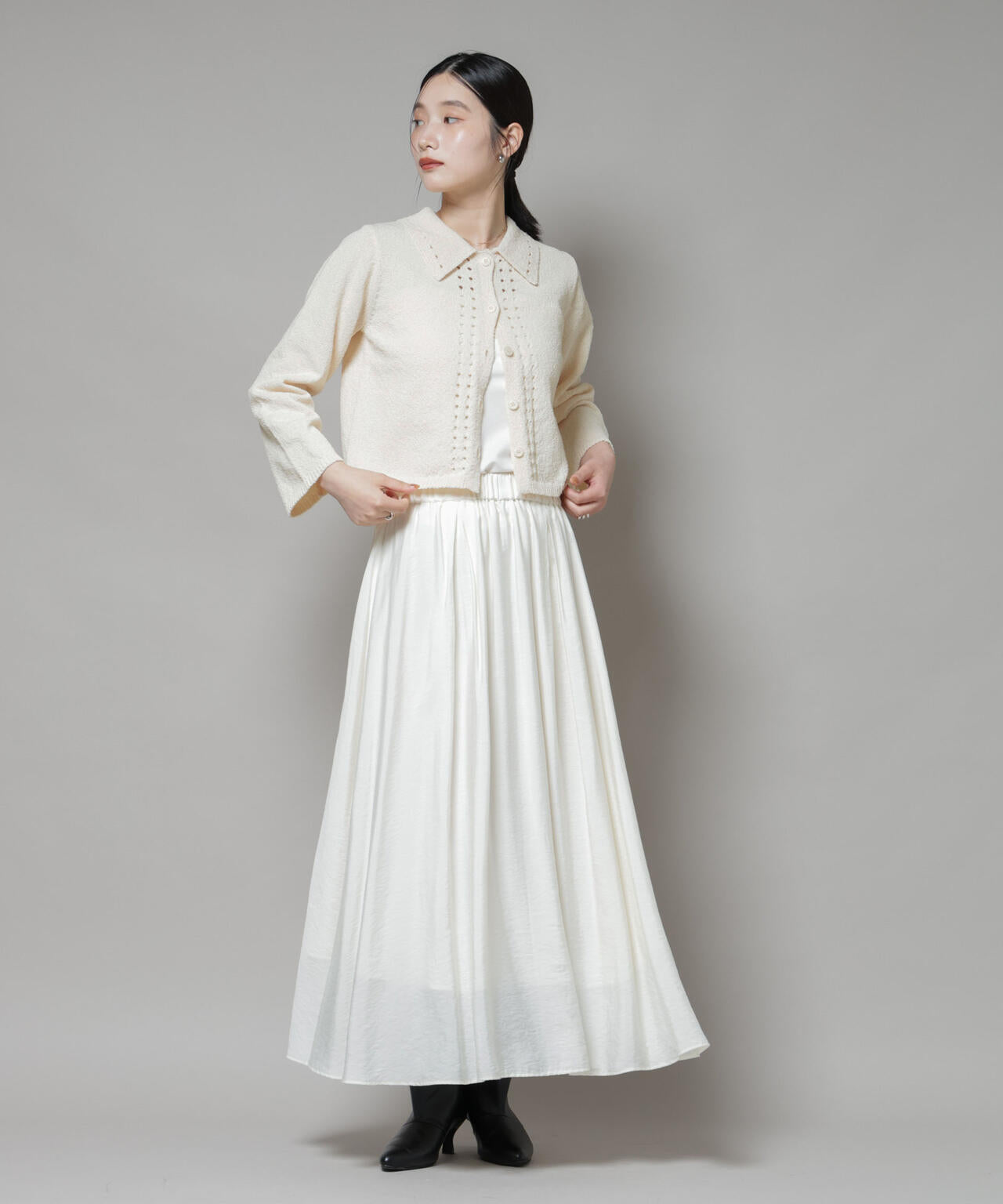 フロントと衿の規則的なアイレットディテールが目を引くニットカーディガン。前を閉めてトップスとして合わせたり、ボタンを開けてインナーとレイヤードしたり、幅広い着こなしを楽しめるアイテムです。