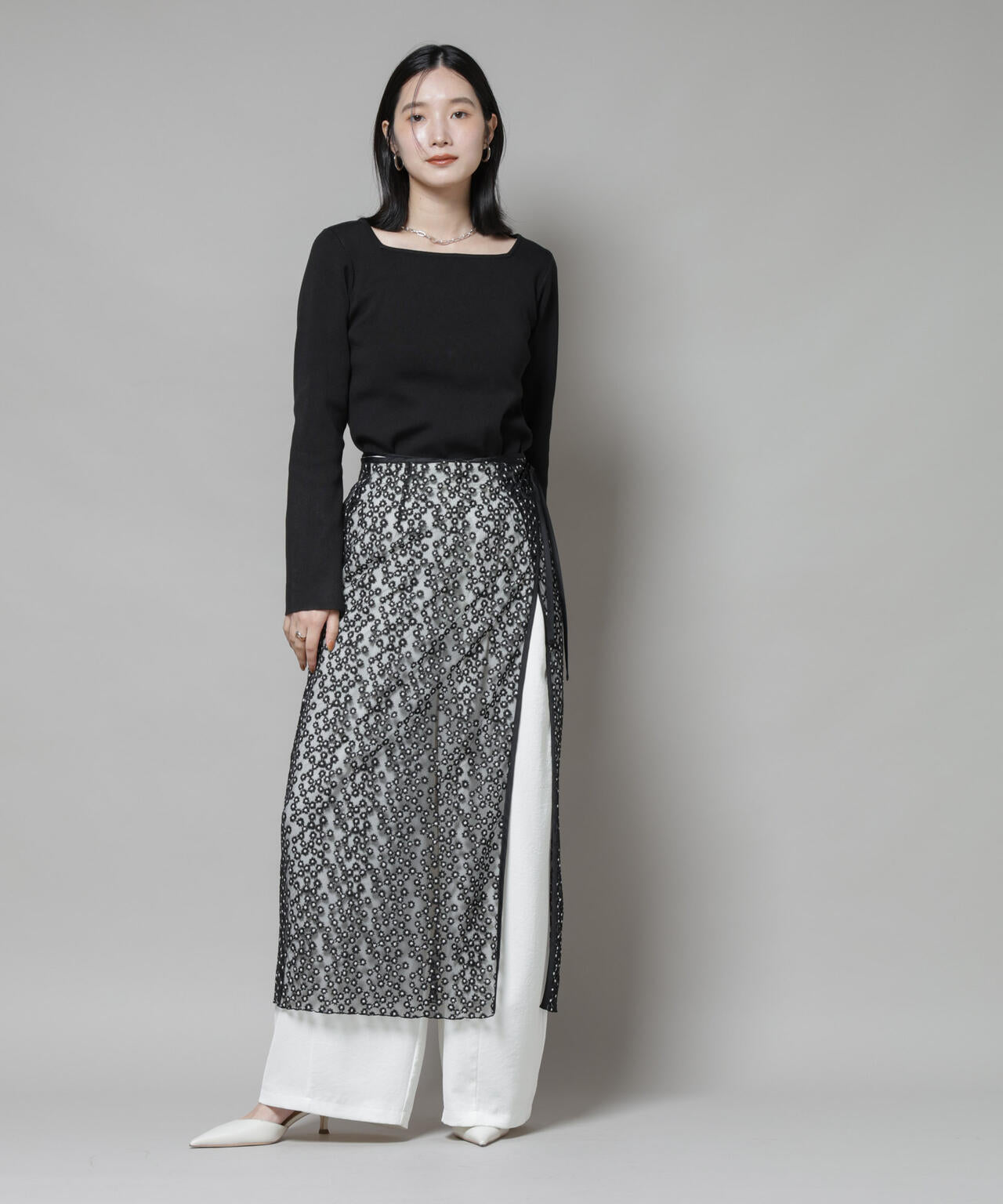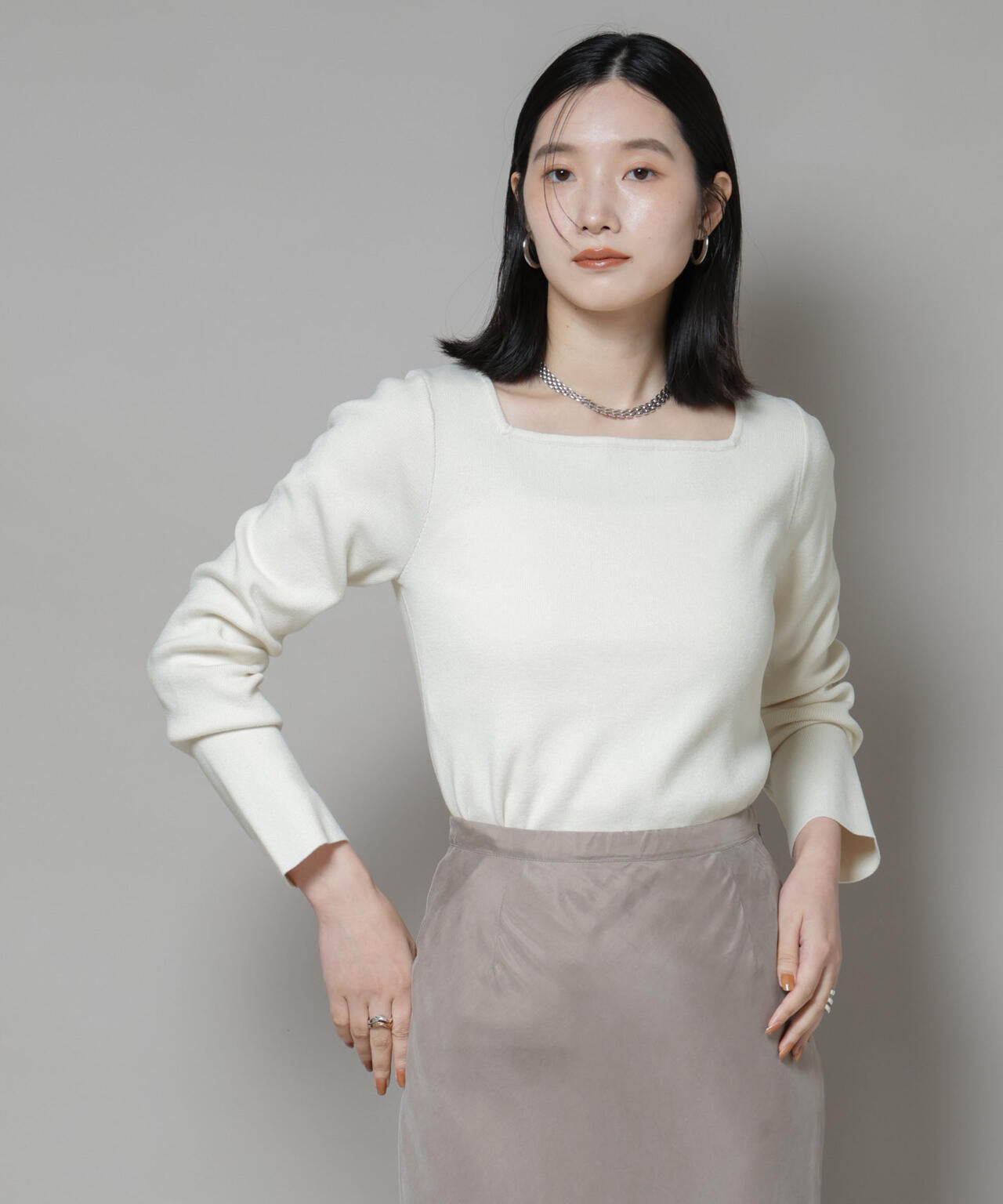 スクエアネックとボートネックのデザインを楽しめる、前後2wayのニットプルオーバー。合わせるボトムしだいでカジュアルにもキレイ目にも合わせられるので、クローゼットに備えておくと重宝しそう。