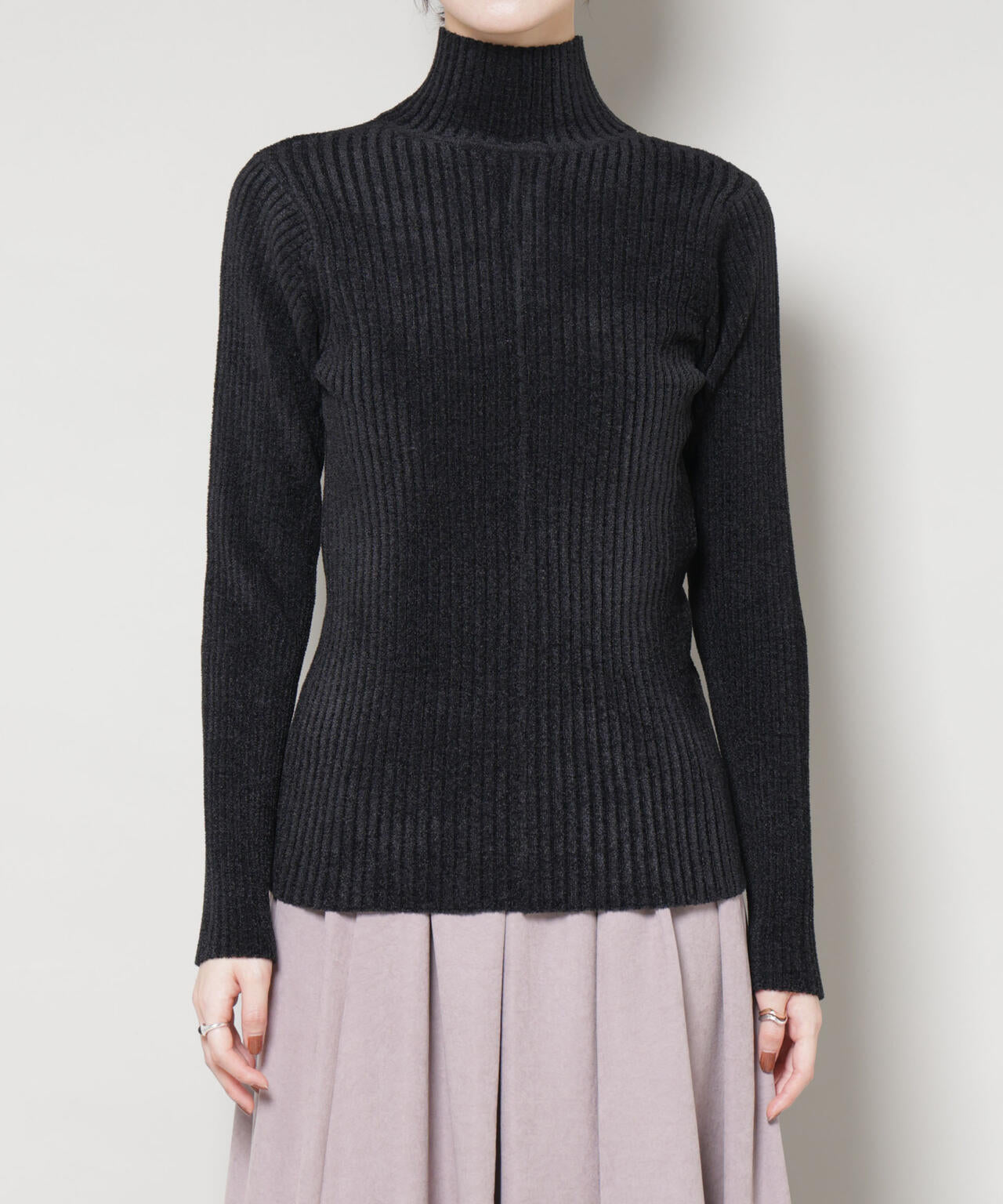 顔周りをすっきり見せてくれるハイネックニットトップス