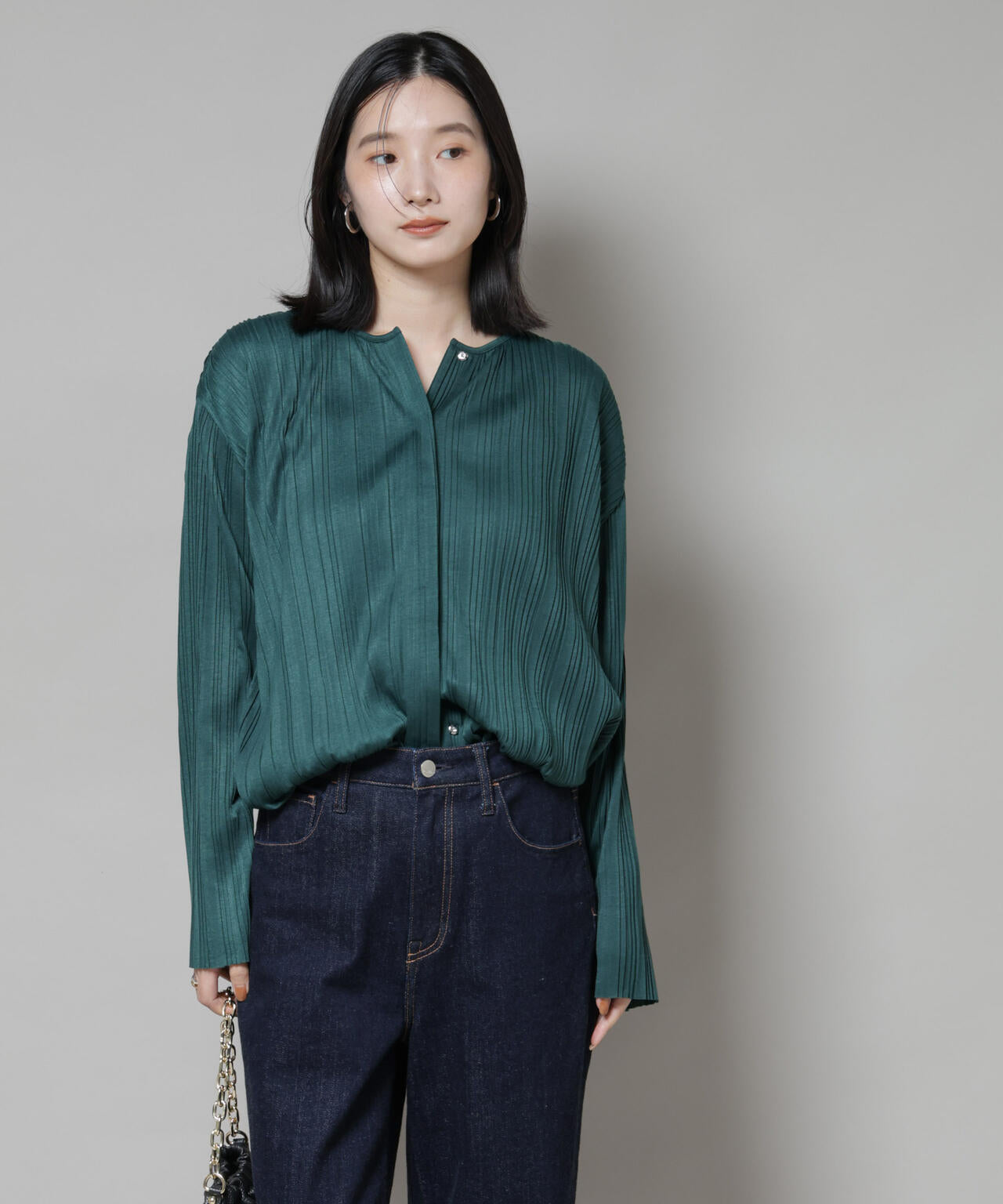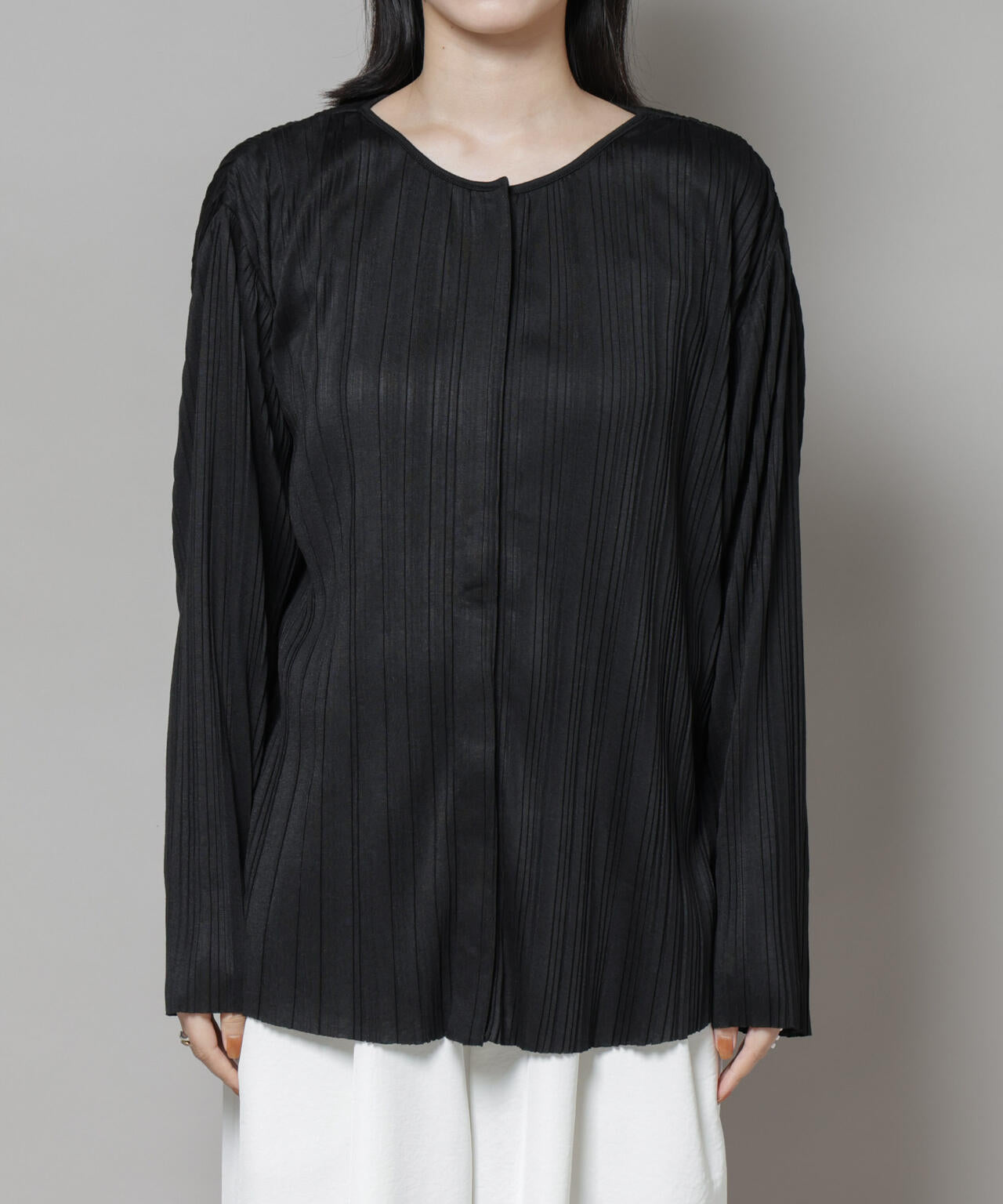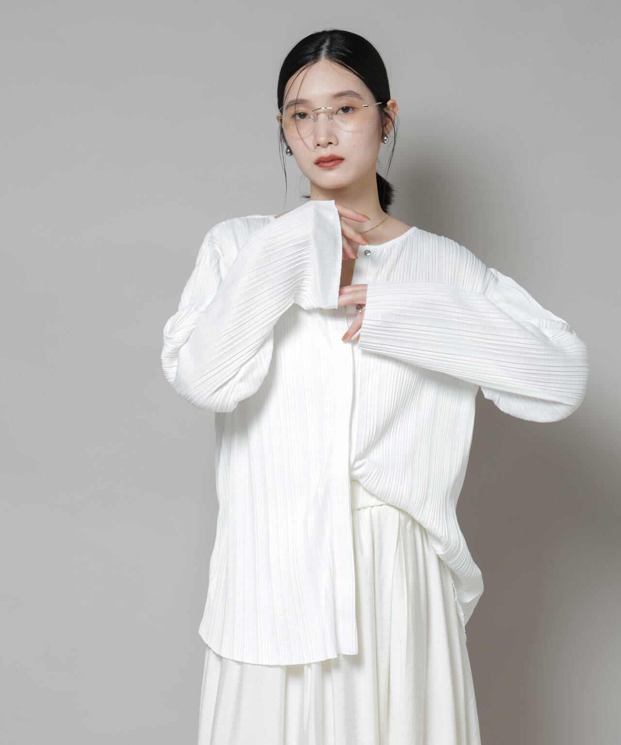 繊細なランダムプリーツが上品で女性らしい印象のカットシャツ。前を閉じてプルオーバーとしても、開けて羽織としても着回し可能で、暑さの残る秋シーズンにも活躍するアイテムです。