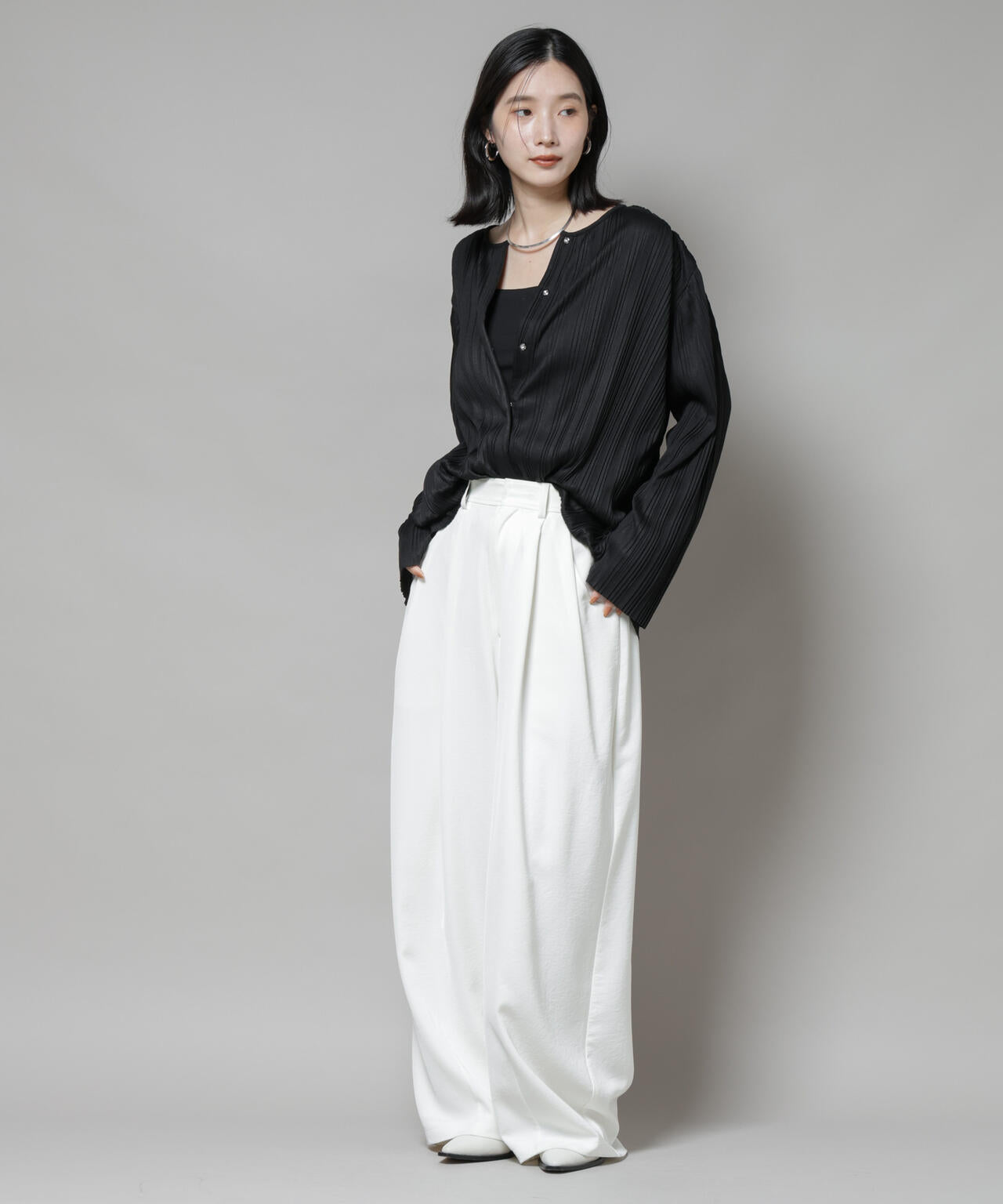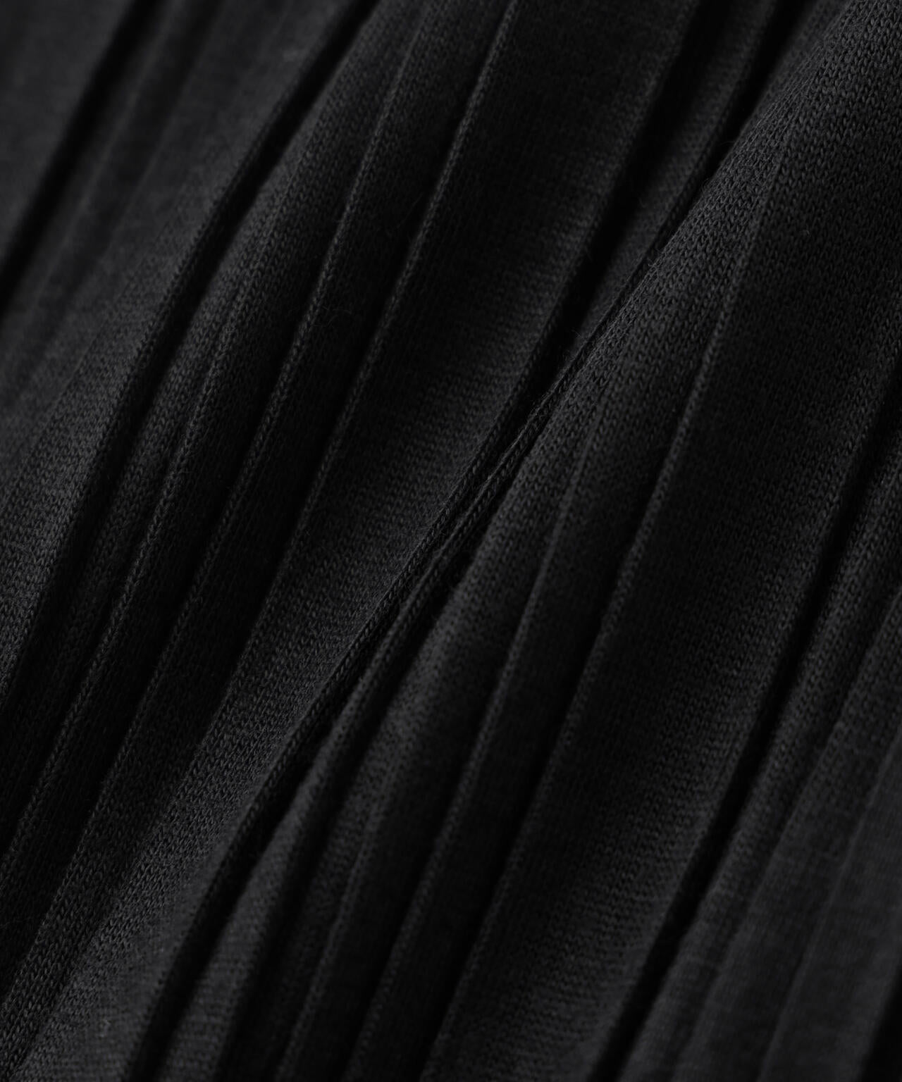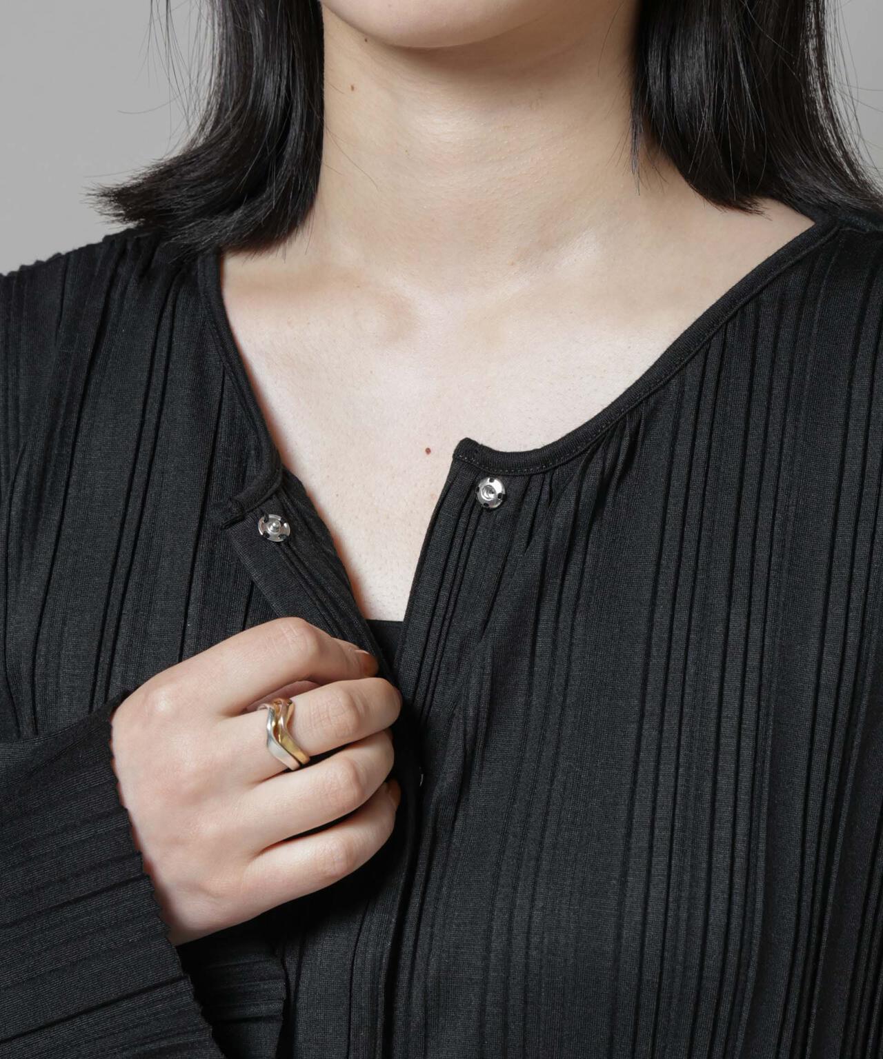 繊細なランダムプリーツが上品で女性らしい印象のカットシャツ。前を閉じてプルオーバーとしても、開けて羽織としても着回し可能で、暑さの残る秋シーズンにも活躍するアイテムです。