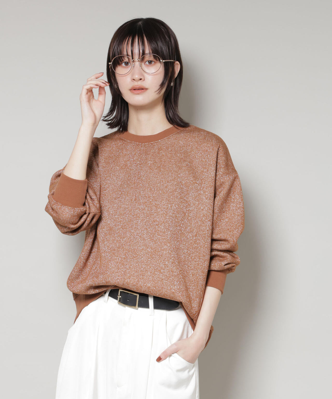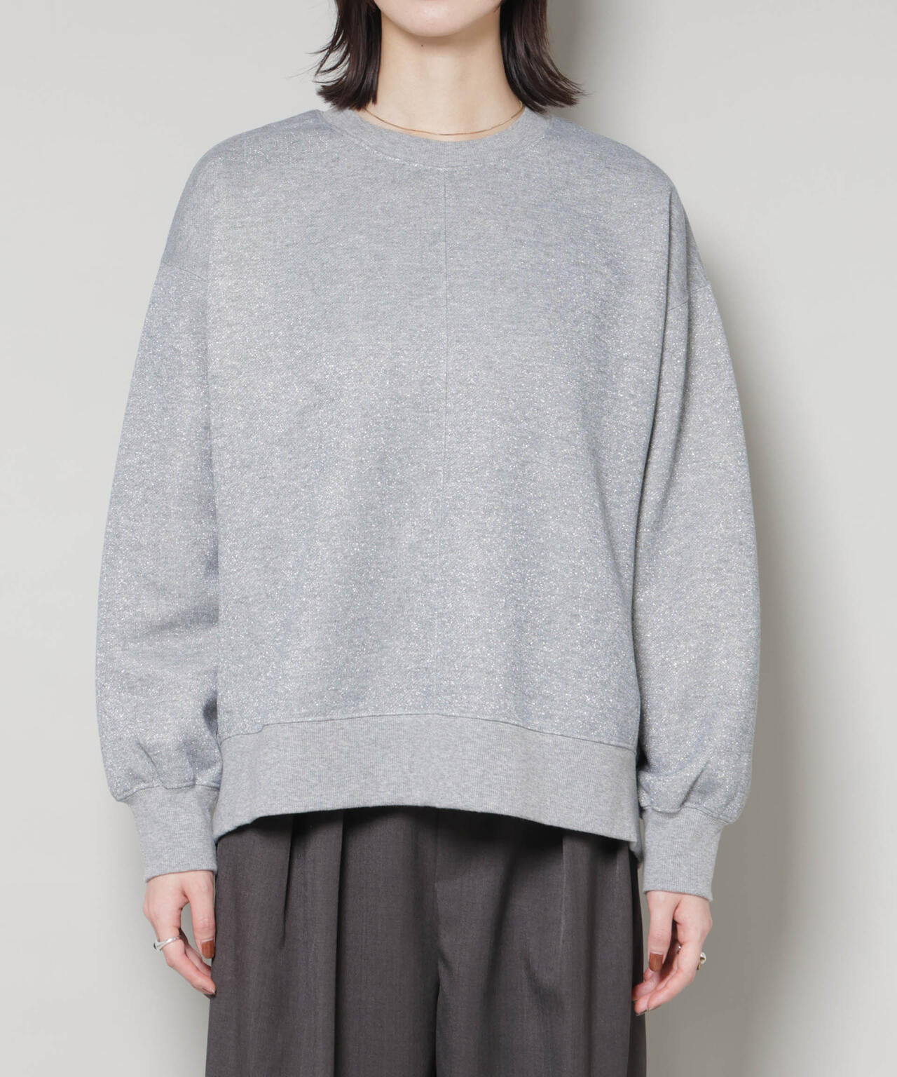 さりげないラメ感が華やかさをプラスするカットソートップス。ややワイドな袖と丸みのあるシルエットで、リラックス感がありながらも女性らしい印象に。裏毛のカットソー素材で肌触りも良く、カジュアルながらも上品さを感じられる一枚です。