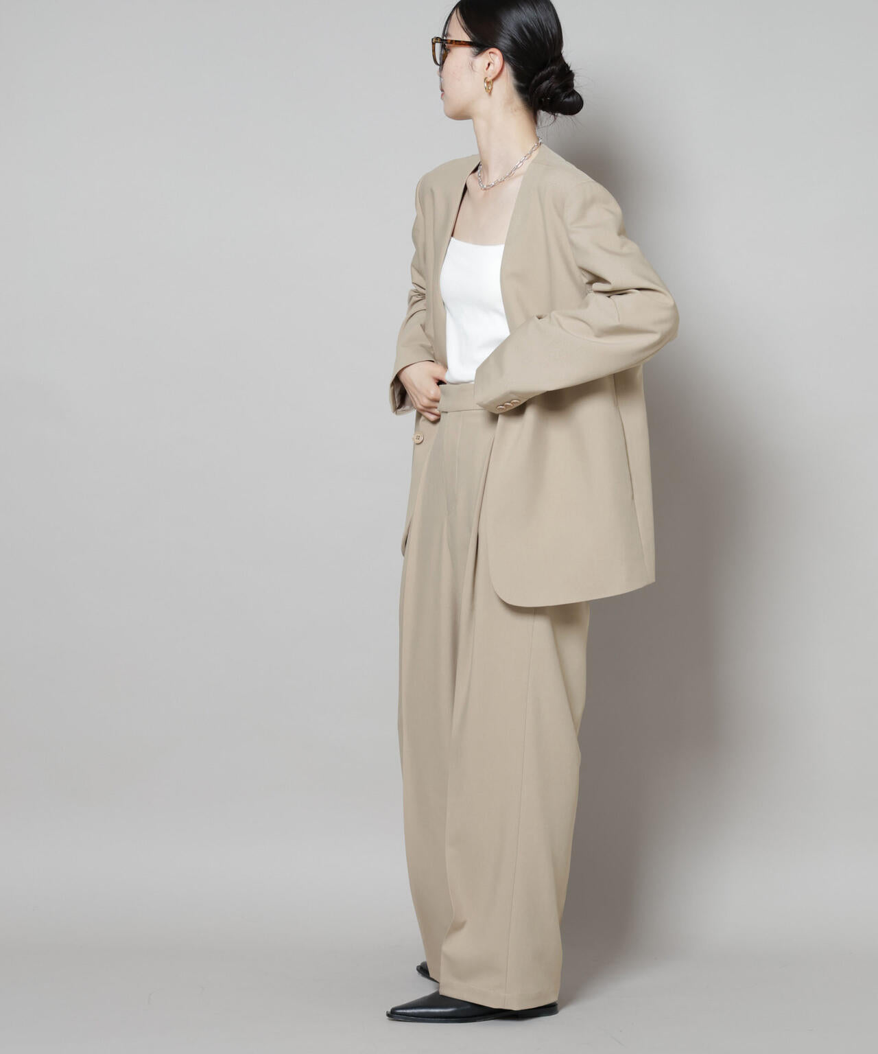 同素材展開のジャケットとのセットアップスタイルもおすすめ