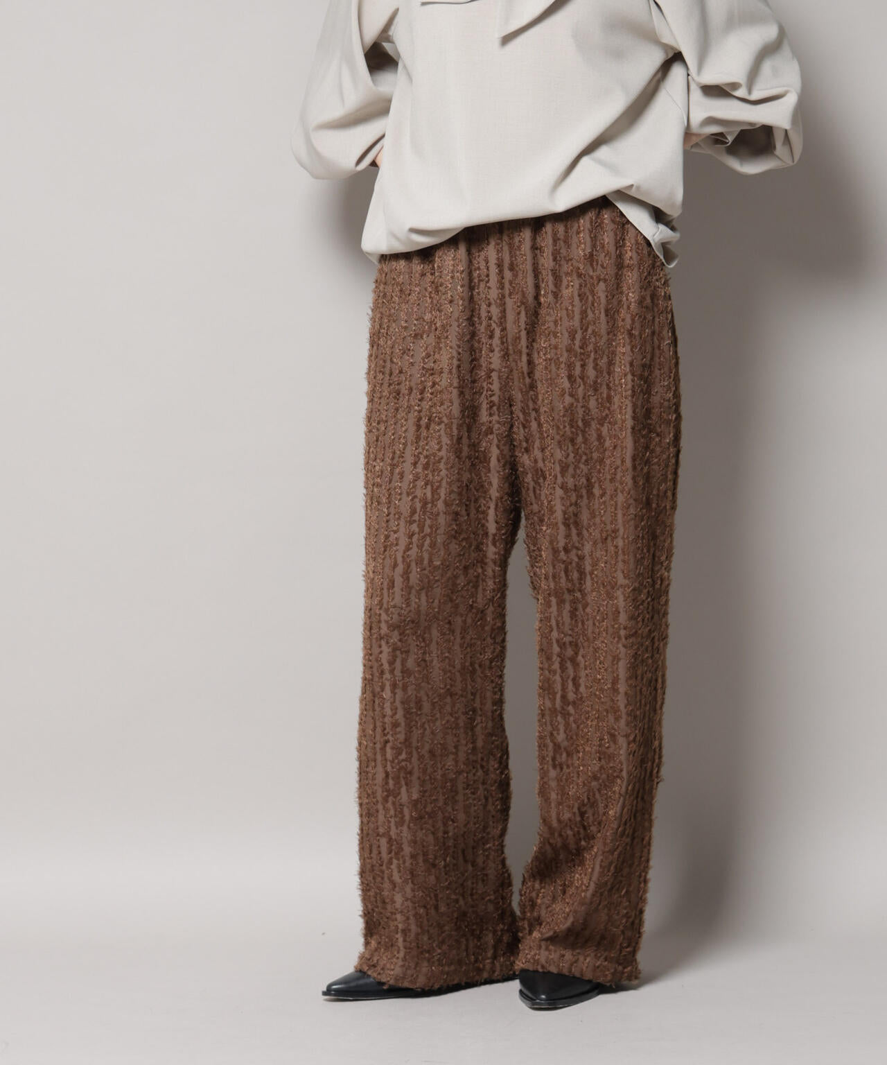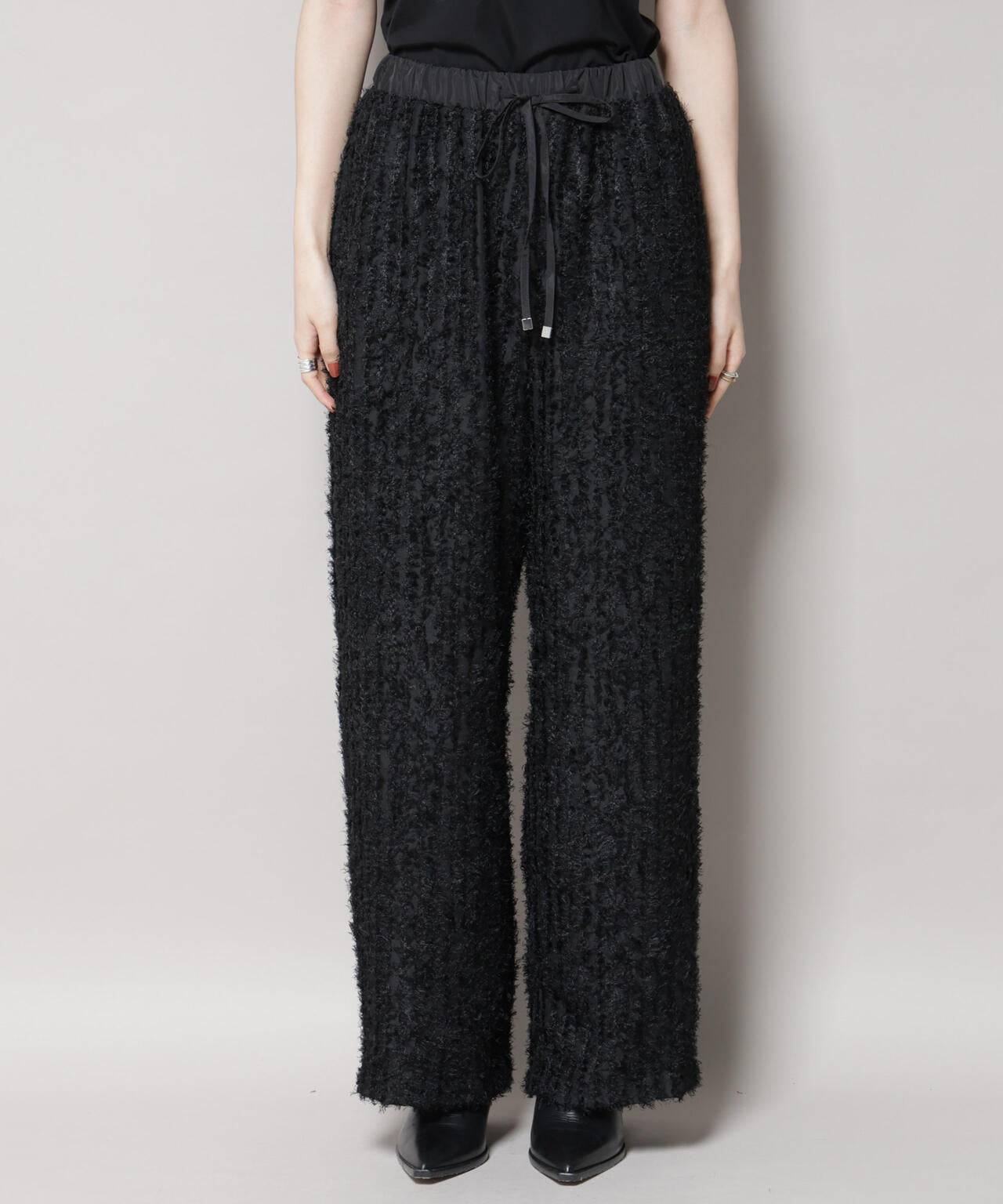 トレンド感のあるフリンジジャガード素材が目を惹くワイドイージーパンツ