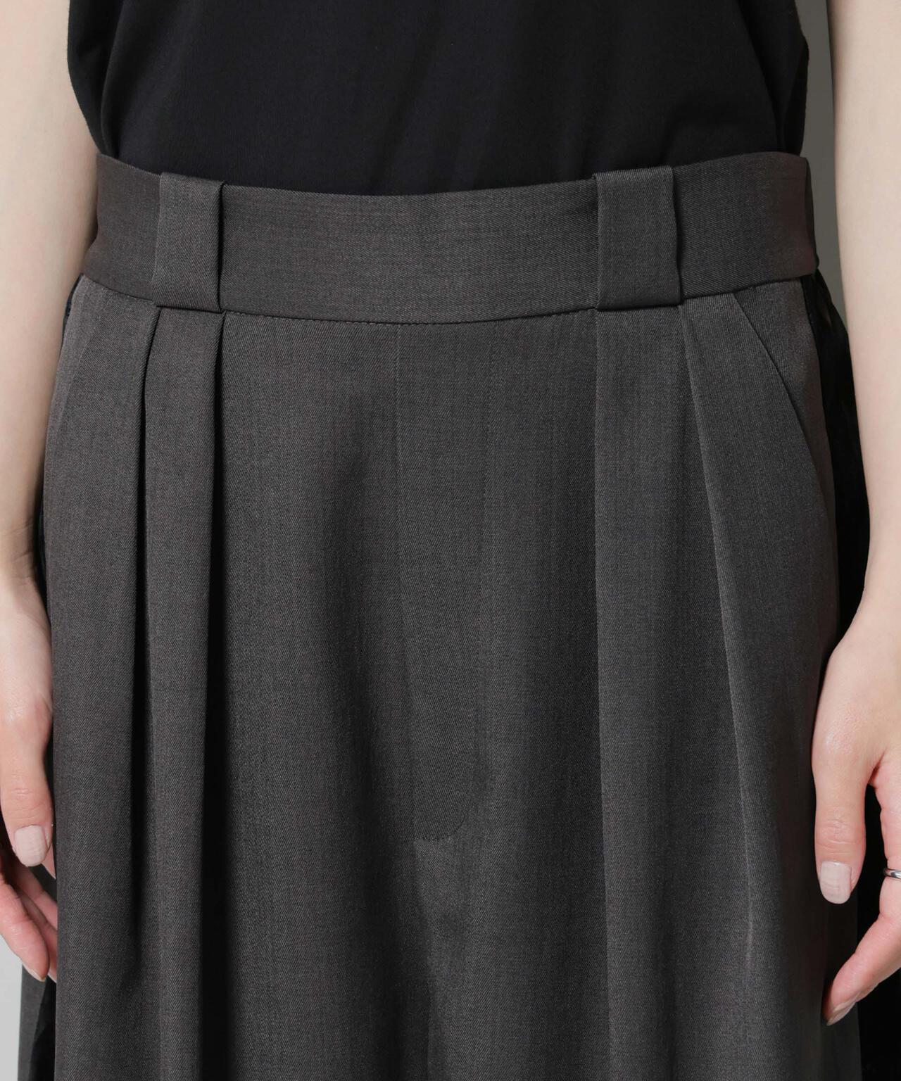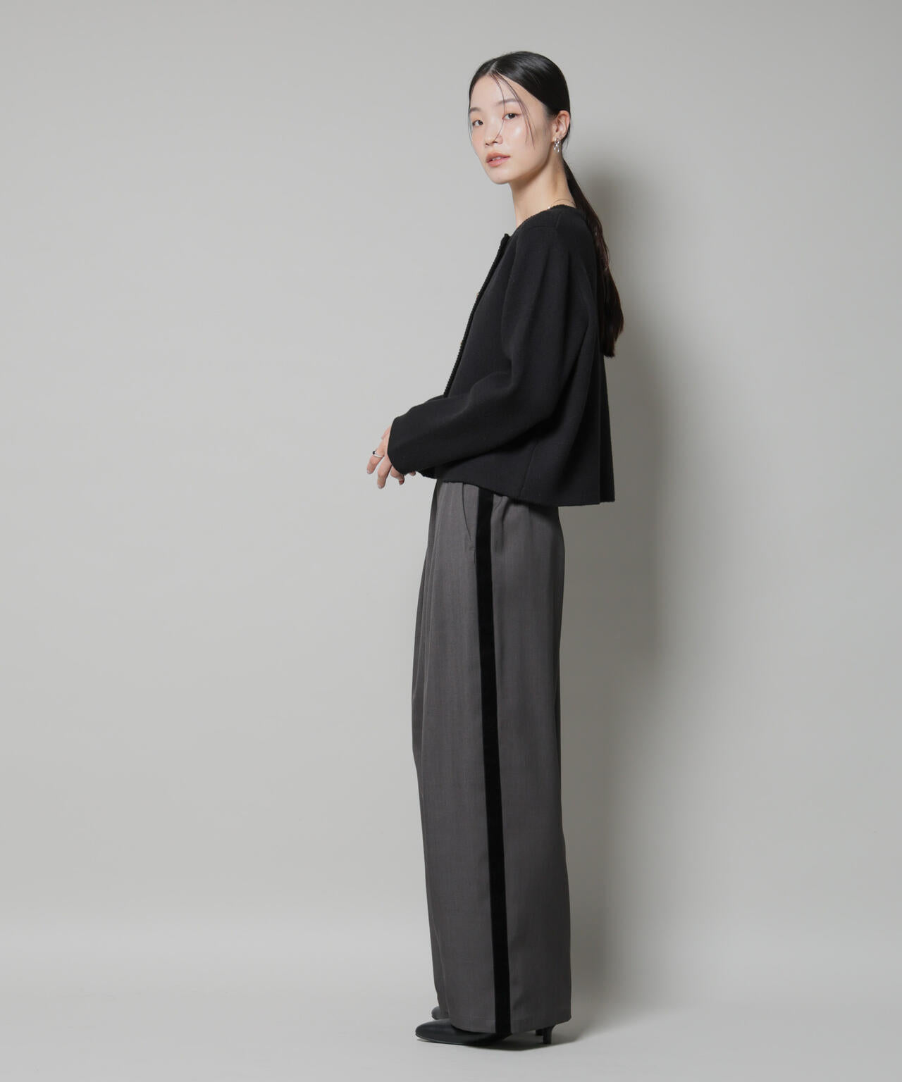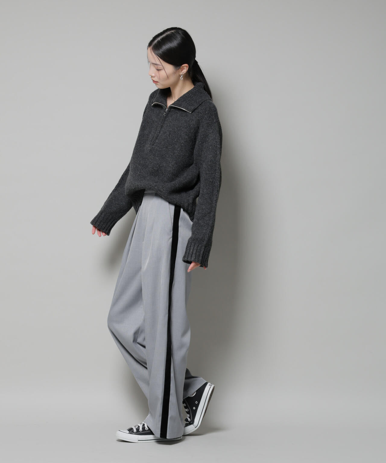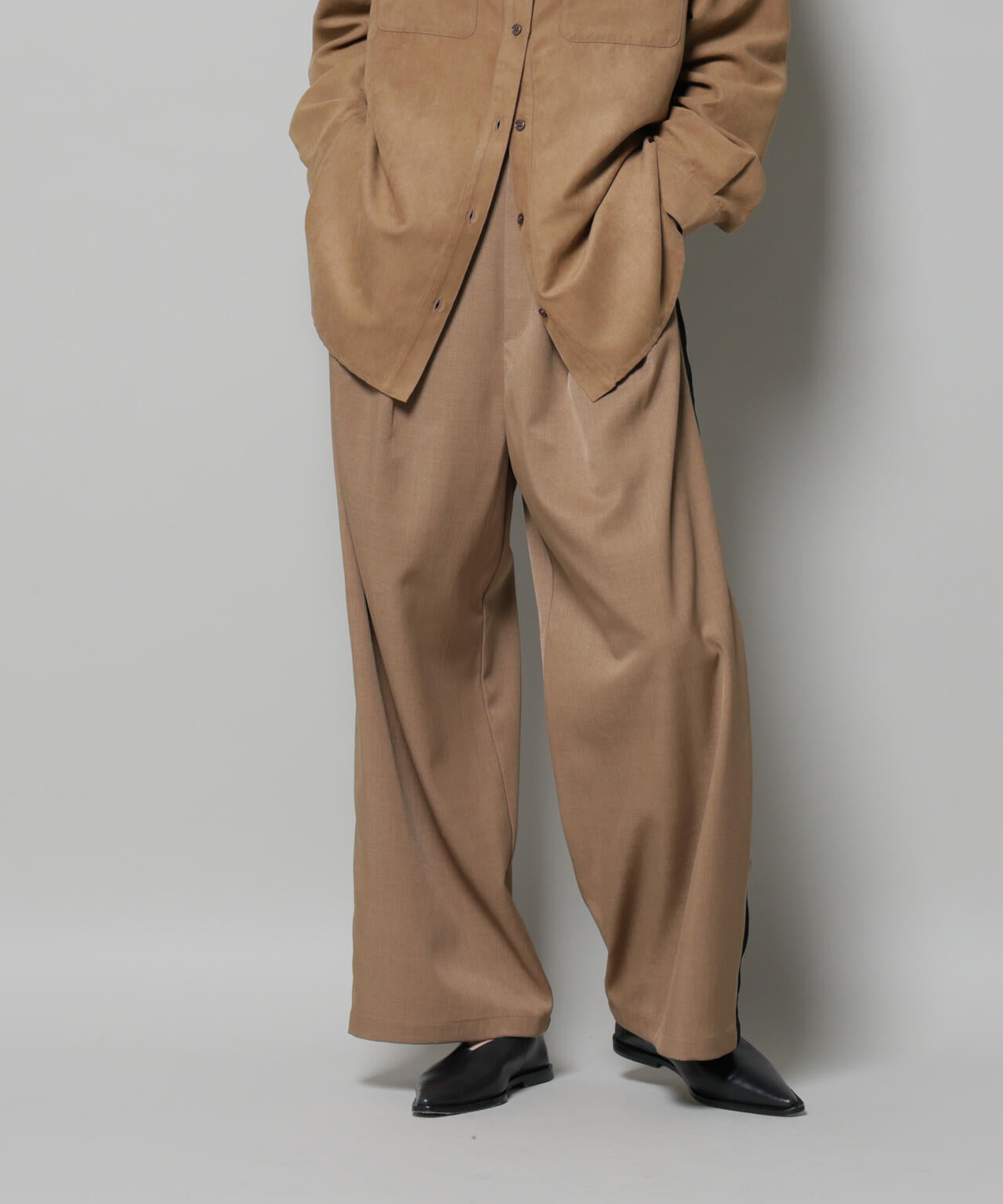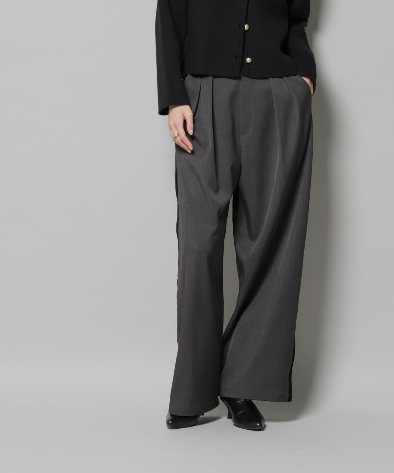 ルーズな抜け感とマニッシュさを持ち合わせたトレンド感あるワイドパンツ。落ち感のある素材とサイドラインが縦のラインを強調しキレイ目なシルエットに。スラック感覚で着用でき、トップスと合わせやすい一着です。