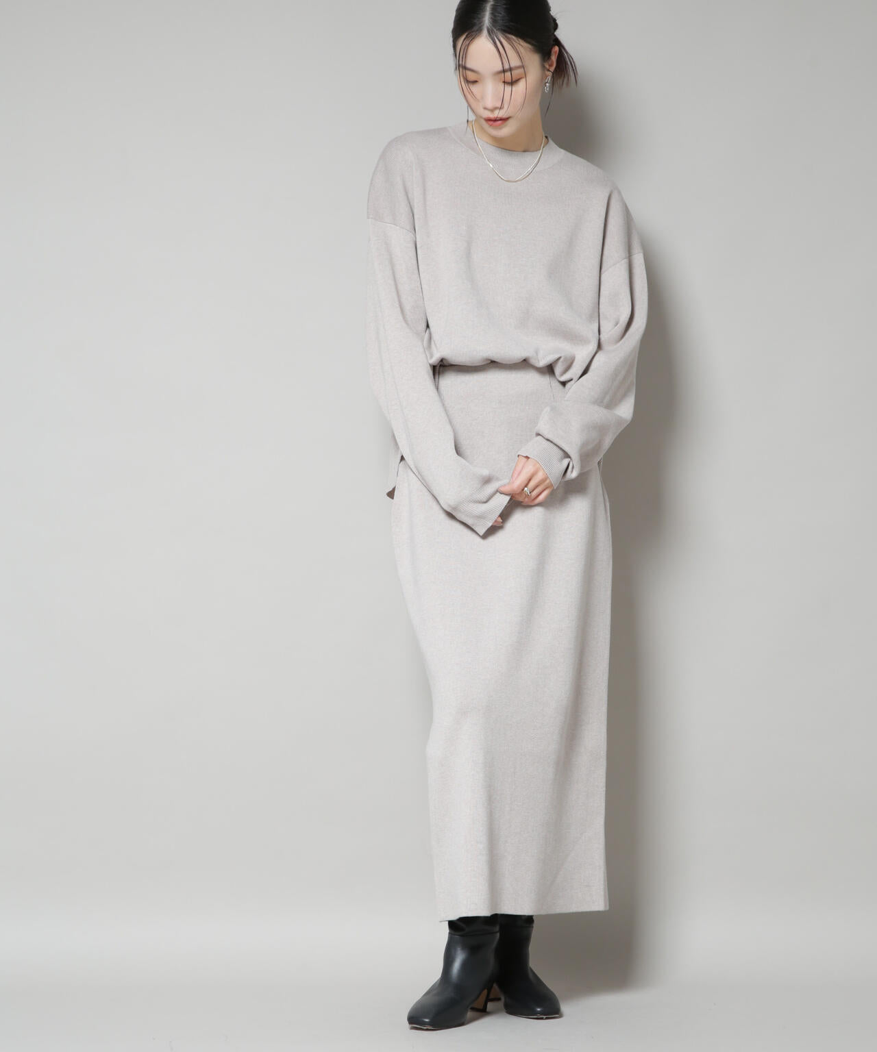・同素材のニットプルオーバーとセットアップコーデもおすすめ