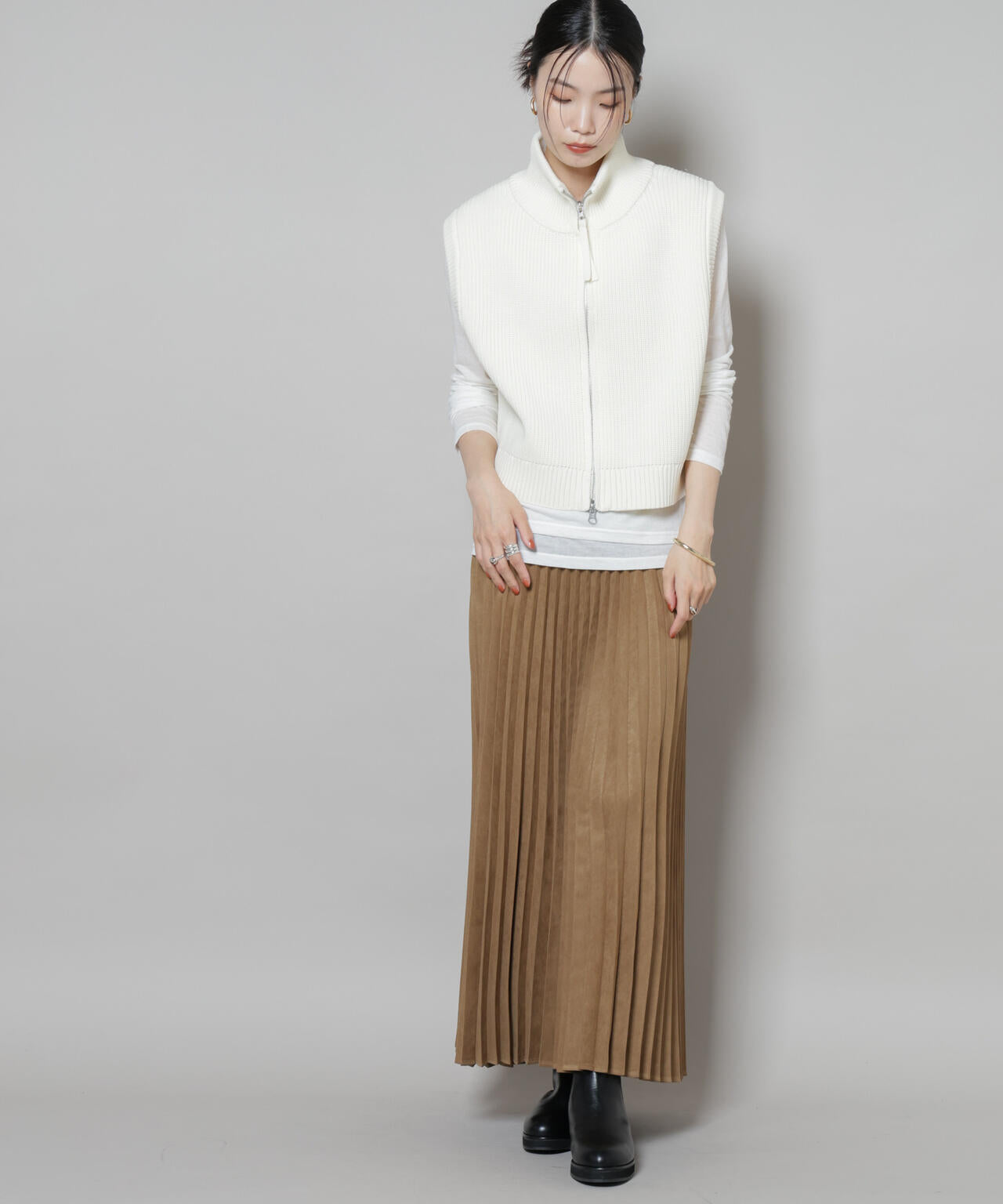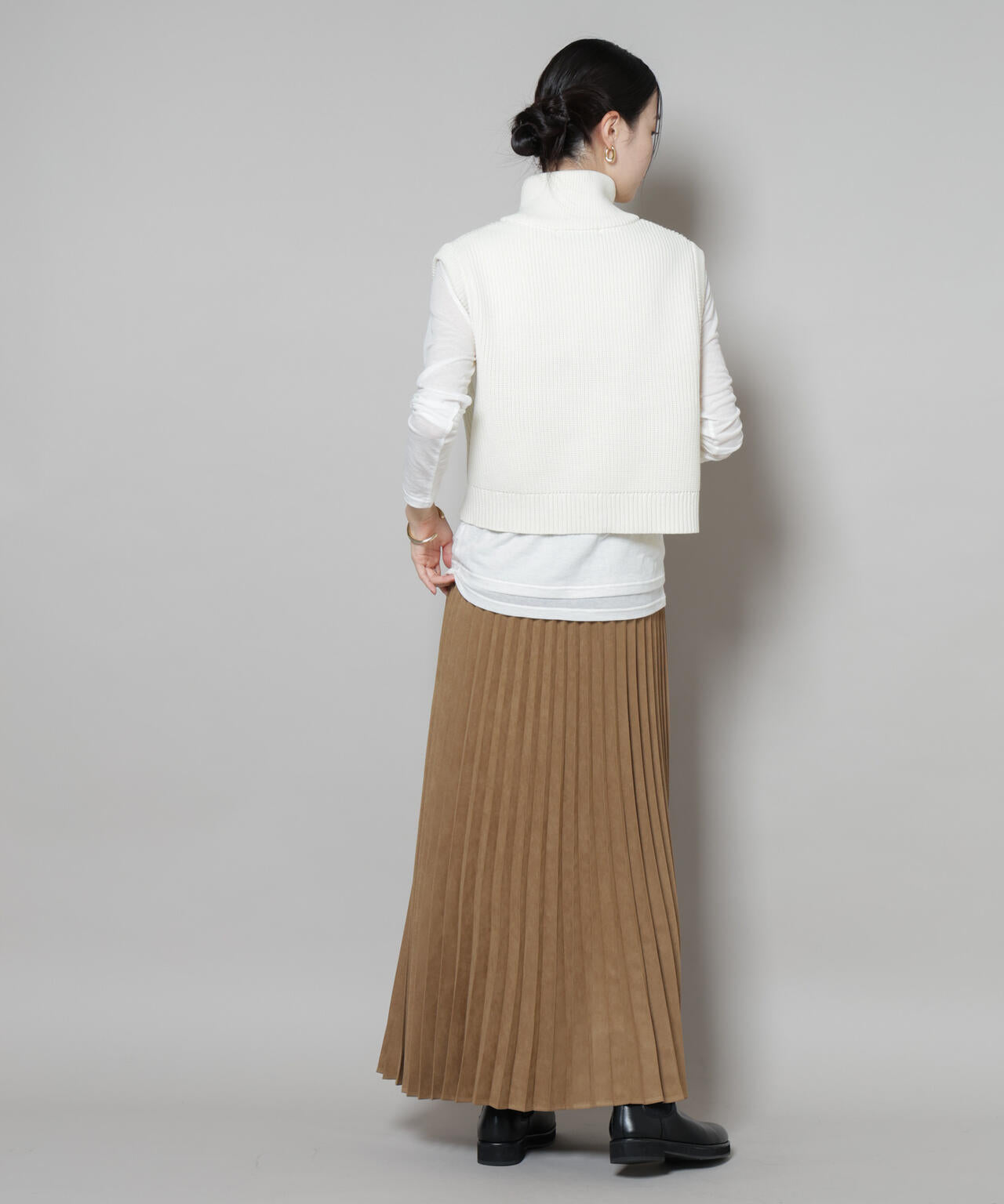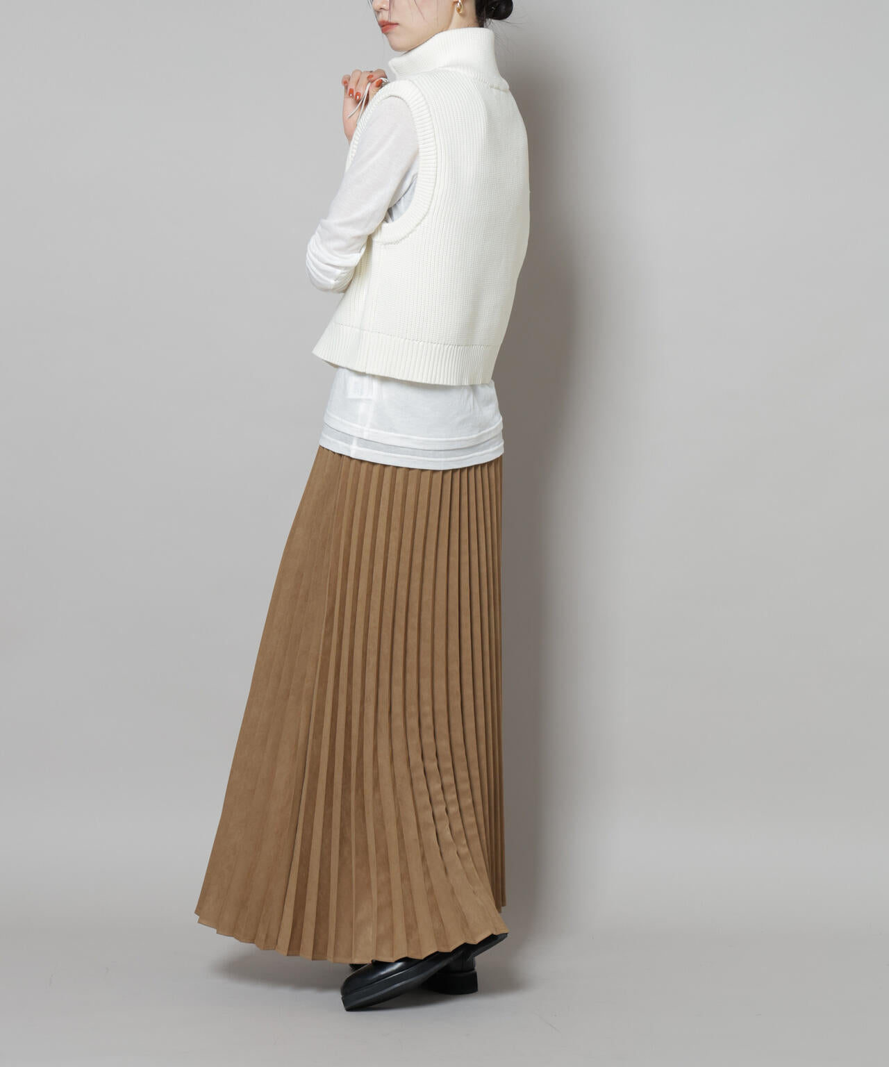 ・大人っぽいカジュアルコーデを楽しめるフェイクスエードプリーツスカート