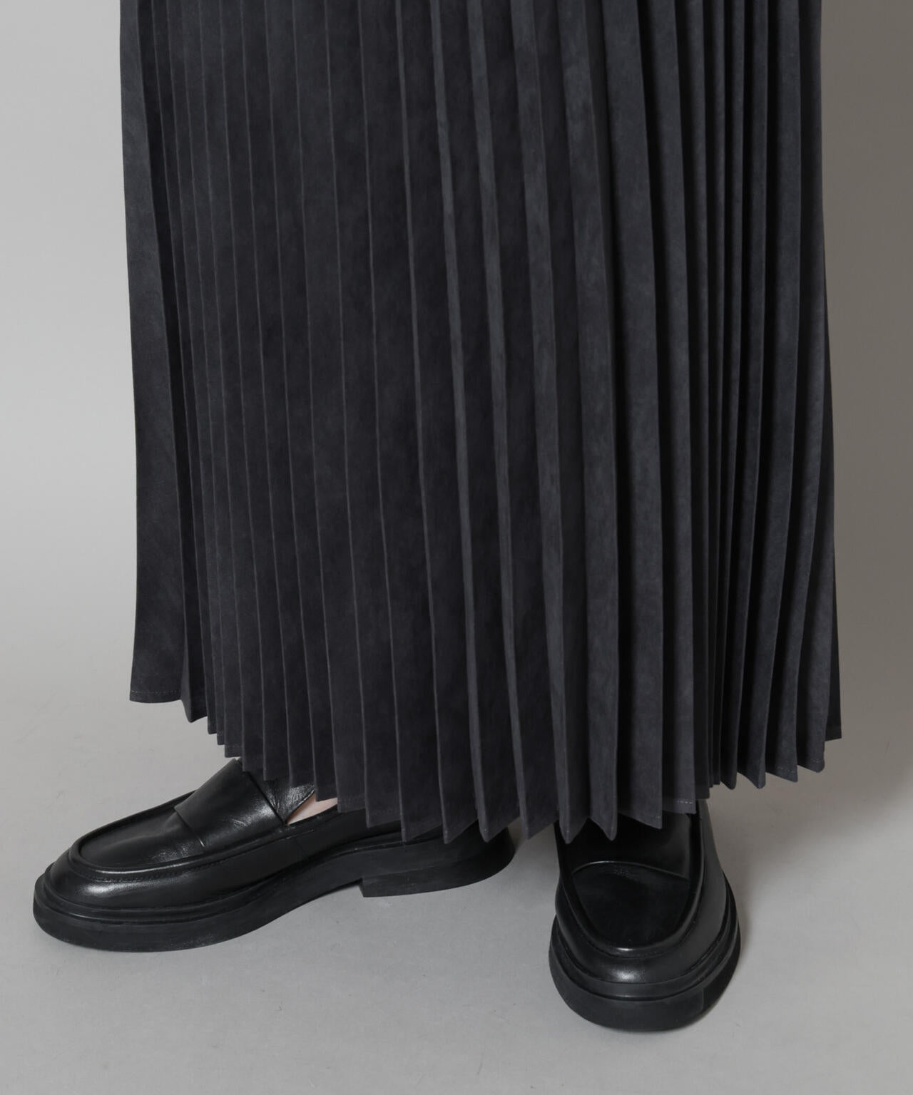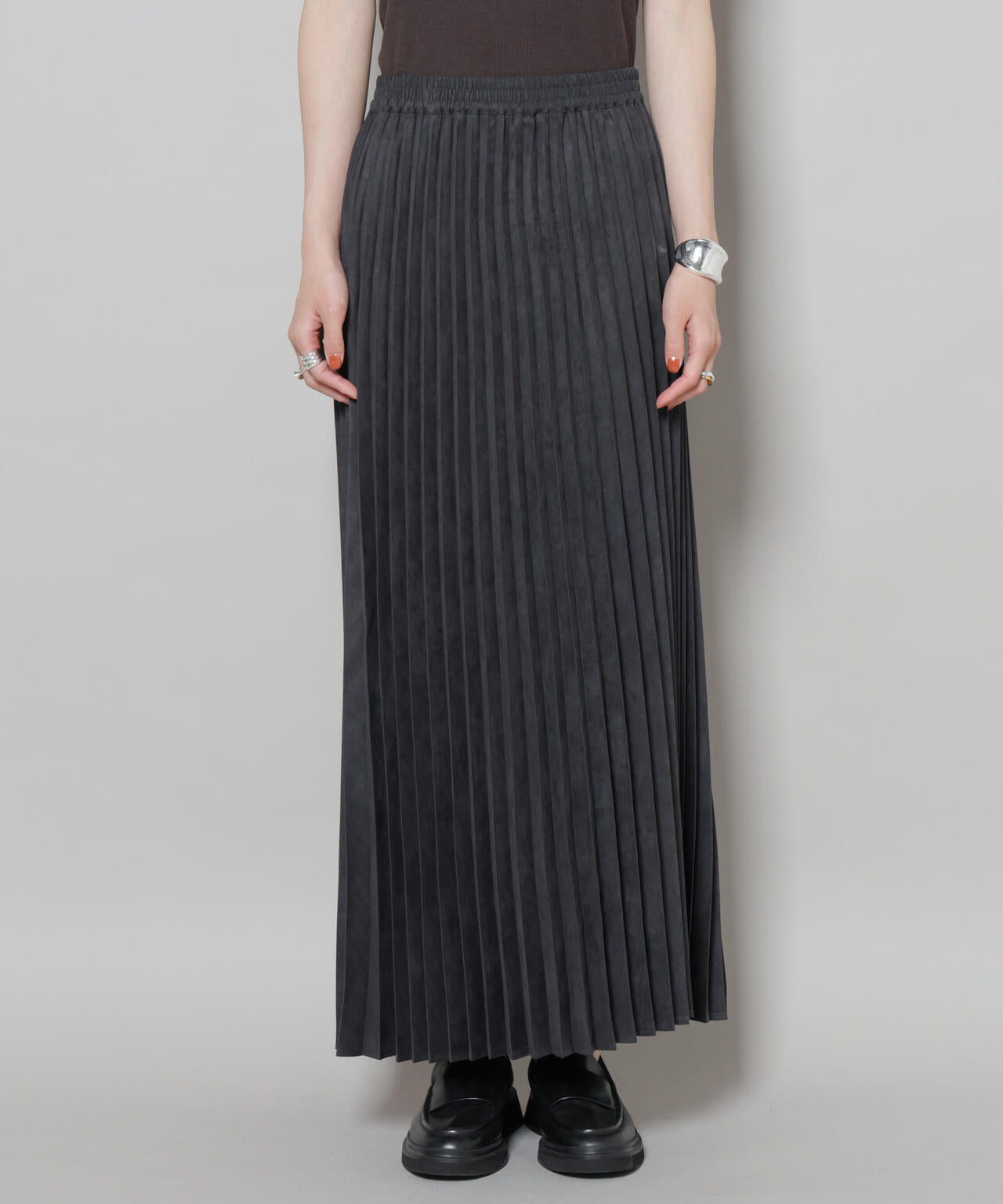 着るだけで今っぽさを纏える、フェイクスエード素材で仕立てたプリーツスカート