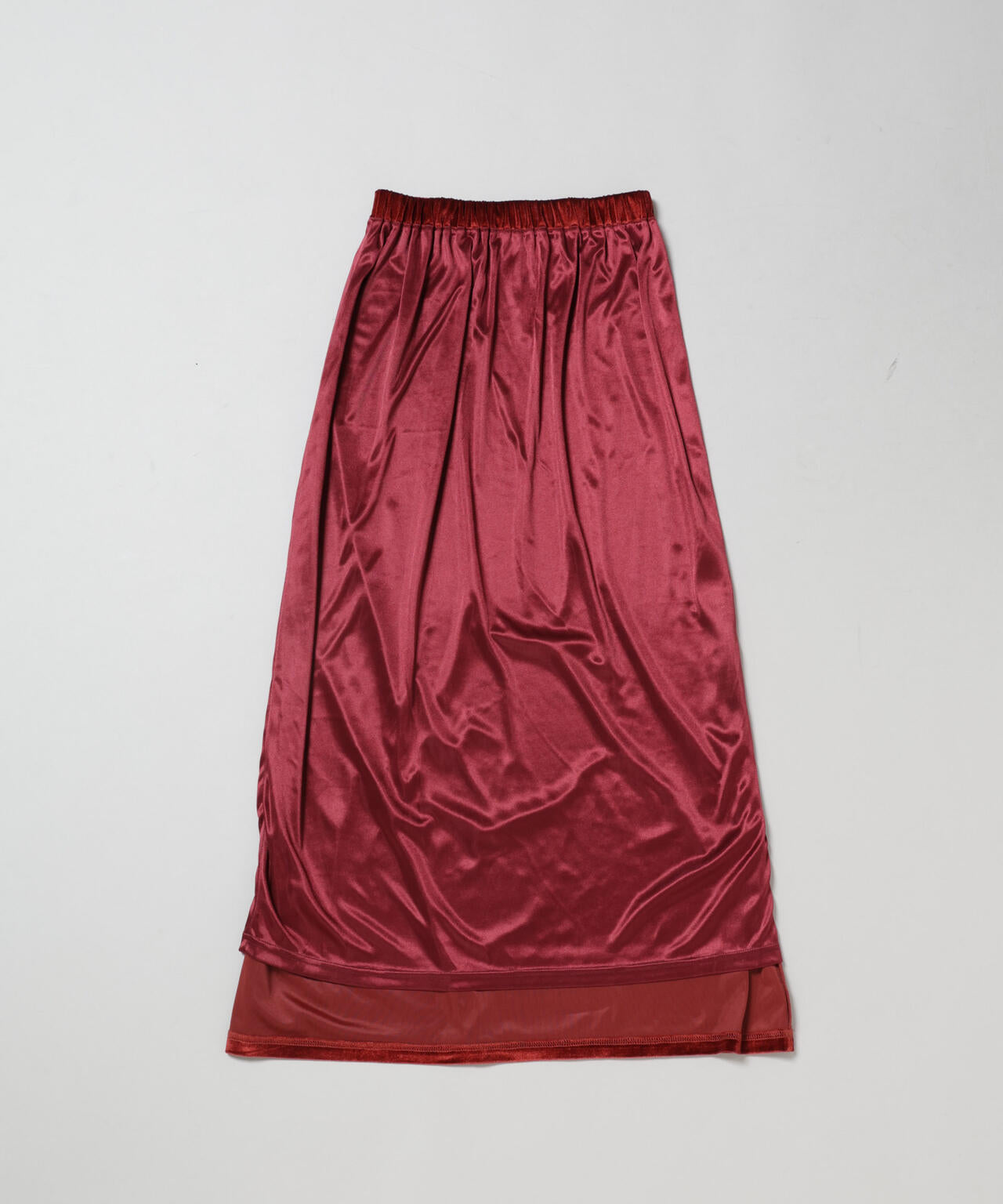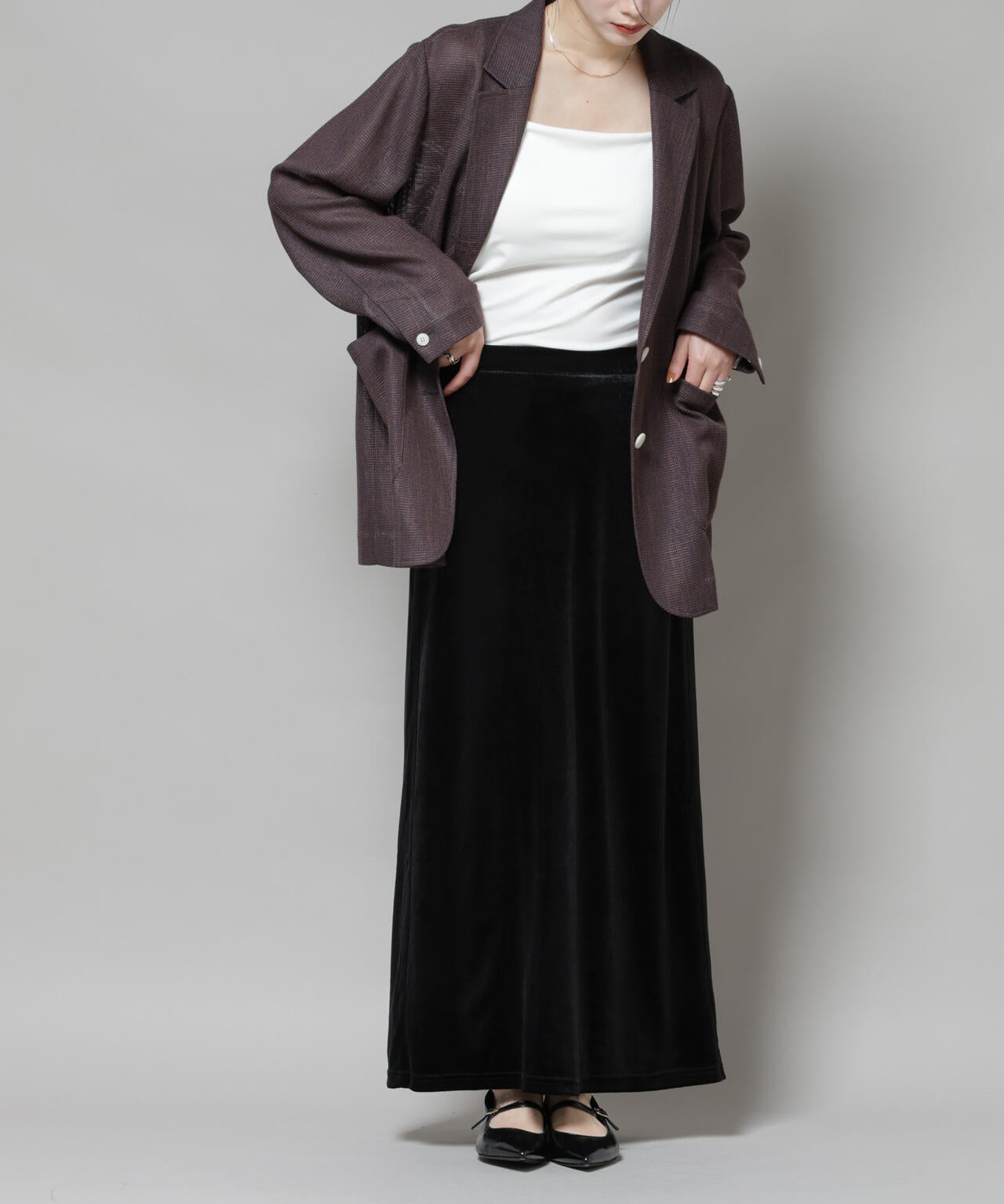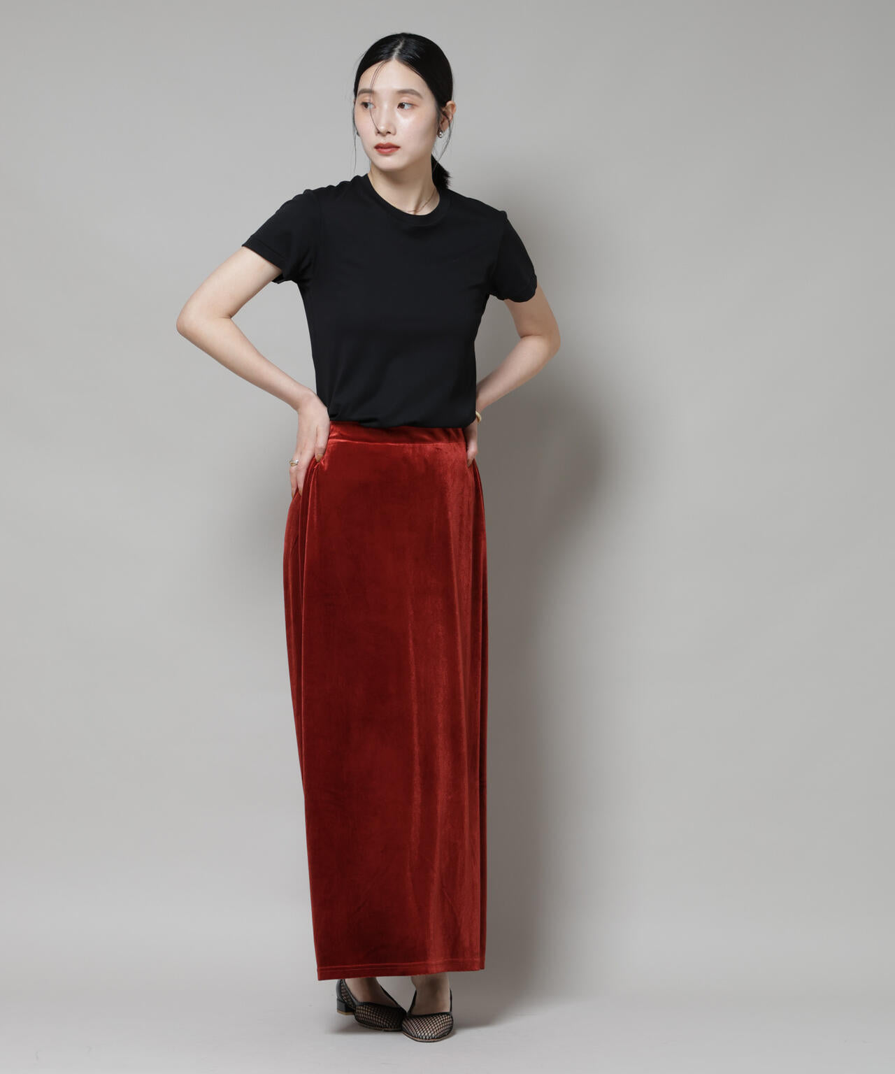 トレンド感あるスタイリングを楽しめる、ベロア素材のカットスカート。上品な素地感なので、あえてカジュアルダウンしたり、同素材のカットトップスと合わせてドレス風の着こなしも素敵です。