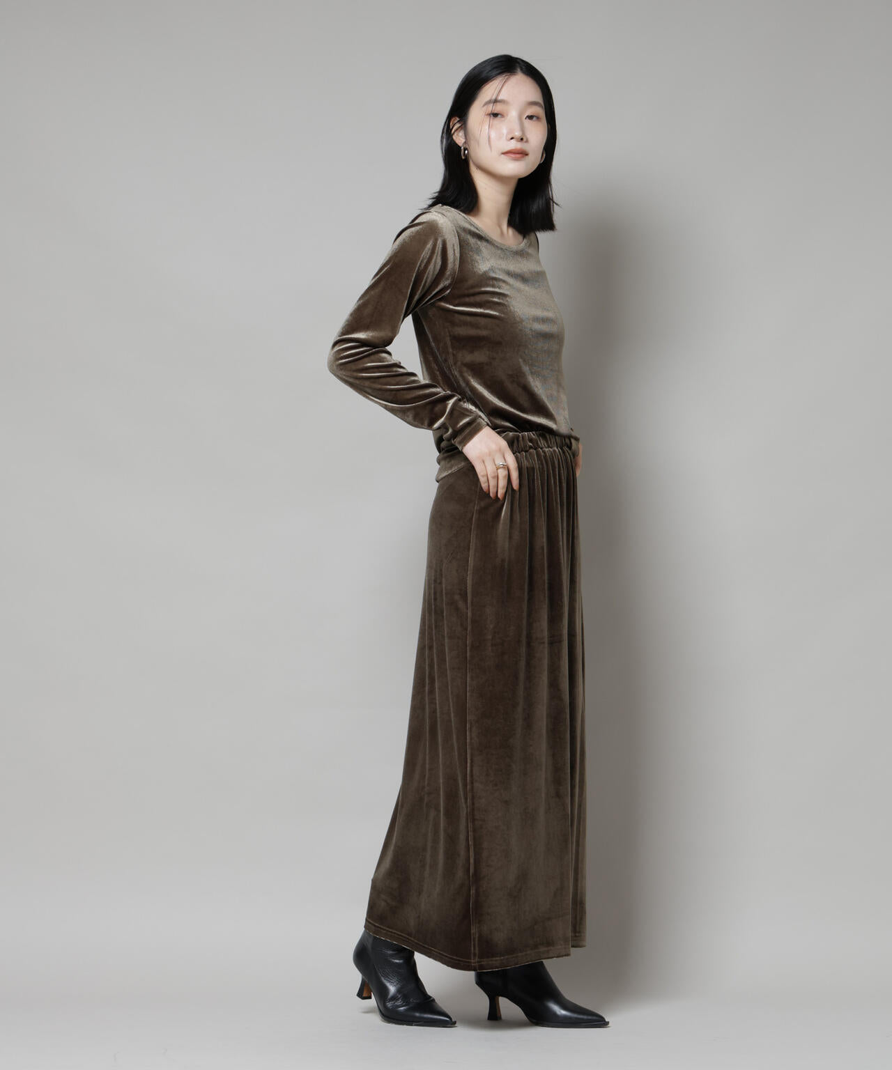 ・同素材のカットトップスと合わせて、ベロアドレス風の着こなしも◎