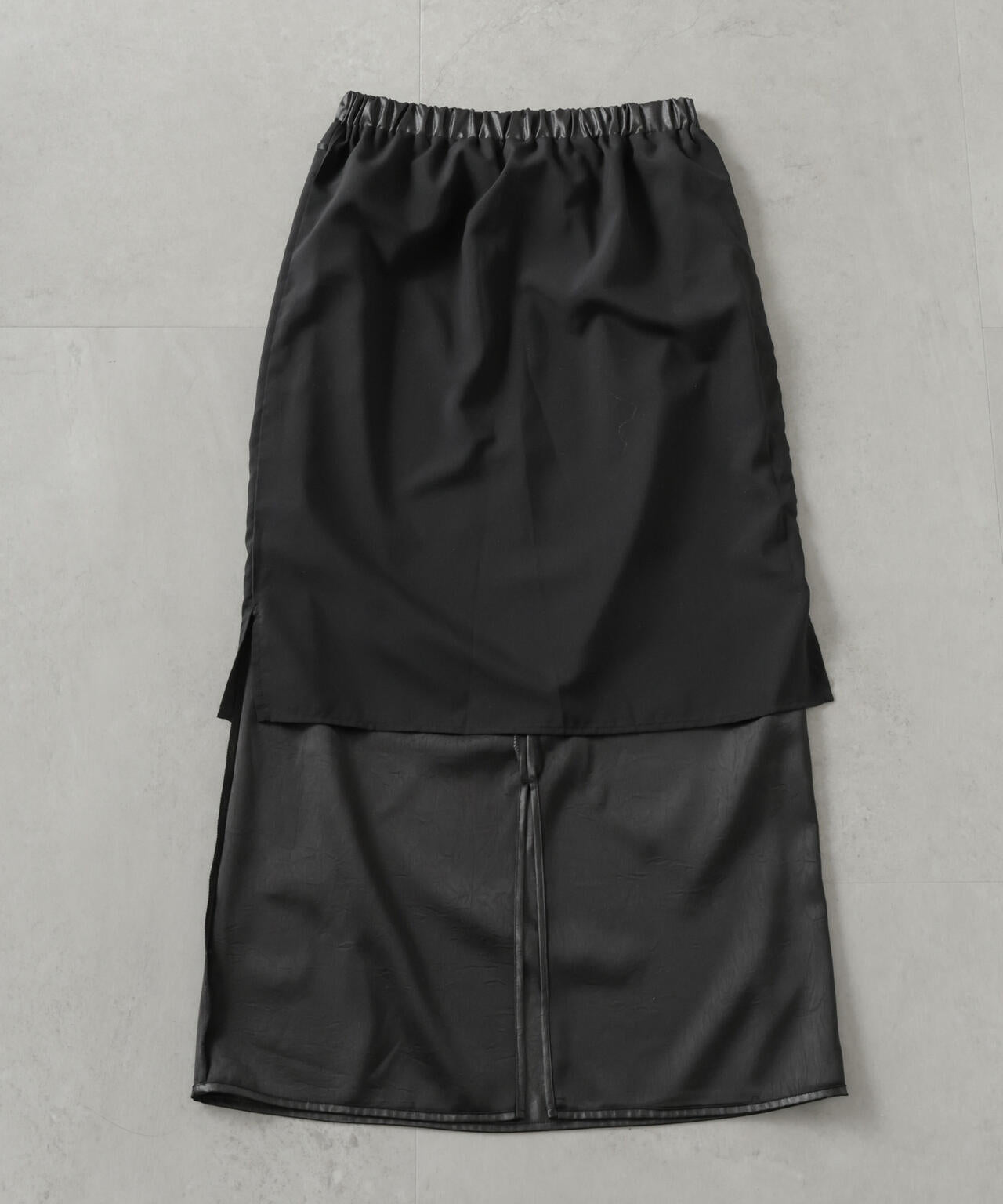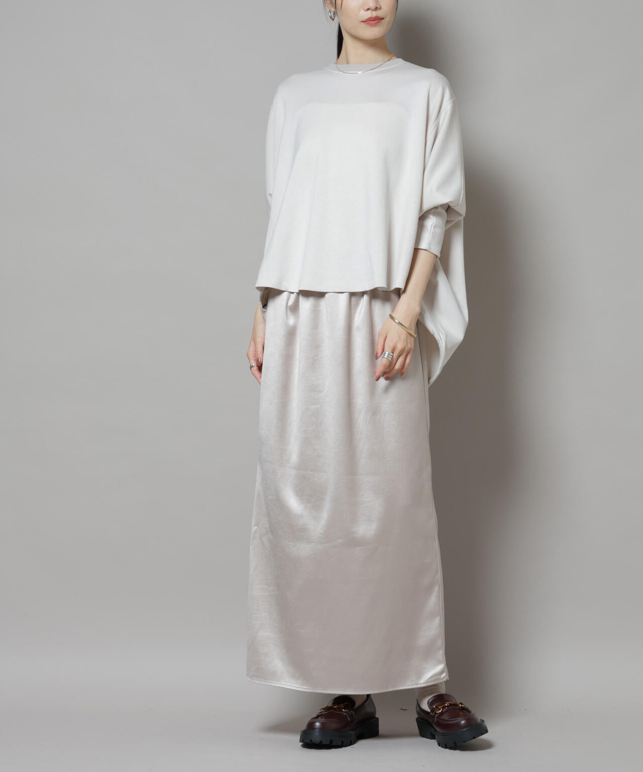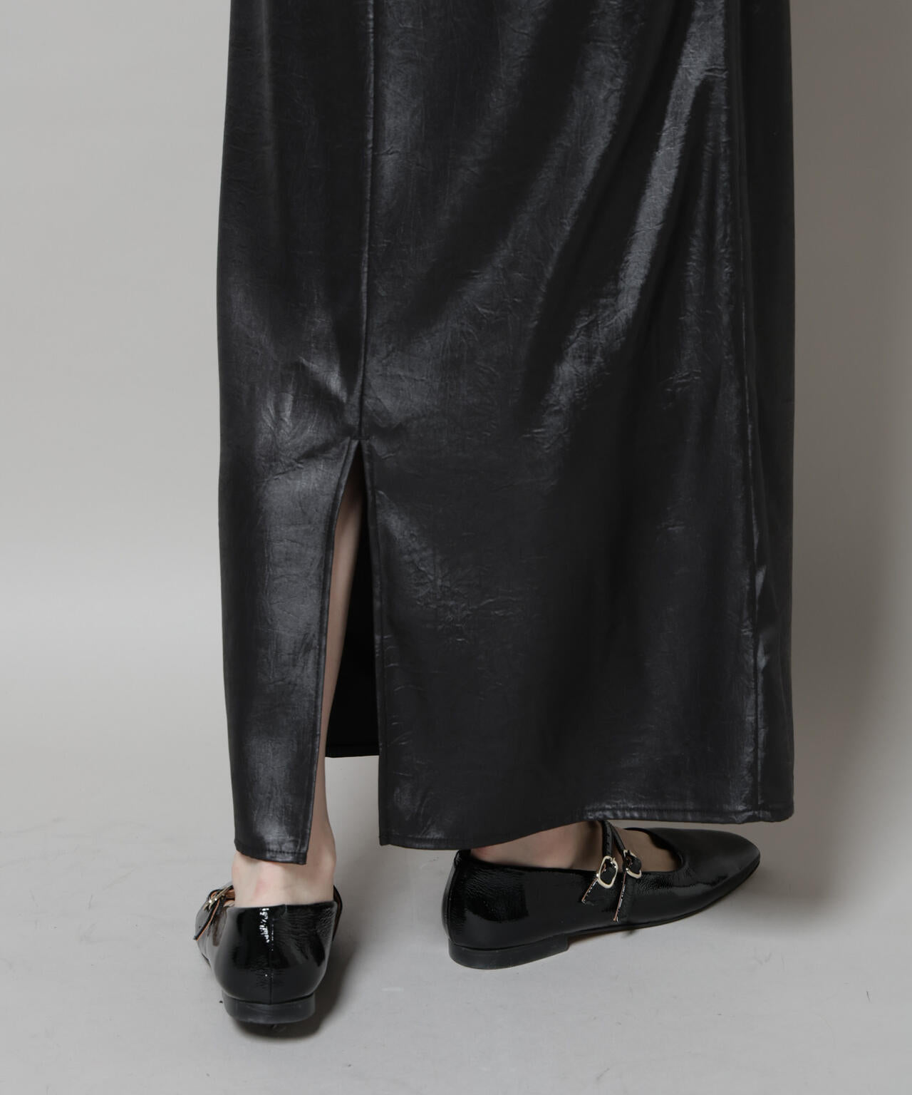 レザーライクな微光沢が大人っぽい印象のロングスカート