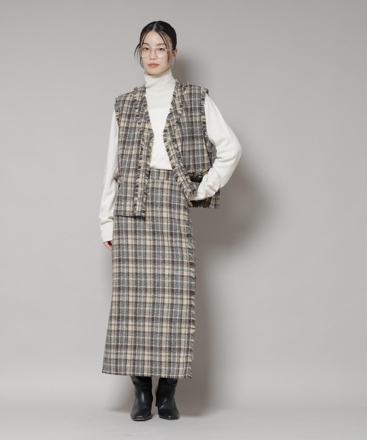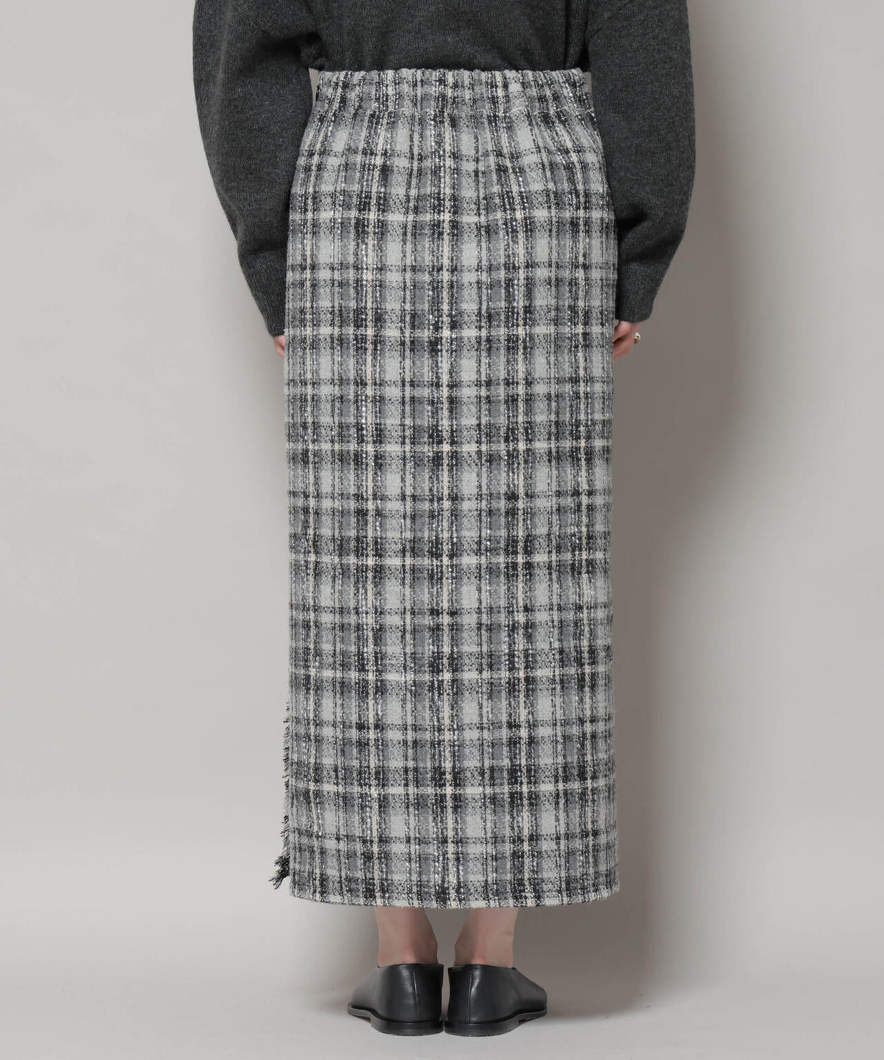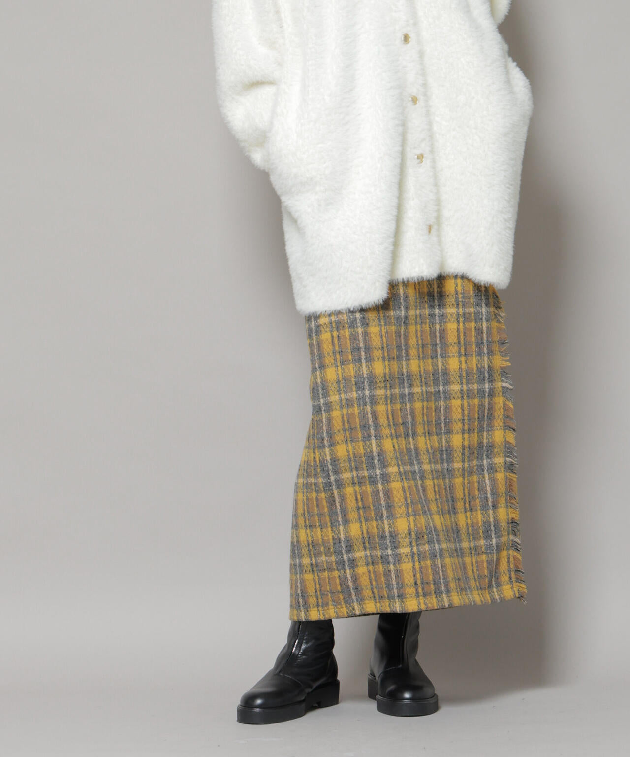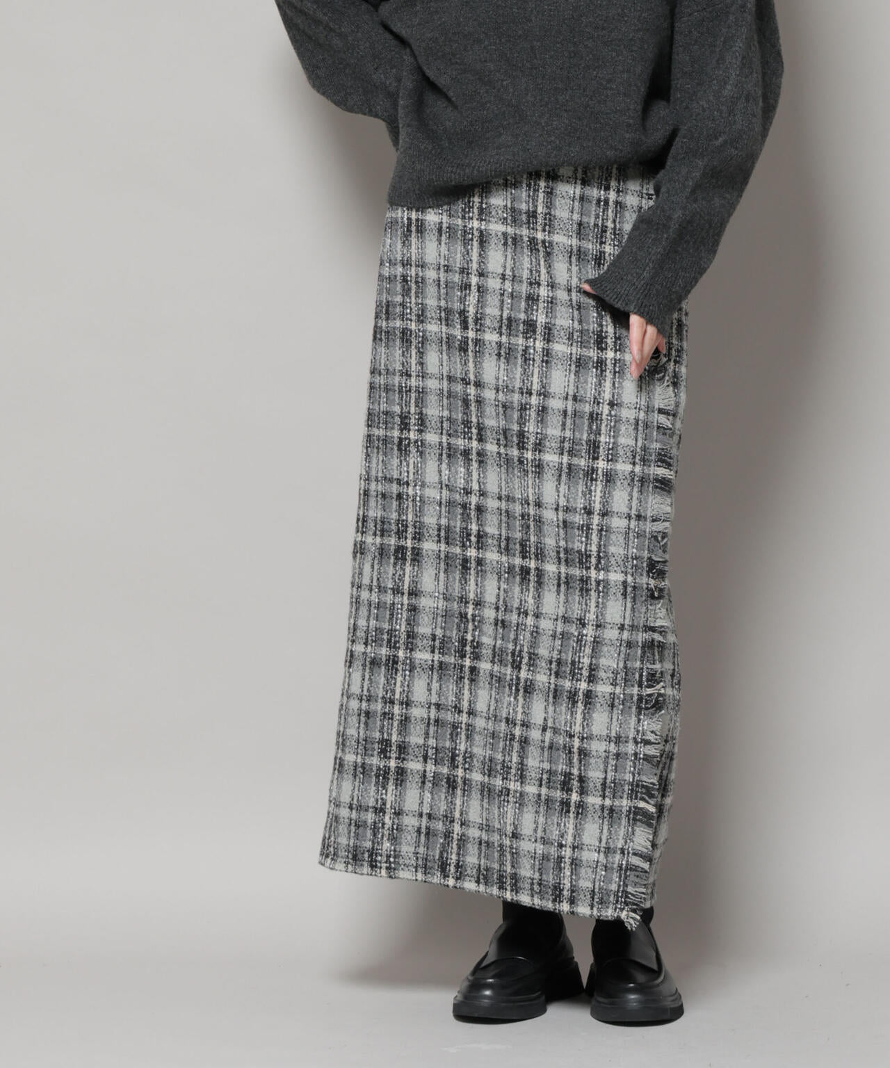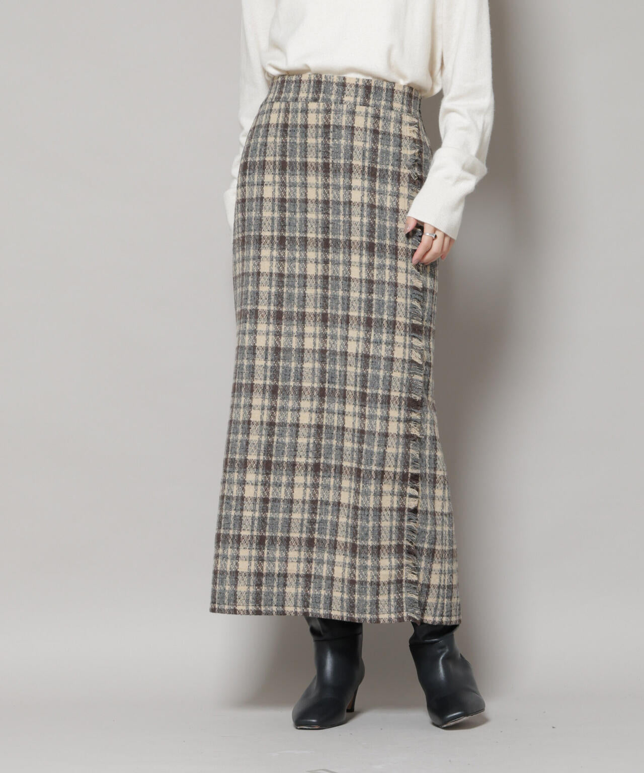 秋めくチェック柄が印象的なIラインスカート。縦に入ったフリンジがデザイン性とスタイルアップを実現。シンプルなトップスと合わせるだけでサマになる主役のデザインです。