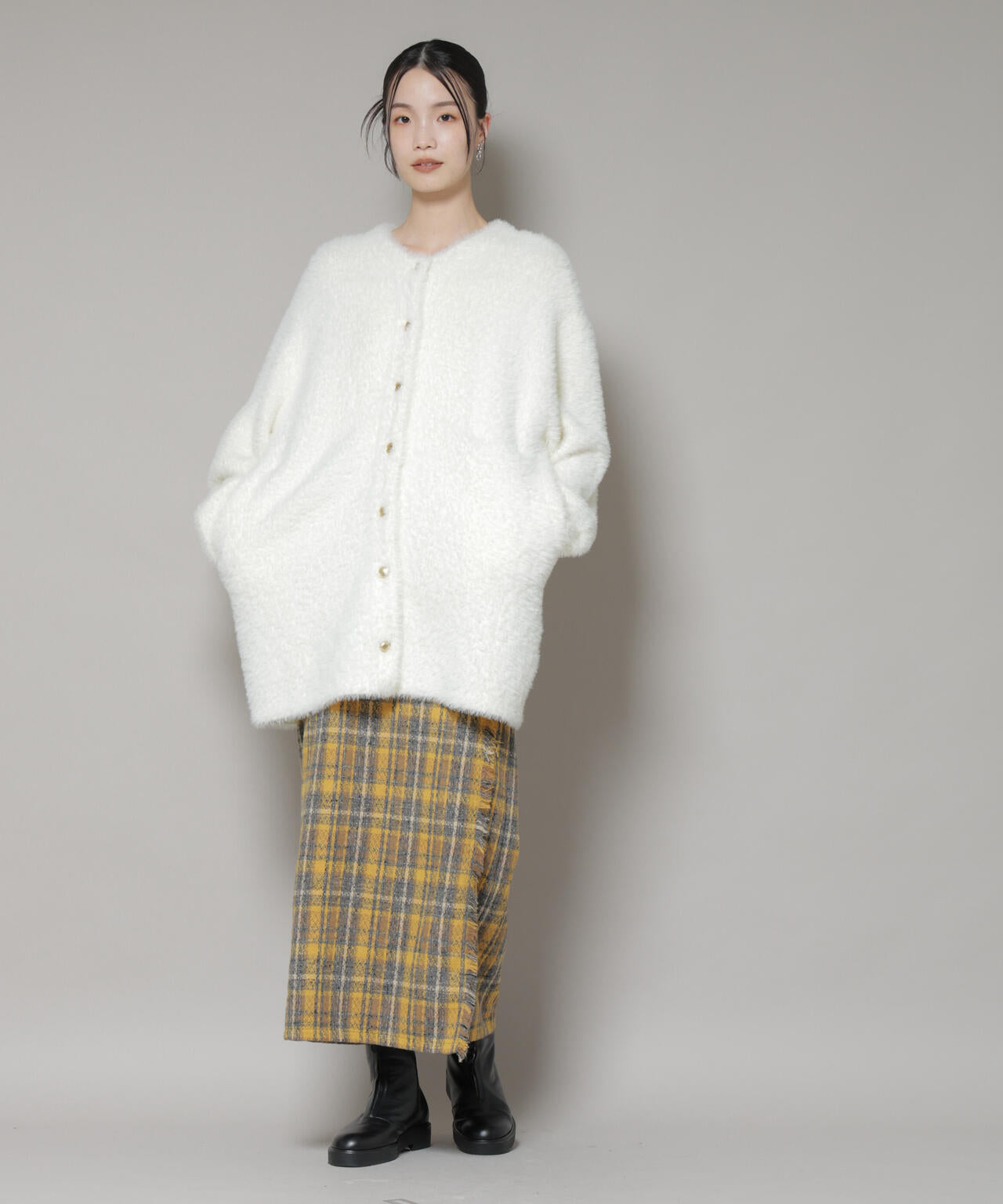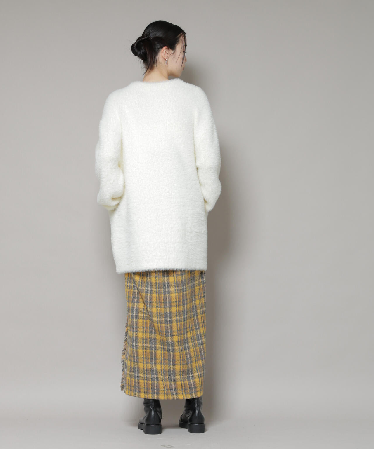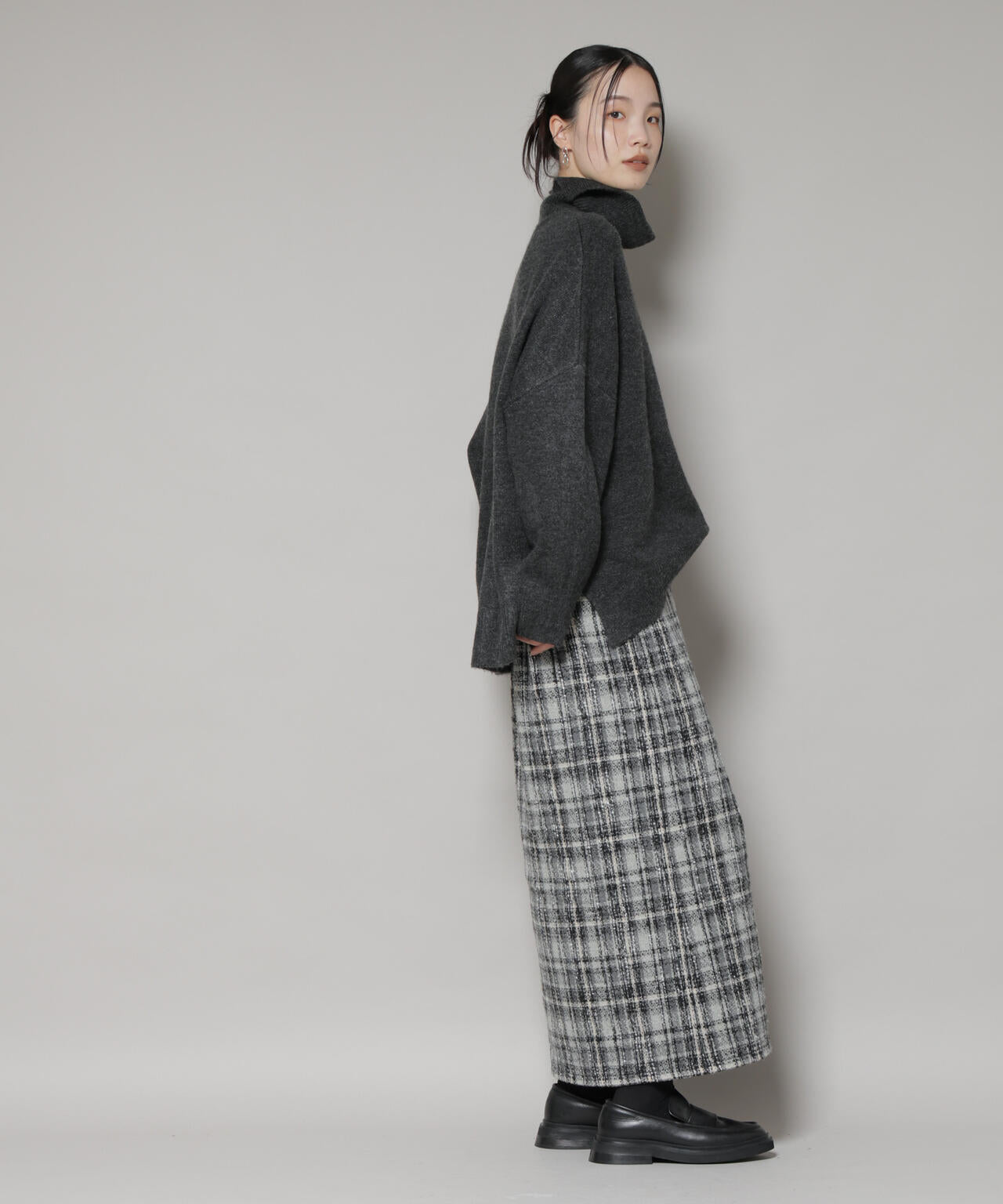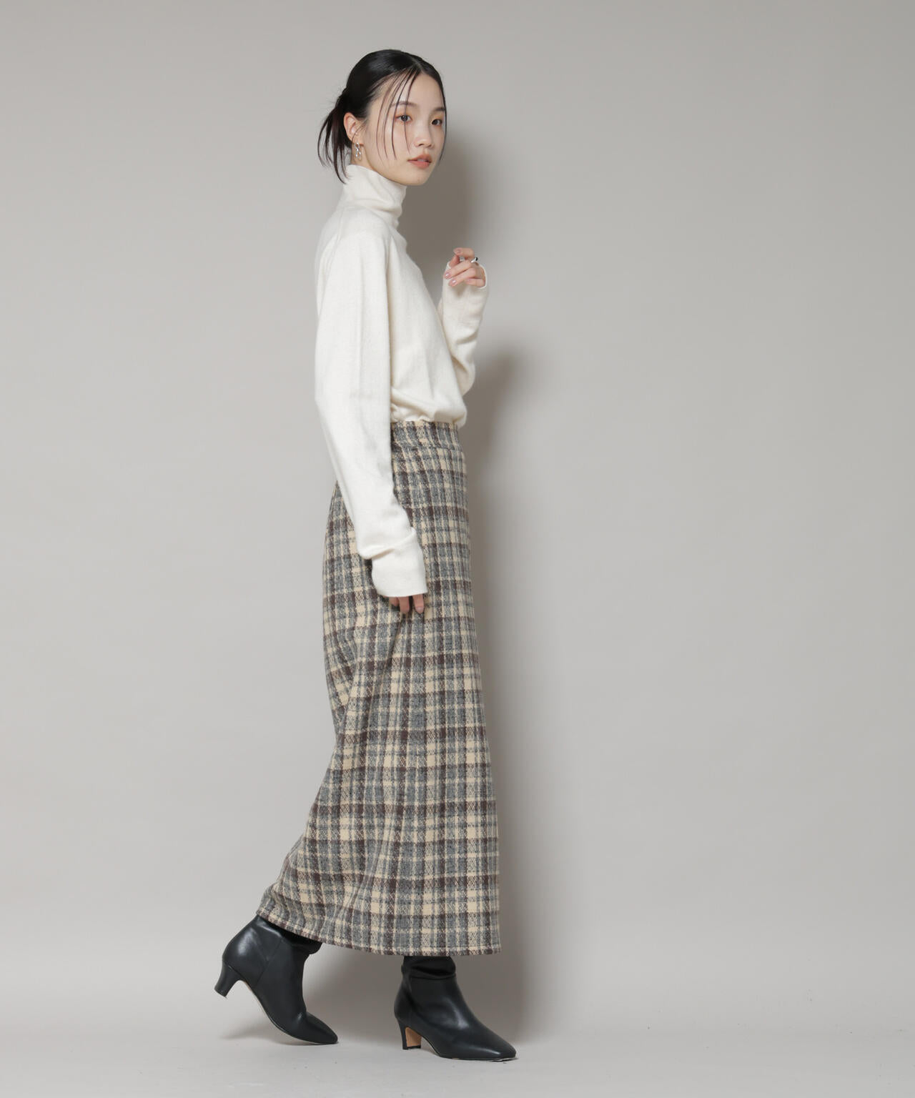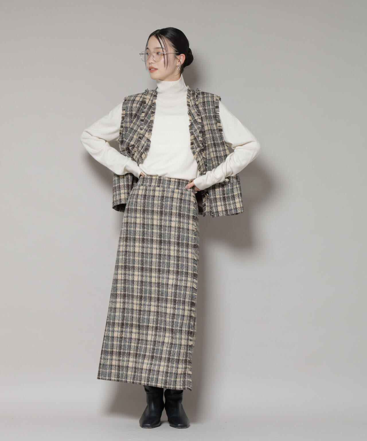 秋めくチェック柄が印象的なIラインスカート。縦に入ったフリンジがデザイン性とスタイルアップを実現。シンプルなトップスと合わせるだけでサマになる主役のデザインです。