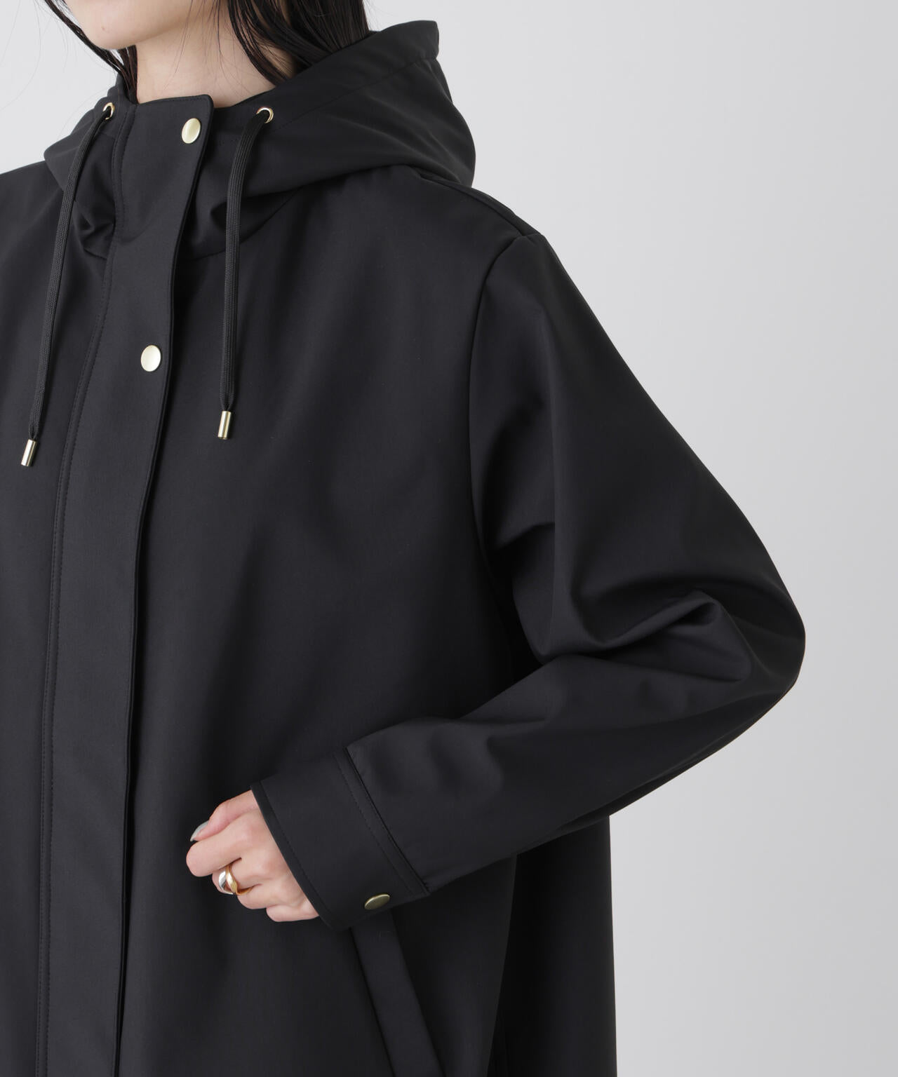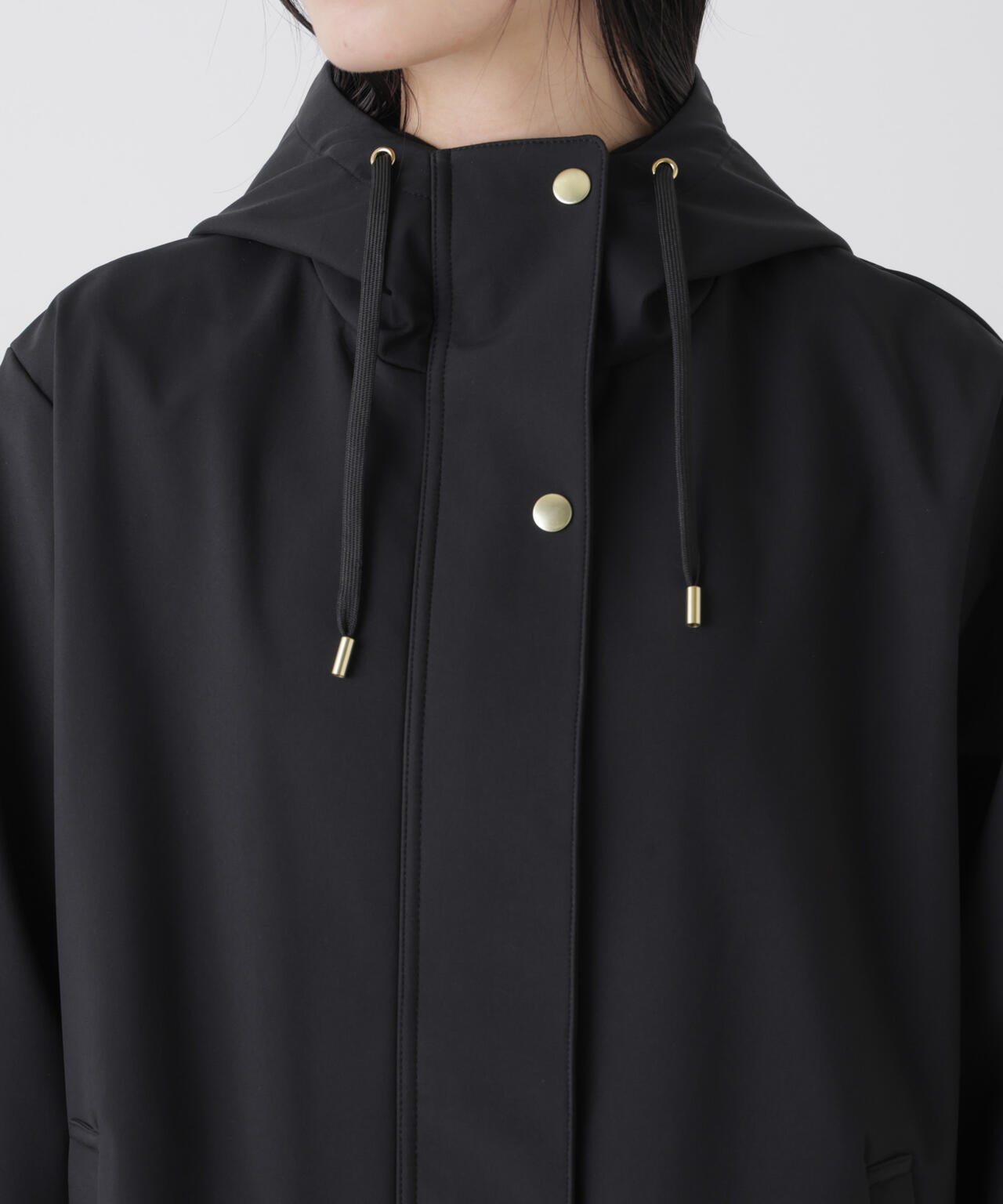 撥水&花粉ガードシリーズのフードブルゾン。撥水加工を施した高機能を備えており、天候を気にせず着用できるのも魅力。裾のドロストも調節できるので、Aラインにしたり裾を絞ったり、様々なシルエットの変化を楽しめる一枚です。