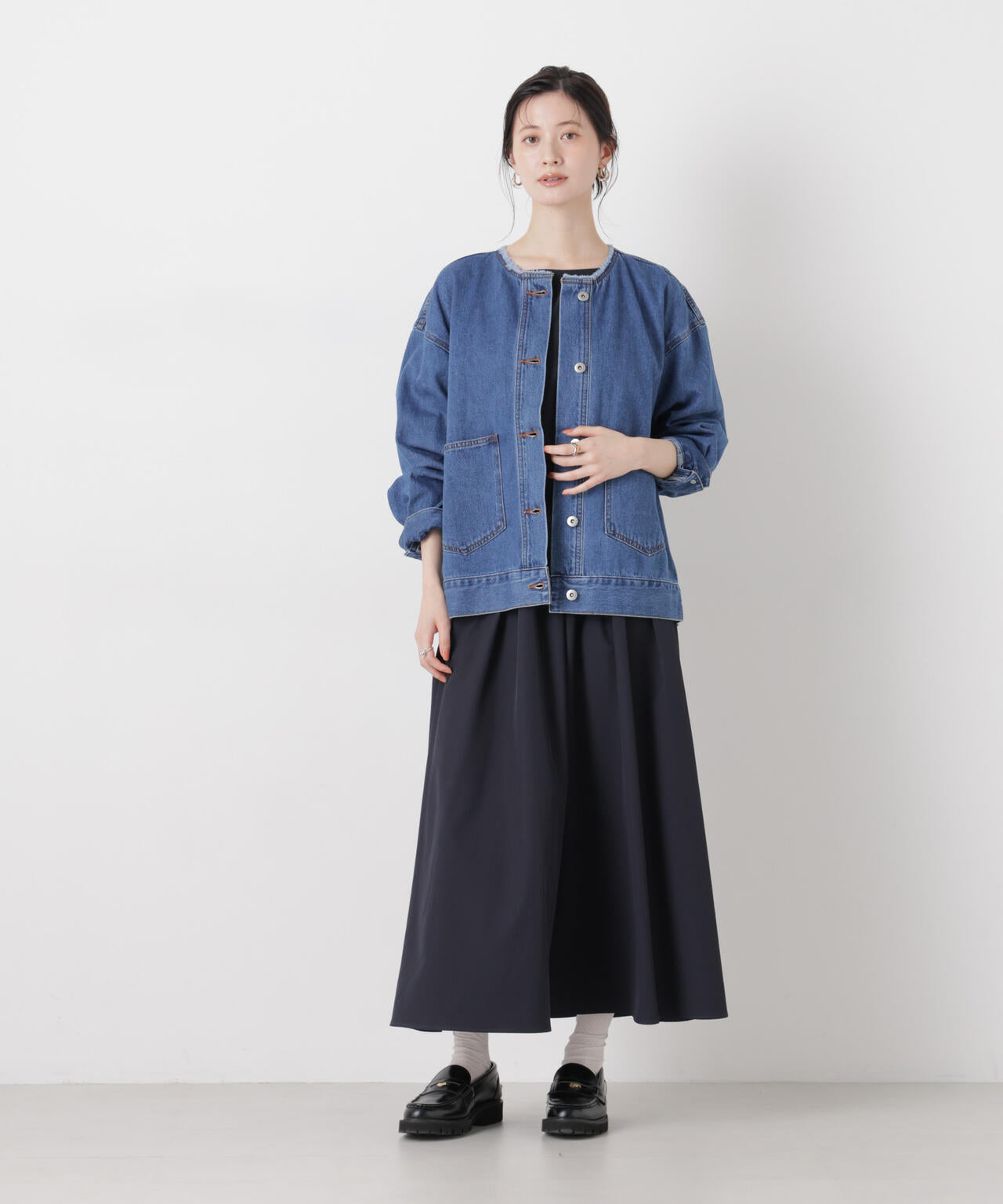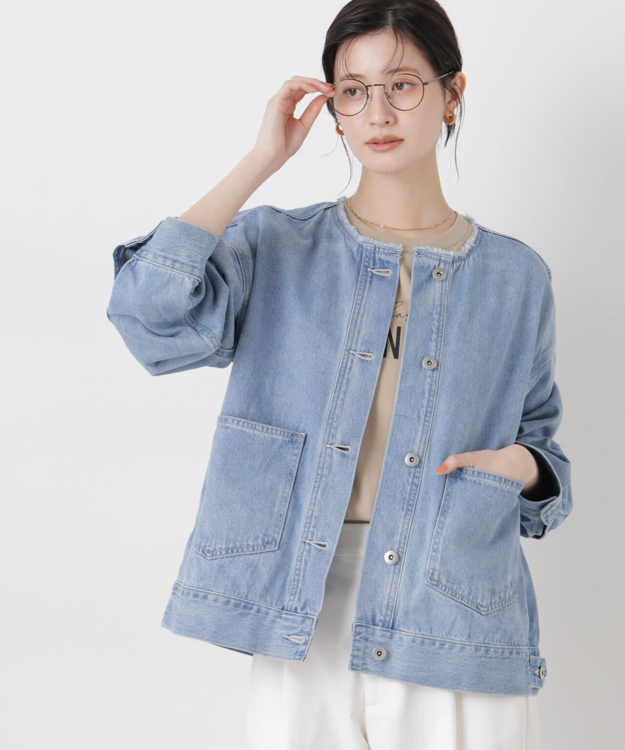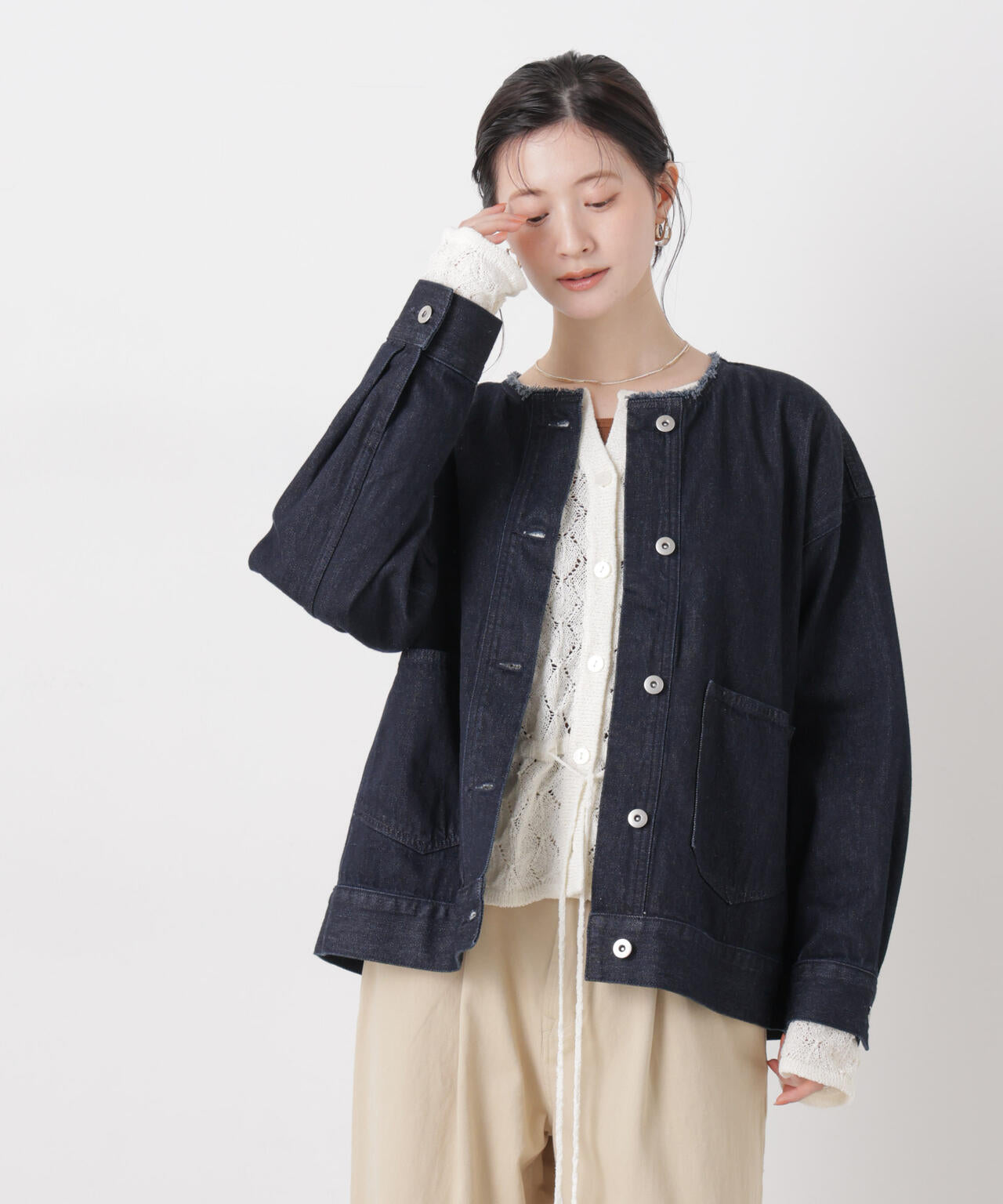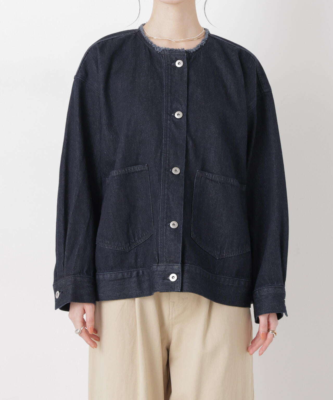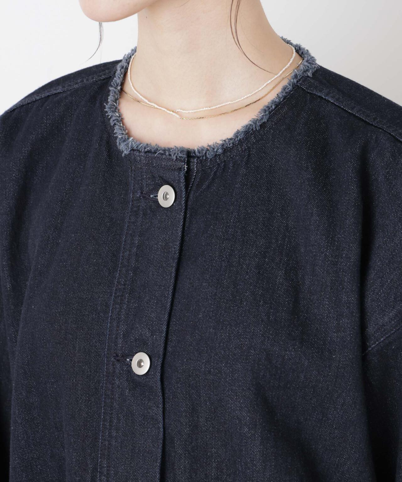 ・首回りがスッキリしたノーカラーのデニムブルゾン