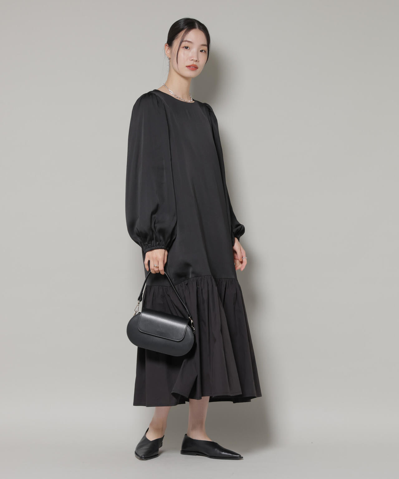 上品な光沢のサテン素材とハリのある素材を組み合わせた、ギャザー切り替えのドッキングワンピース