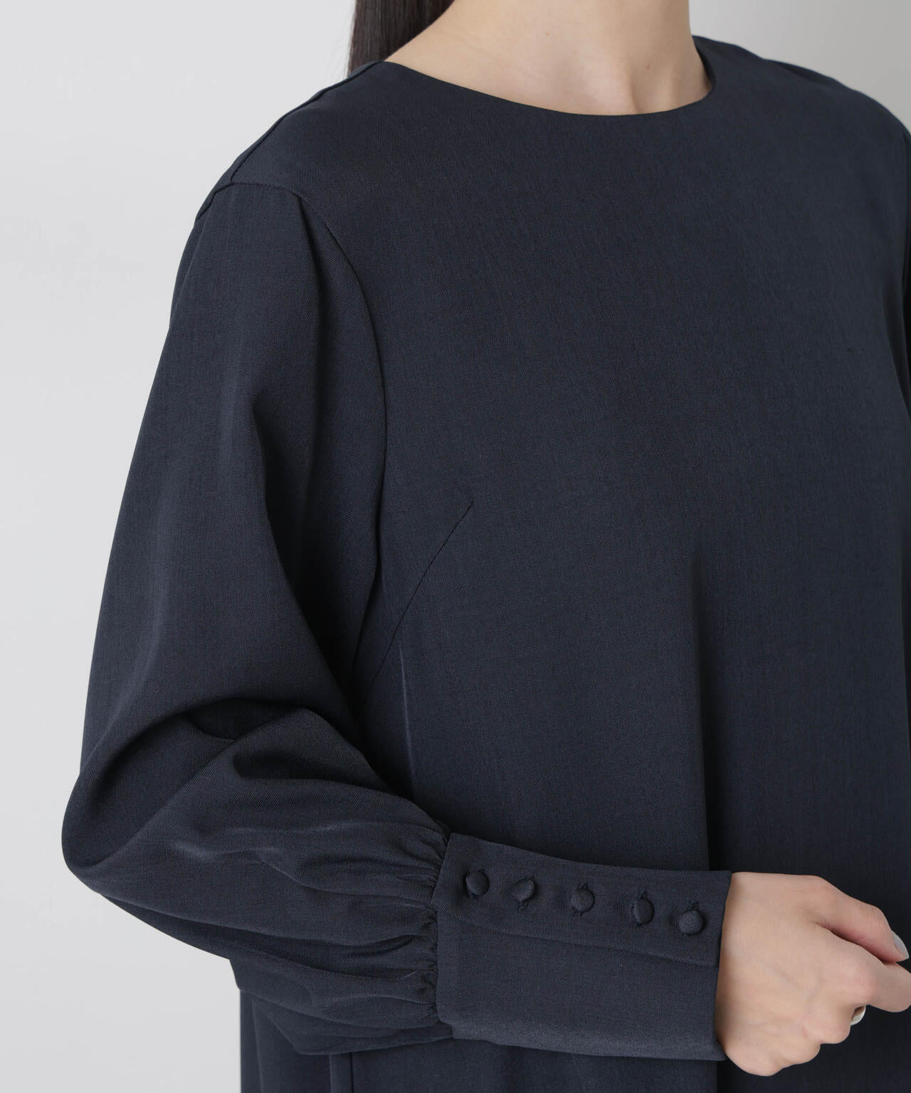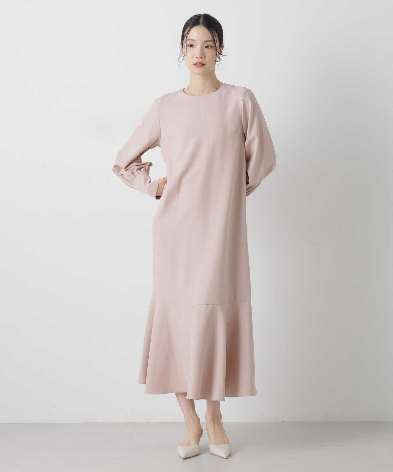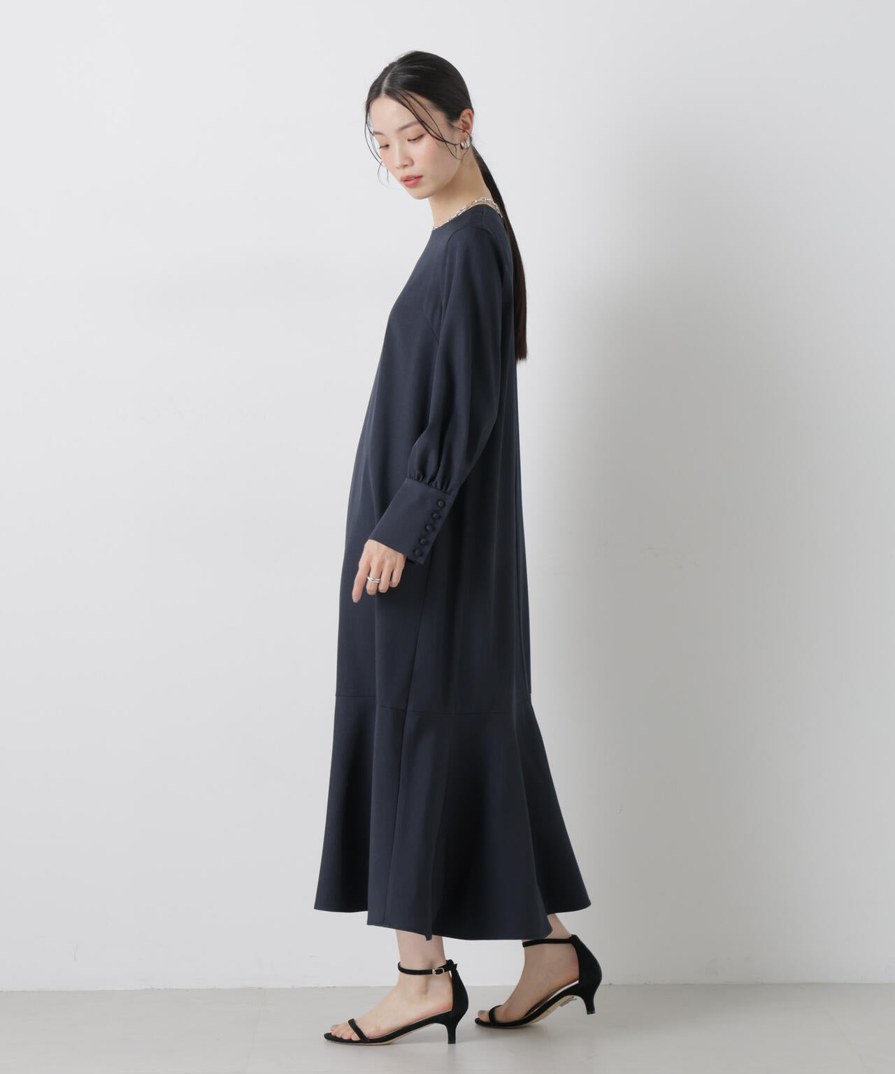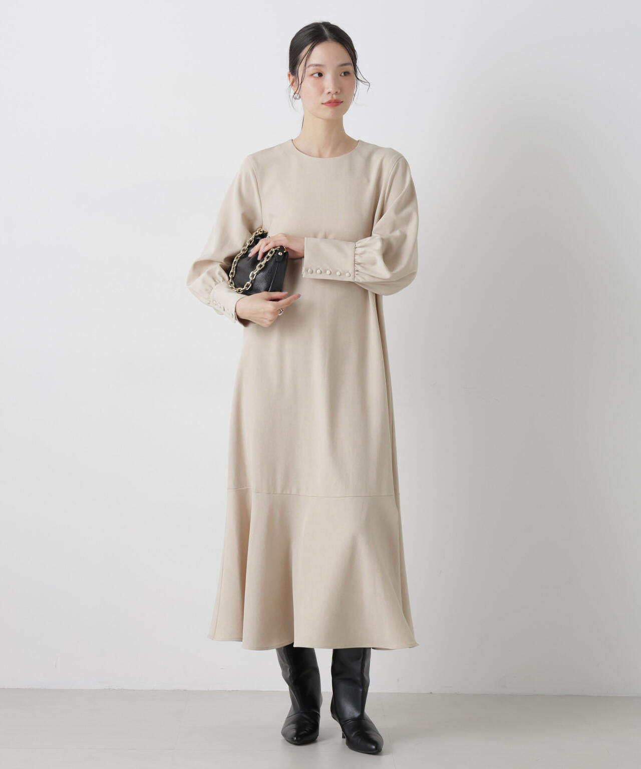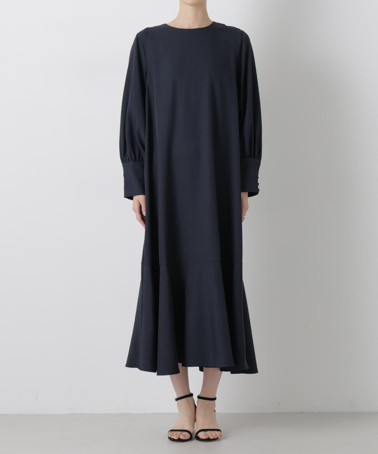 きちんと感とリラクシーな着心地を兼ね備えたロングワンピース。シンプルなデザインの中に、裾から切り替わるフレアデザインや、クルミ釦をあしらった長めの袖カフスなど、ディティールに個性が光る一品です。