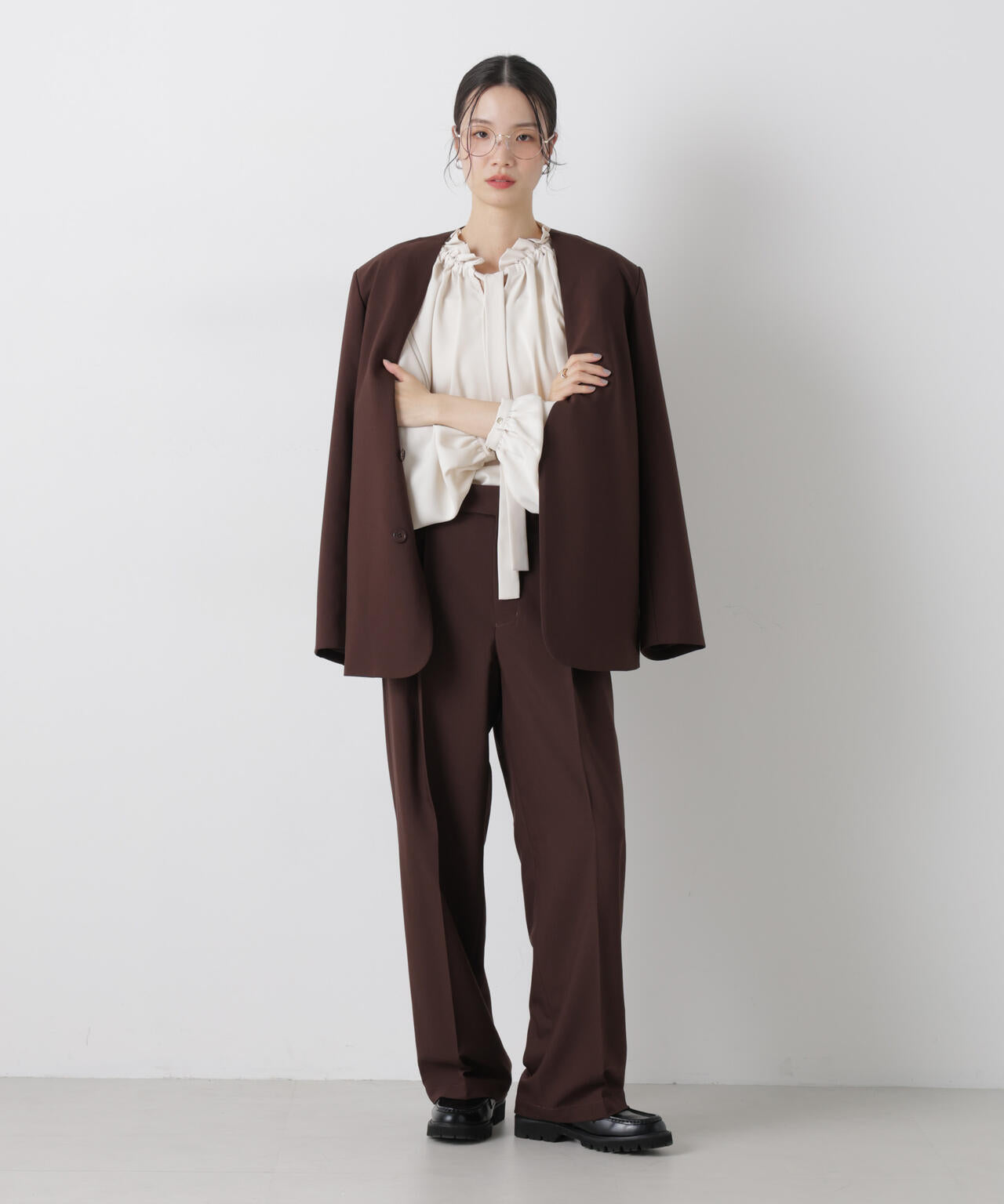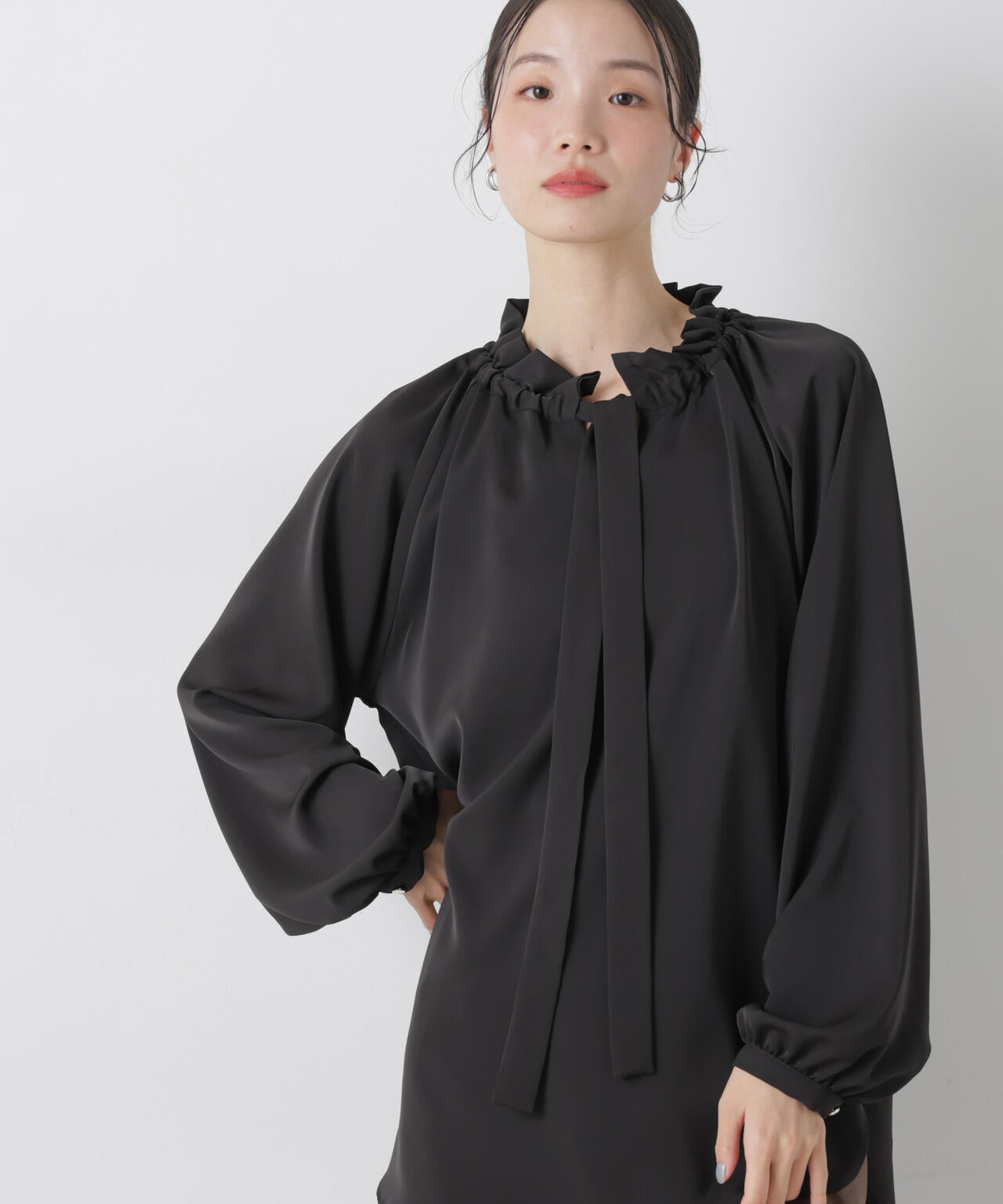 衿元のリボンを結んだり、衿元を開けて異なる印象で着こなしのアレンジを楽しめるデザイン