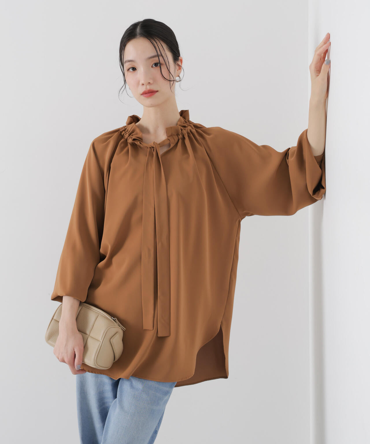 フリルカラーが華やかな印象のボータイブラウス。衿元のリボンを結んだり、衿元を開けて異なる印象で着こなしのアレンジを楽しめるデザイン。上からベストやジャケットなどを重ねてレイヤードコーデや、デニムなどのカジュアルボトムとのスタイリングもおすすめです。