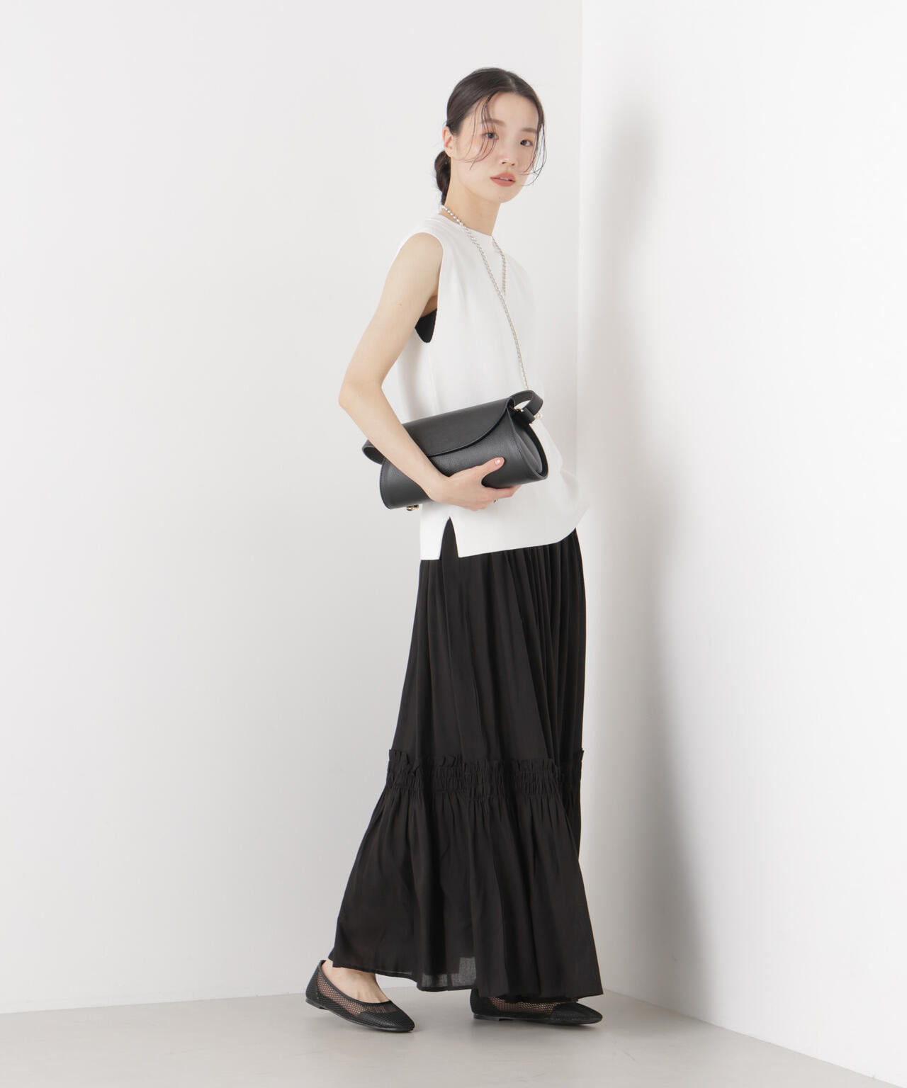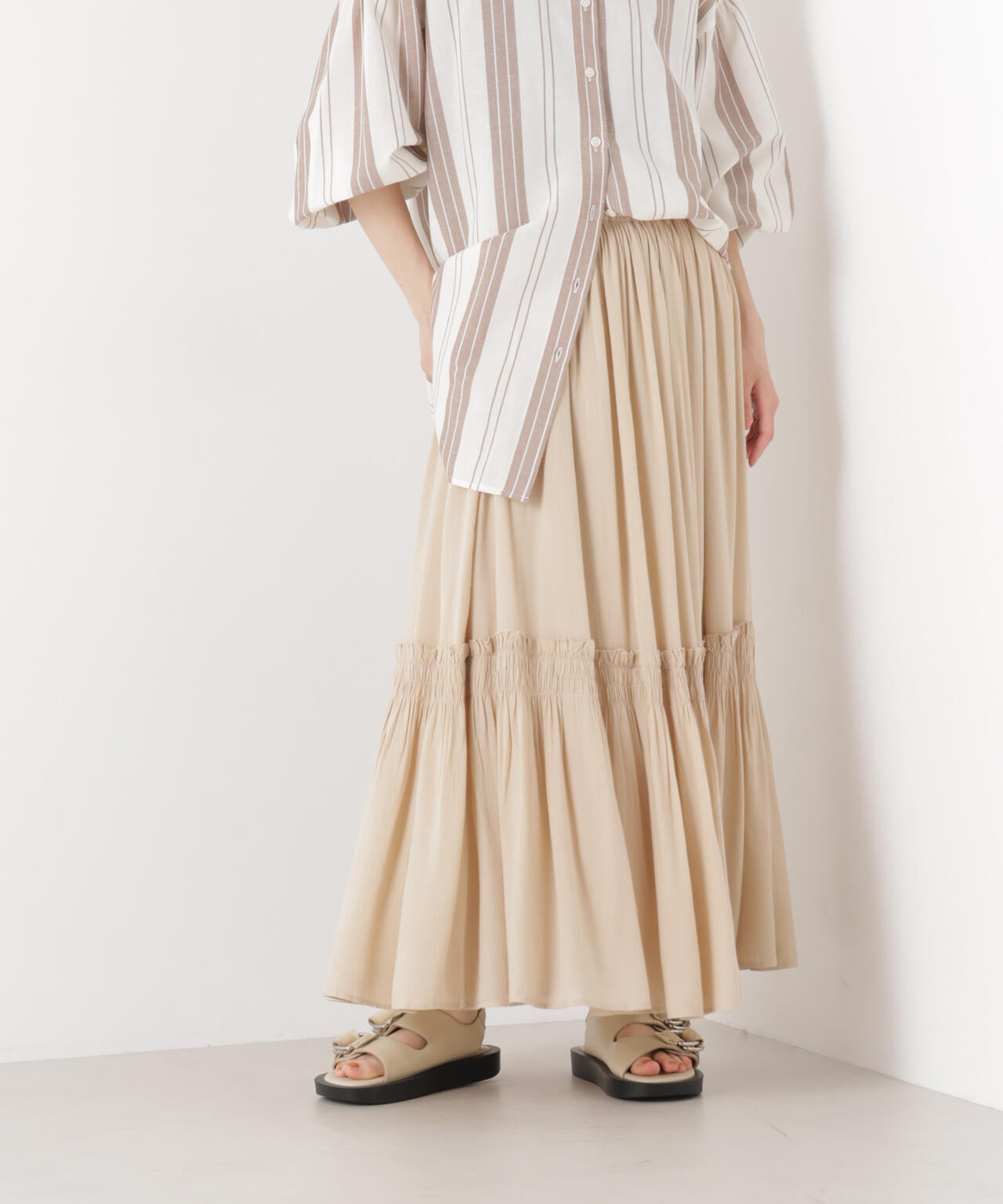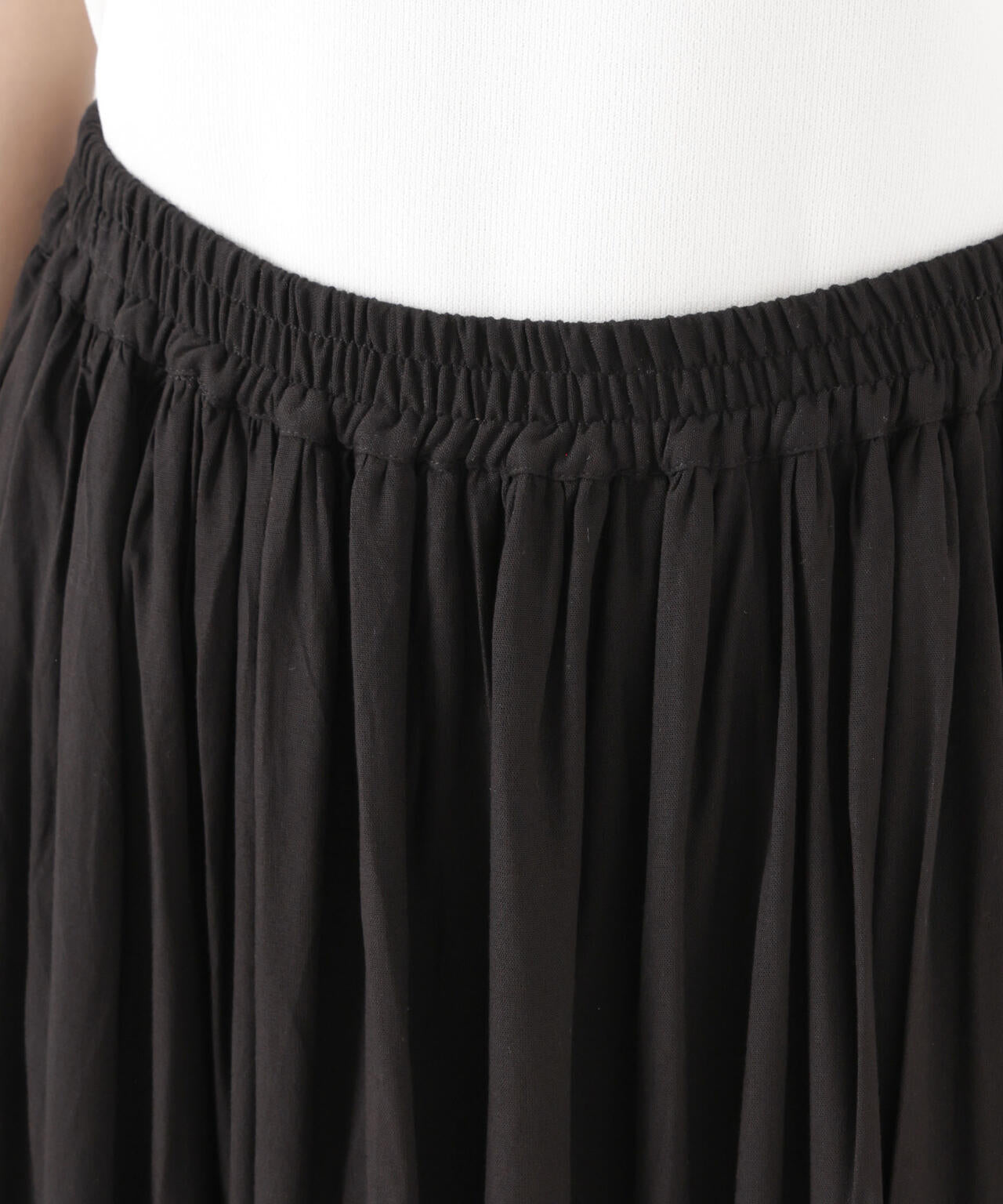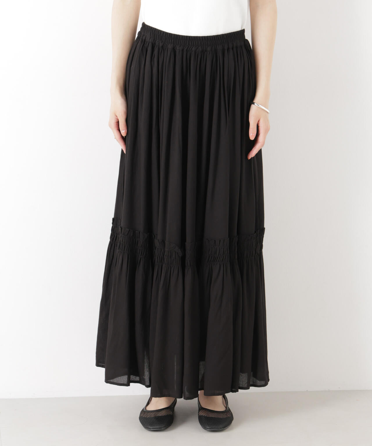 華やかさのある細かいギャザーディティールで切り替えたロングスカート。動くたびに、ふわっと揺れるシルエットが華やかな印象の一着。同素材展開のブラウスとのセットアップスタイルもおすすめです。