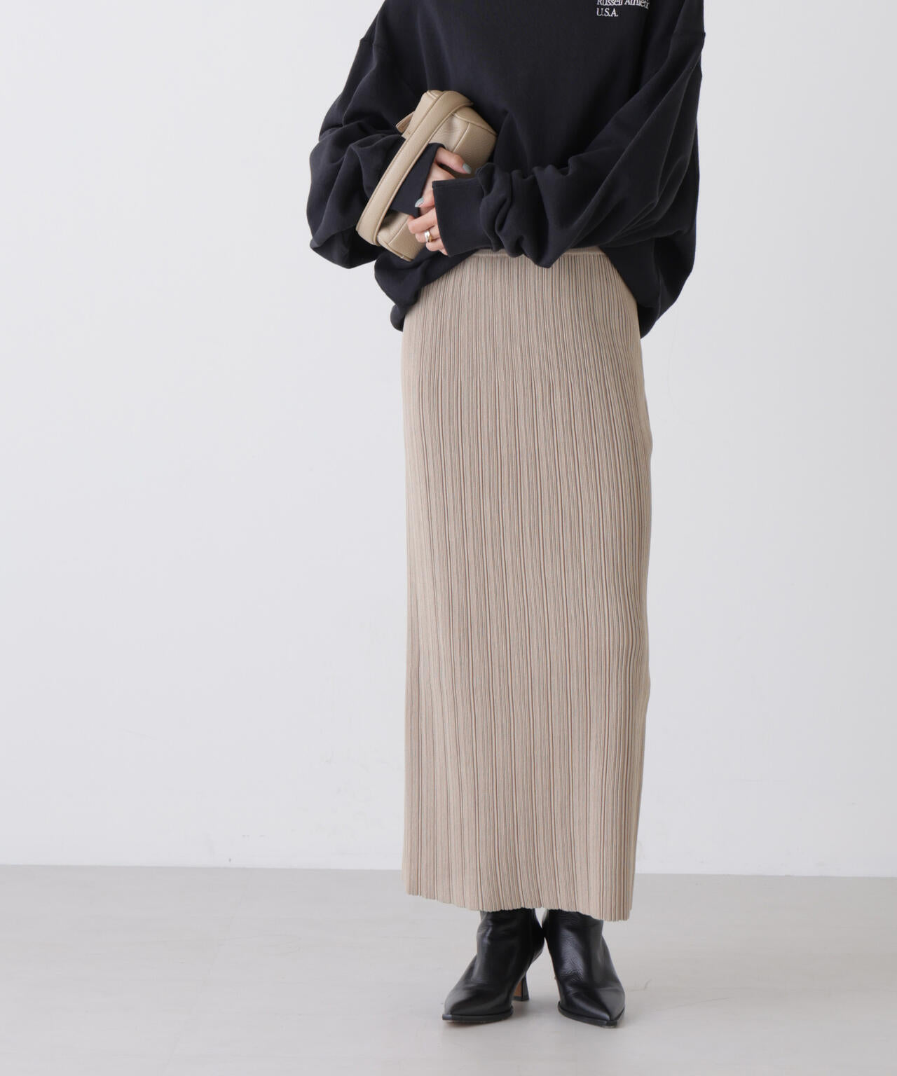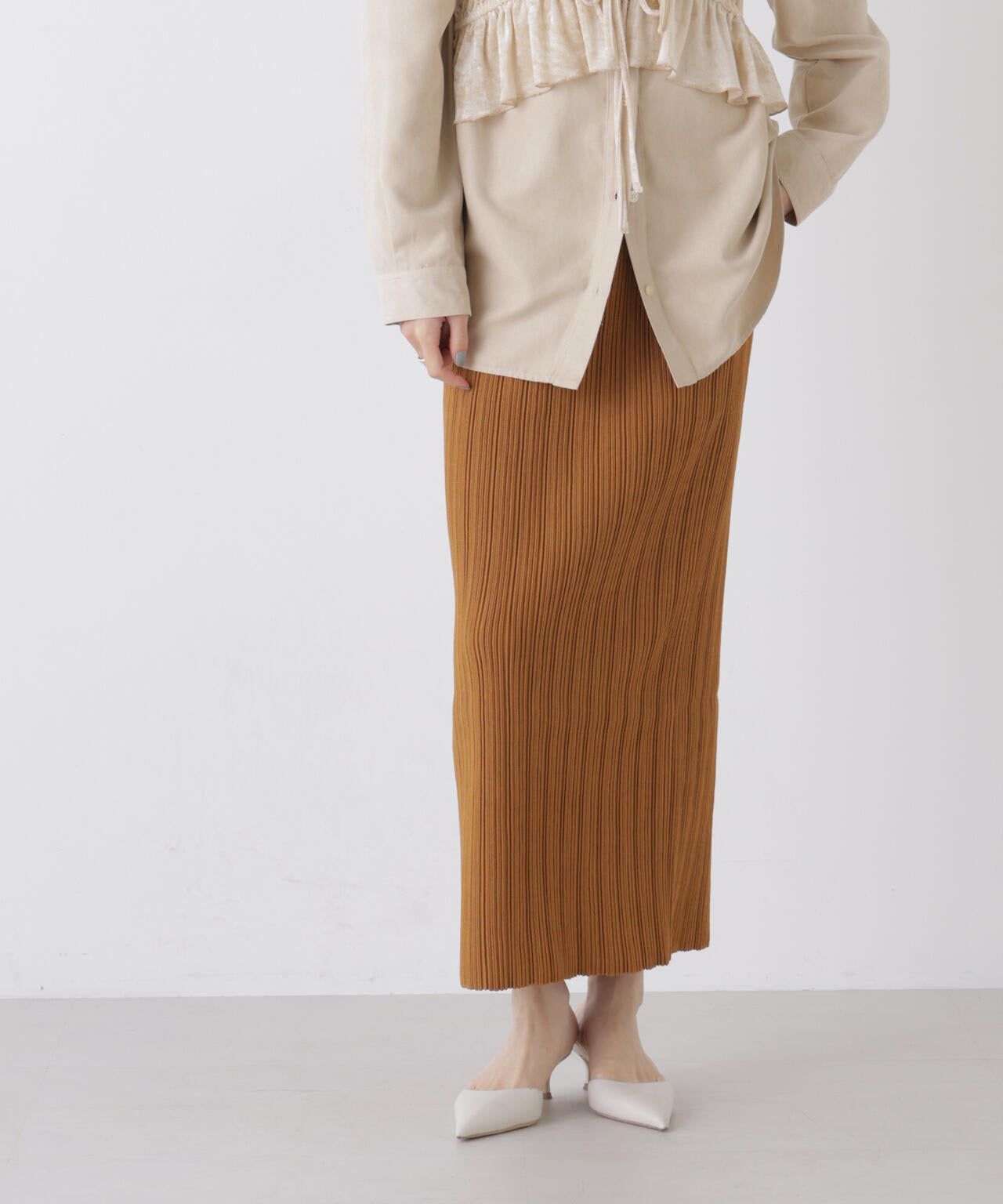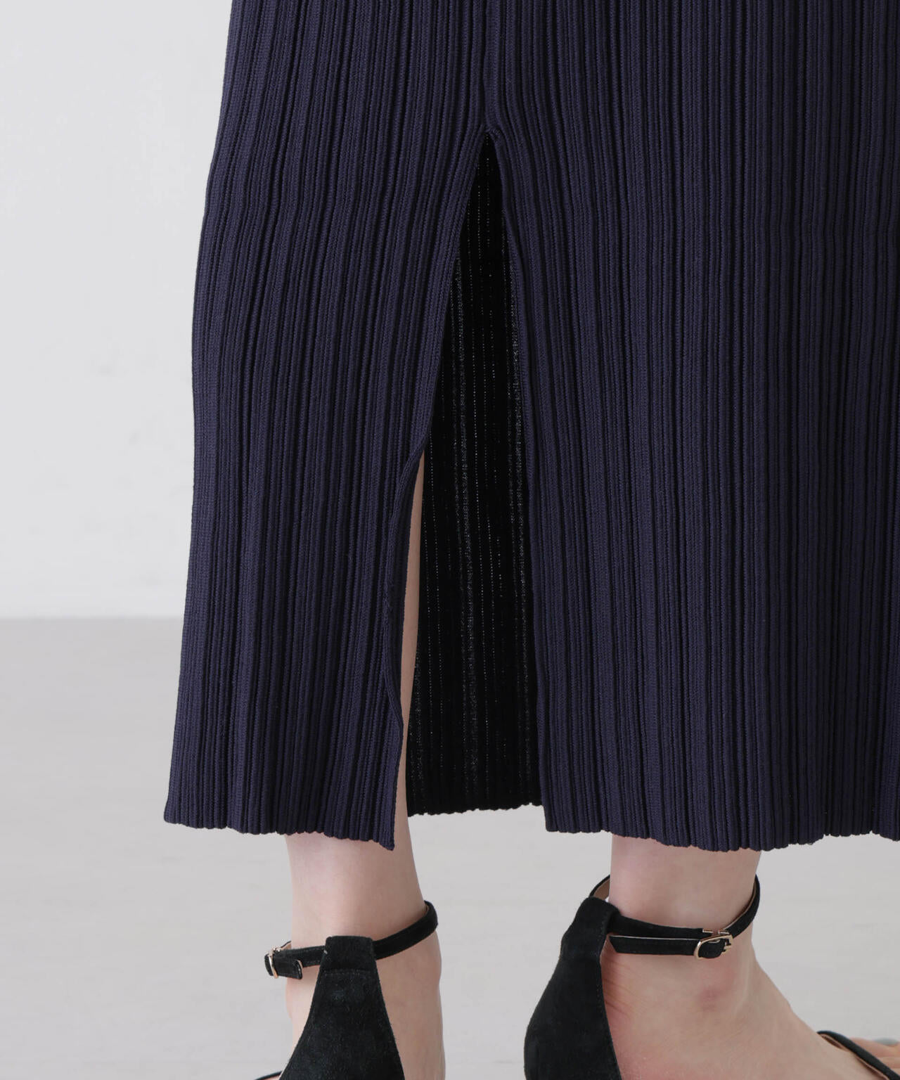 立体的なプリーツリブと、Iラインシルエットが特徴のニットタイトスカート