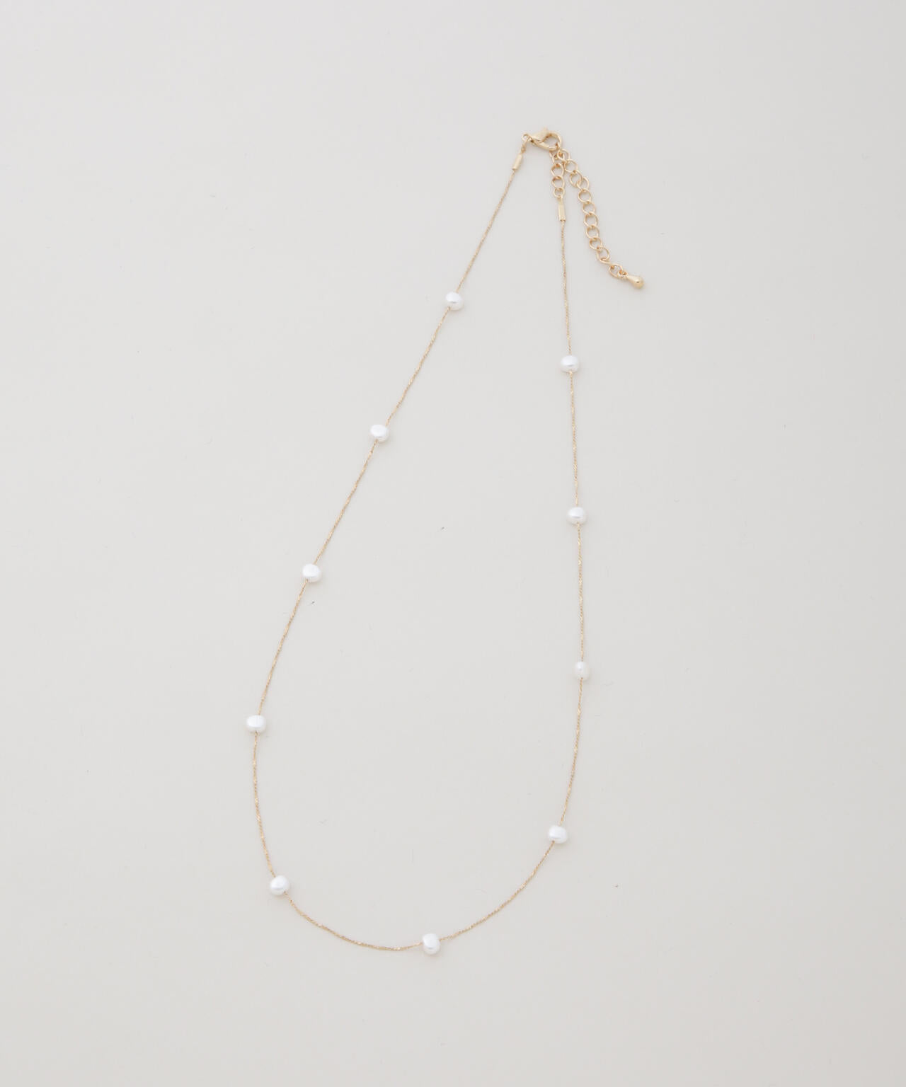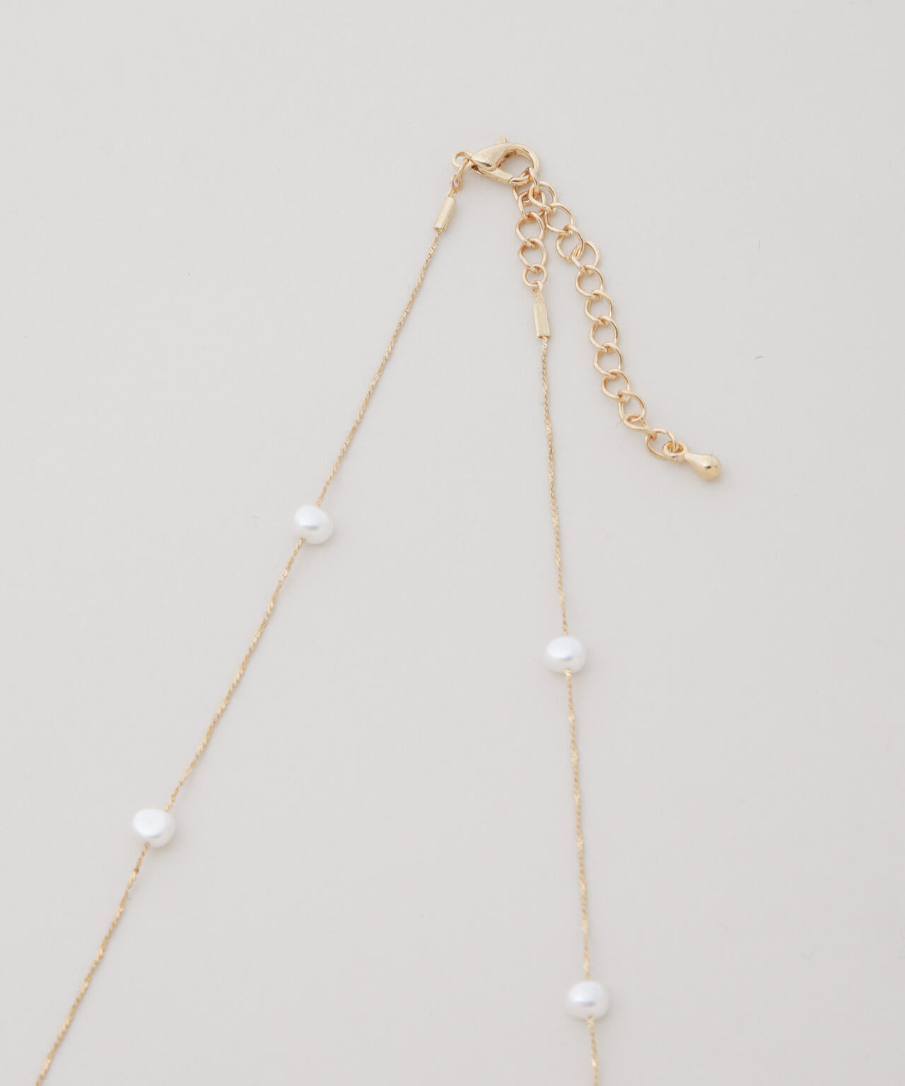 小ぶりのイミテーションパールと、華奢なチェーンのコンビが女性らしく映えるネックレス