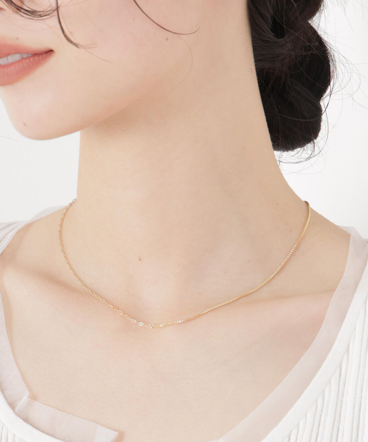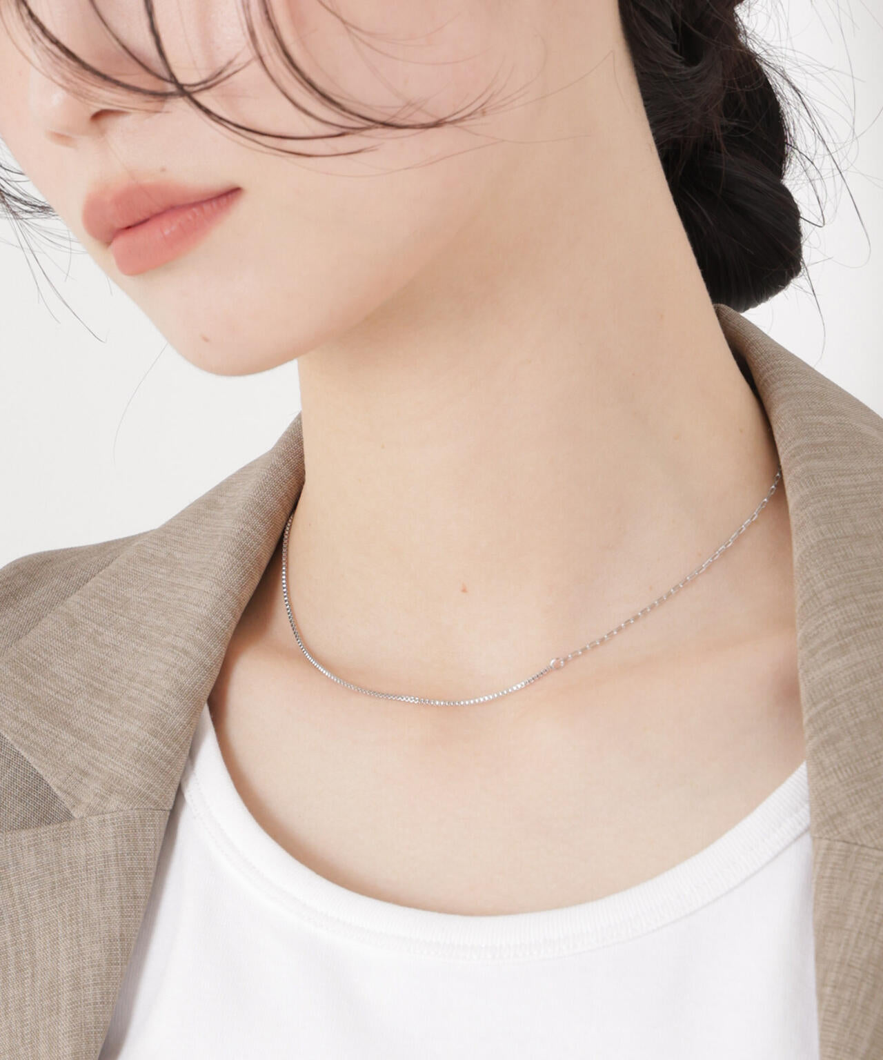 異なるチェーンデザインを組み合わせたシンプルなコンビチェーンネックレス。主張しすぎないミニマルデザインながら、左右で異なるチェーンの輝きの変化がスタイリングのアクセントに。普段使いはもちろん、キレイめやカジュアルスタイルにも合わせやすく、コーディネートのさりげないポイントとして活躍するアイテムです。